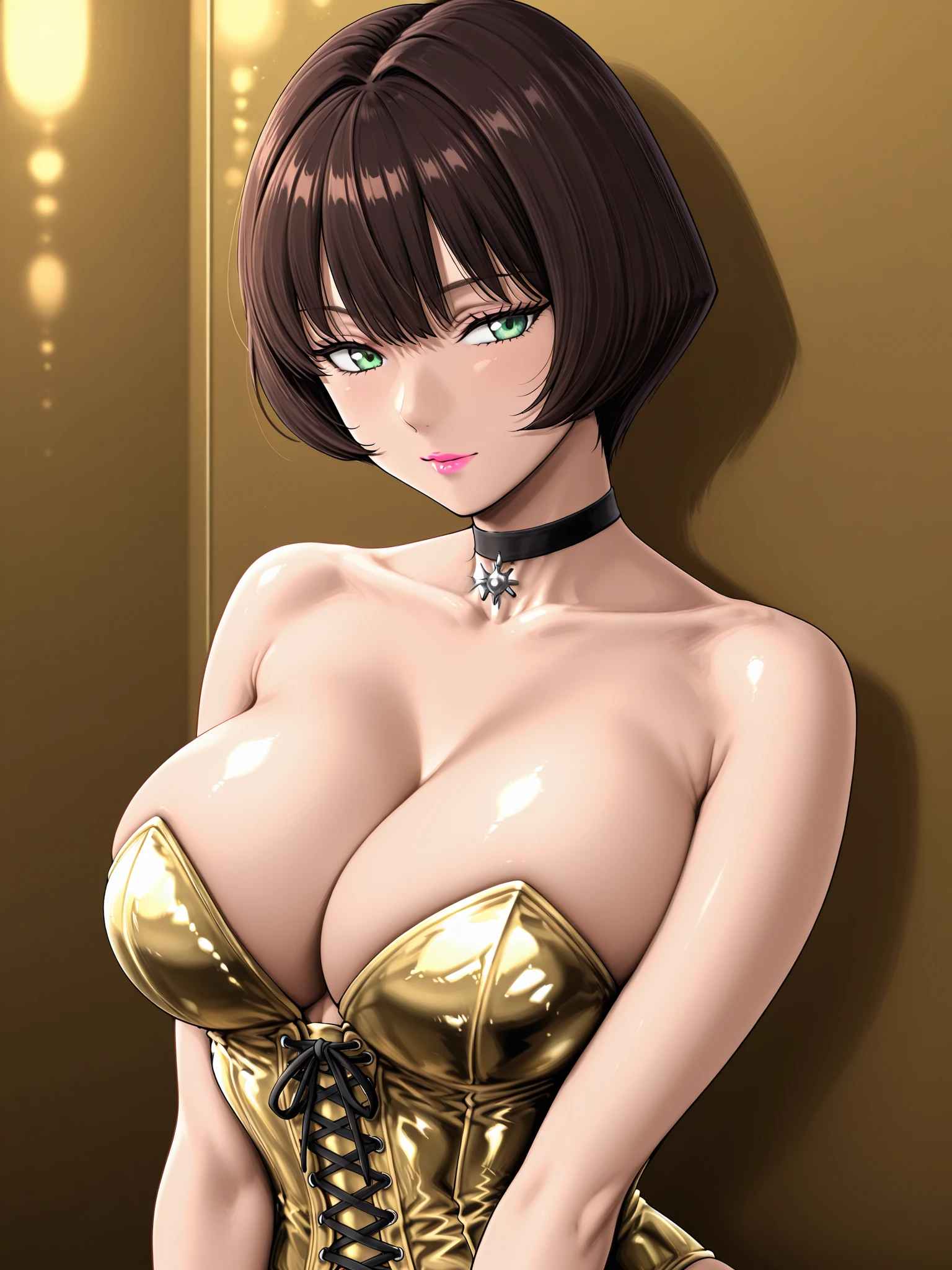 jenny burtory, jenny burtory \(bloody roar 2 lace up corset bodysuit\), 1girl, solo, white skin, collarbone, cleavage, large breasts, dark brown hair, bob cut, green eyes, pink lipstick, sliver ring, red nails, black choker, gold lace up corset bodysuit, strapless, dark gold strappy high heels