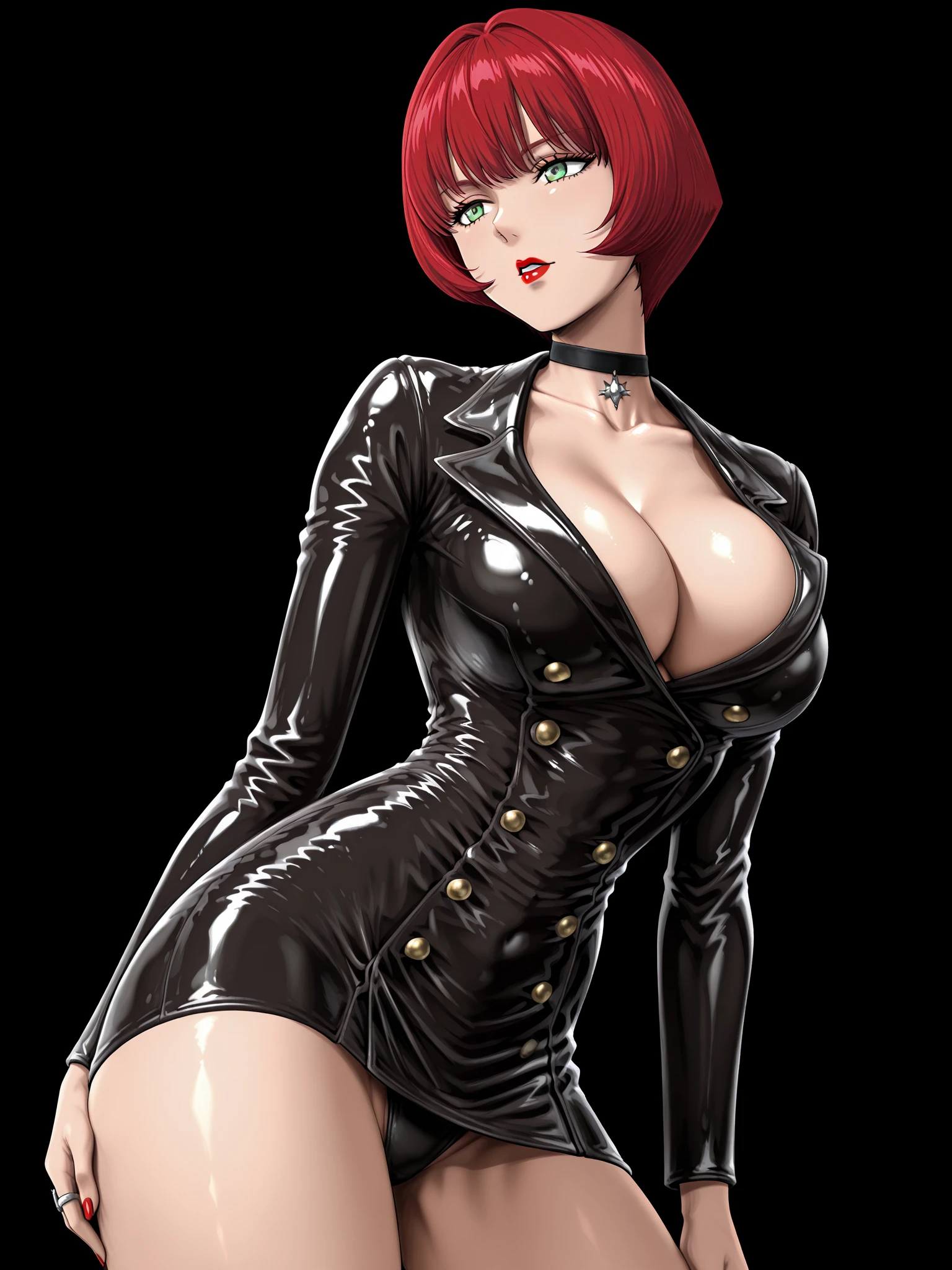 jenny burtory, jenny burtory \(bloody roar 2 leather blazer dress\), 1girl, solo, white skin, collarbone, cleavage, large breasts, red hair, bob cut, green eyes, red lipstick, sliver ring, red nails, black choker, black leather blazer dress, ten gold buttons, black high heels