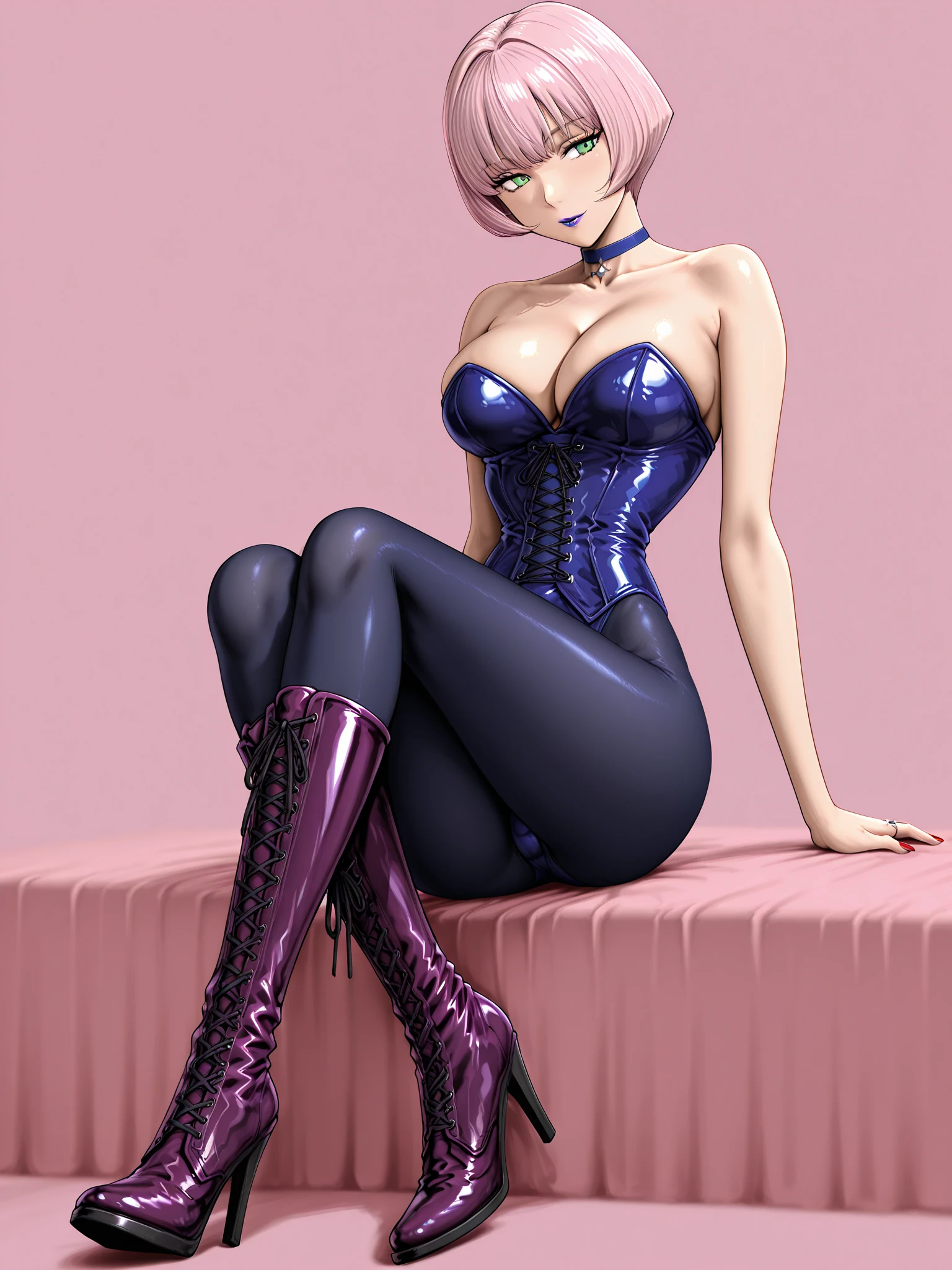 jenny burtory, jenny burtory \(bloody roar 2 lace up corset bodysuit\), 1girl, solo, white skin, collarbone, cleavage, large breasts, pale pink hair, bob cut, green eyes, lavender lipstick, sliver ring, red nails, navy choker, navy lace up corset bodysuit, strapless, navy pantyhose, lavender knee high-heeled boots