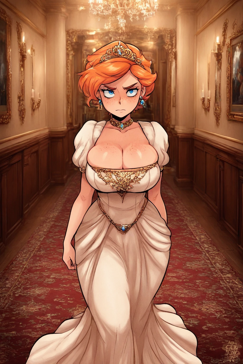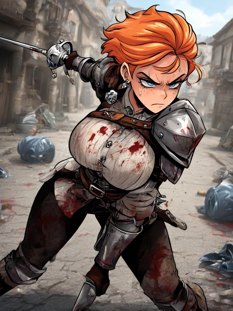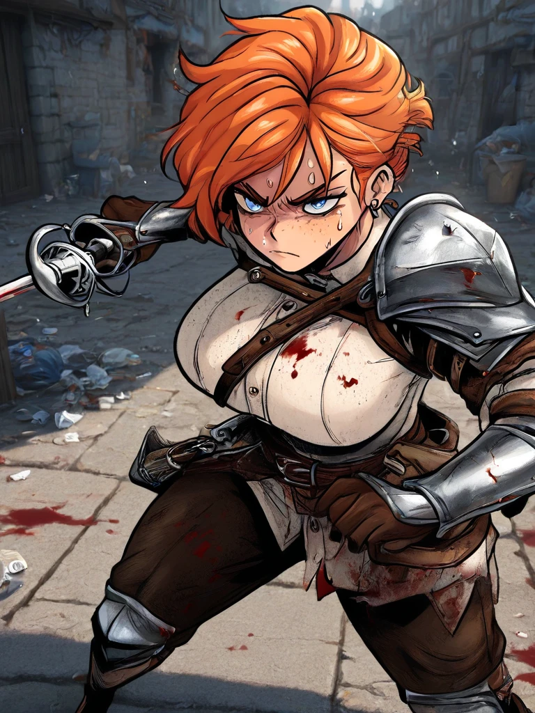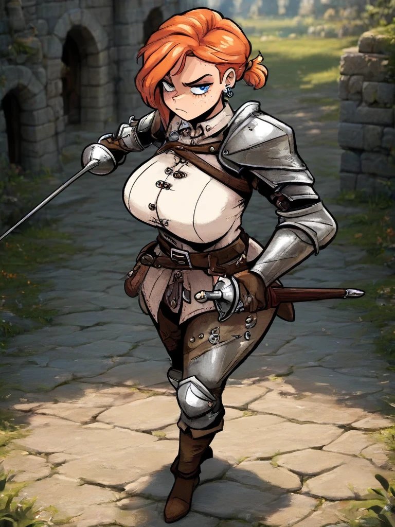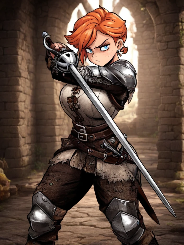 CecilyRPG, 1girl, solo, freckles, orange hair, blue eyes, armor, belt, short hair, earrings, shoulder armor, , jewelry,