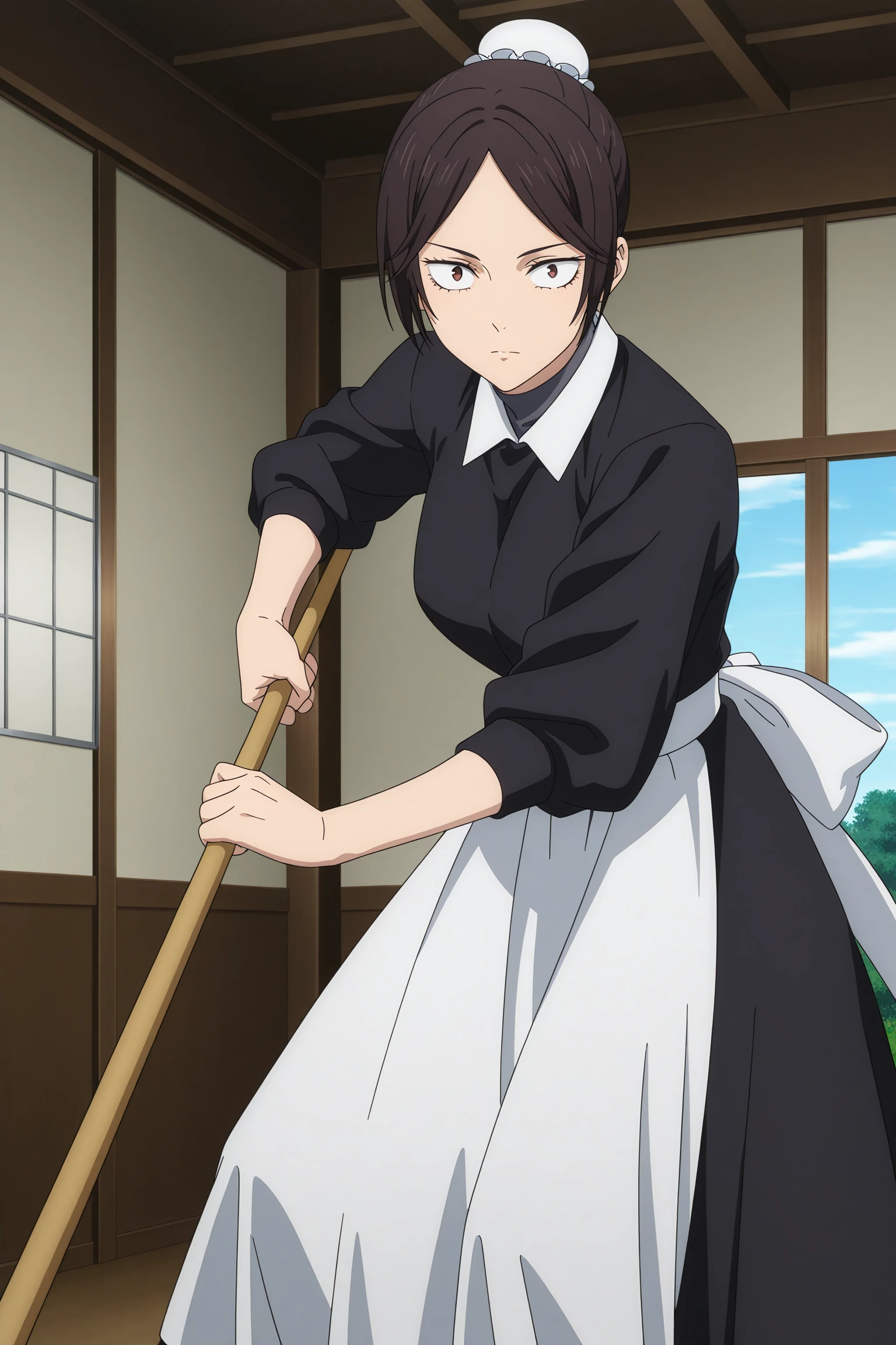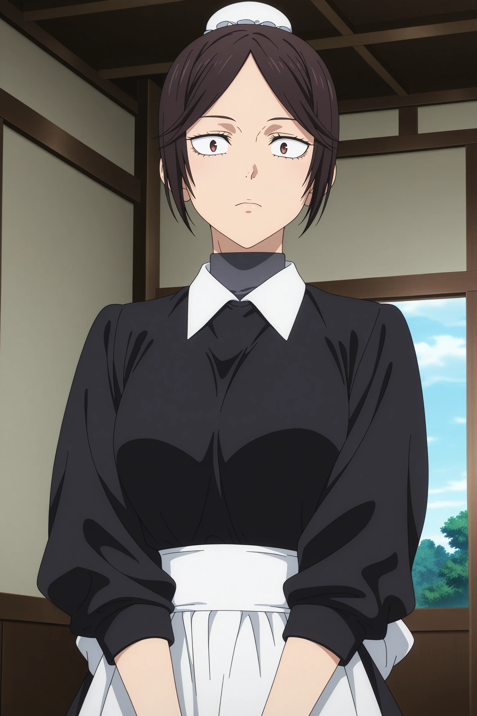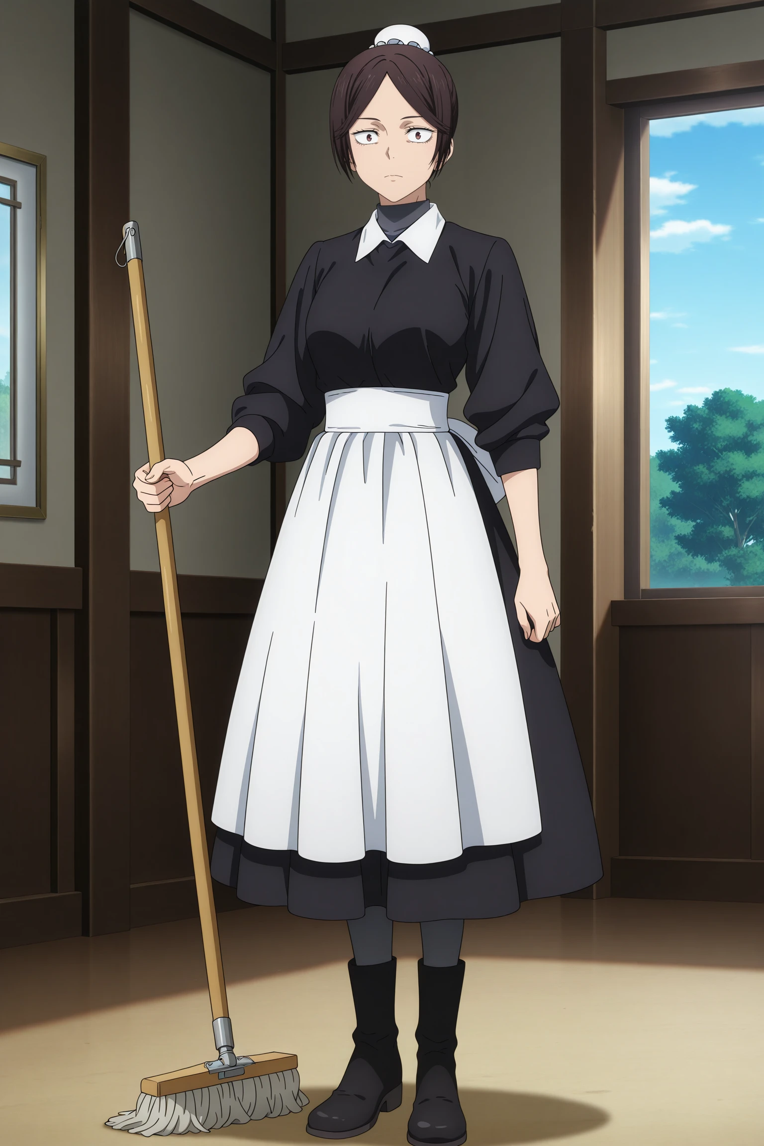 kuroi misato, short hair, brown hair, hair bun, bun cover, parted bangs, sidelocks, brown eyes, slit pupils, constricted pupils, maid, three-quarter sleeves, black dress, grey shirt, turtleneck, white apron, wrist apron, back bow, grey pantyhose, black footwear, boots