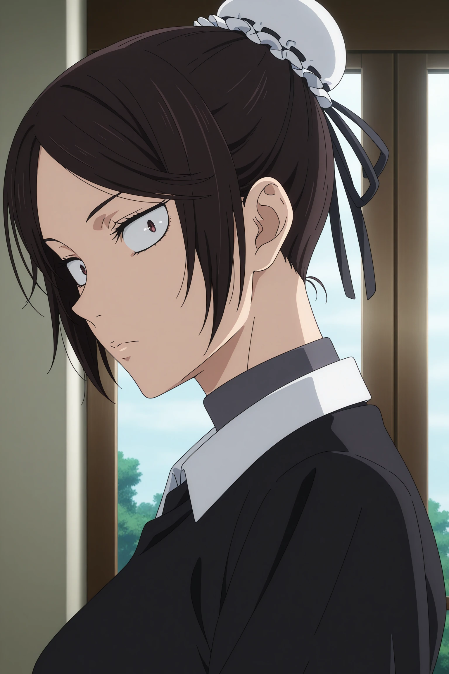 kuroi misato, short hair, brown hair, hair bun, bun cover, parted bangs, sidelocks, brown eyes, slit pupils, constricted pupils, maid, three-quarter sleeves, black dress, grey shirt, turtleneck, white apron, wrist apron, back bow, grey pantyhose, black footwear, bootsSwimsuit