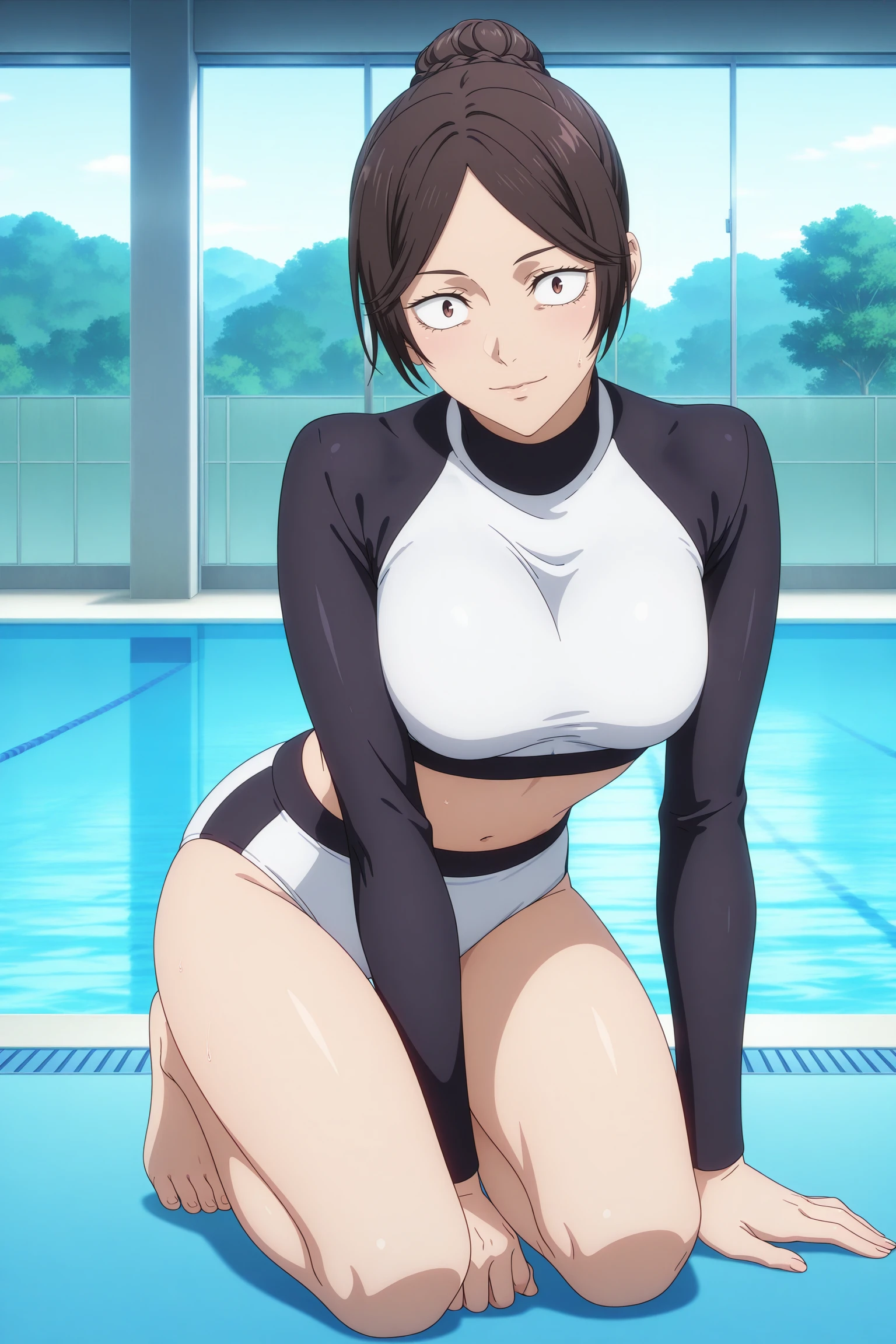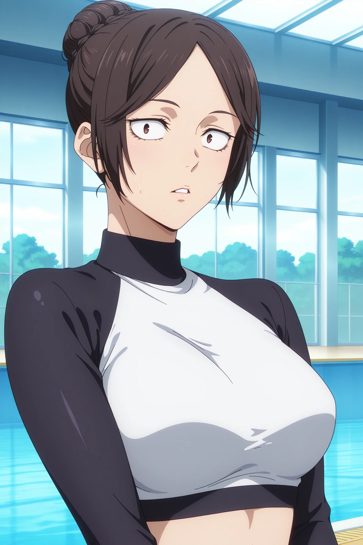 kuroi misato, short hair, brown hair, hair bun, bun with braided base, parted bangs, sidelocks, brown eyes, slit pupils, constricted pupils, long sleeves, rash guard, crop top, raglan sleeves, white burumaDescription