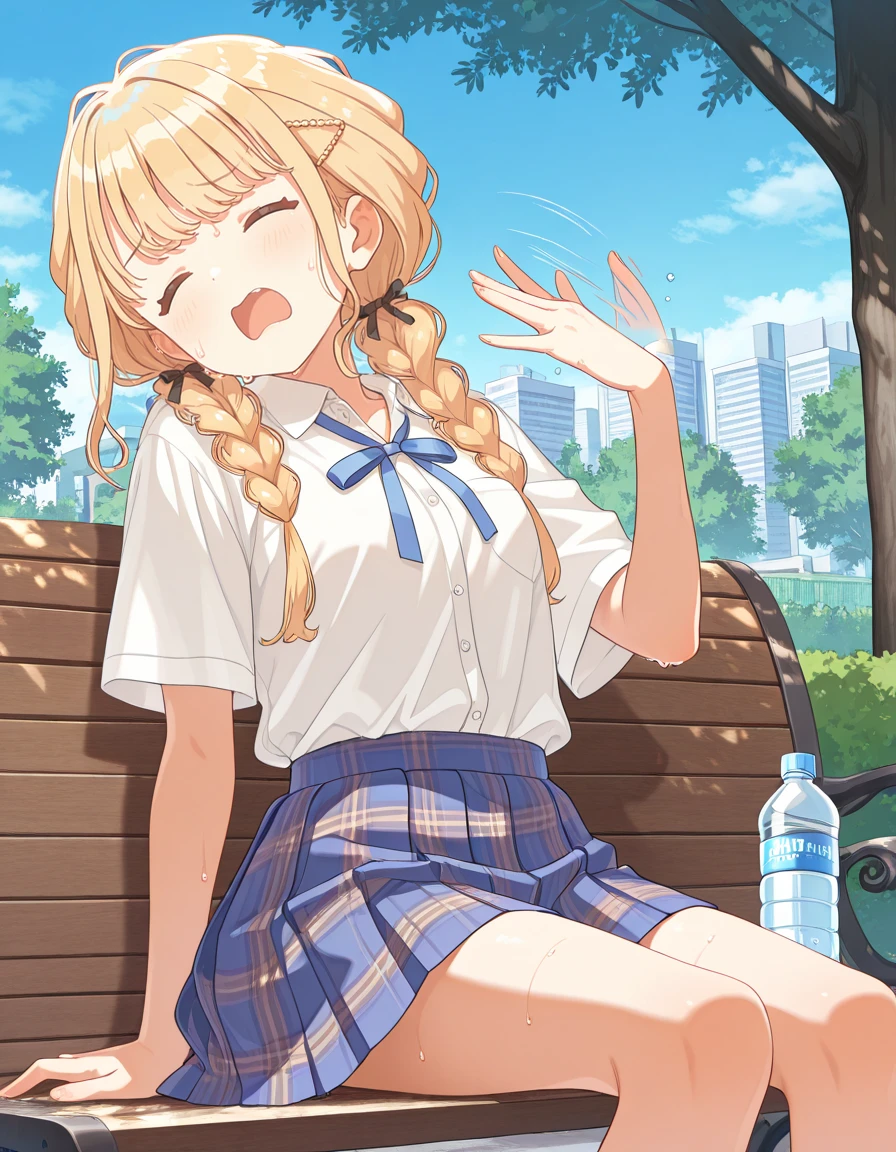 school uniform, white collared shirt, blue neck ribbon, short sleeves, shirt tucked in, pleated skirt, blue plaid skirt, white socks, brown loafers