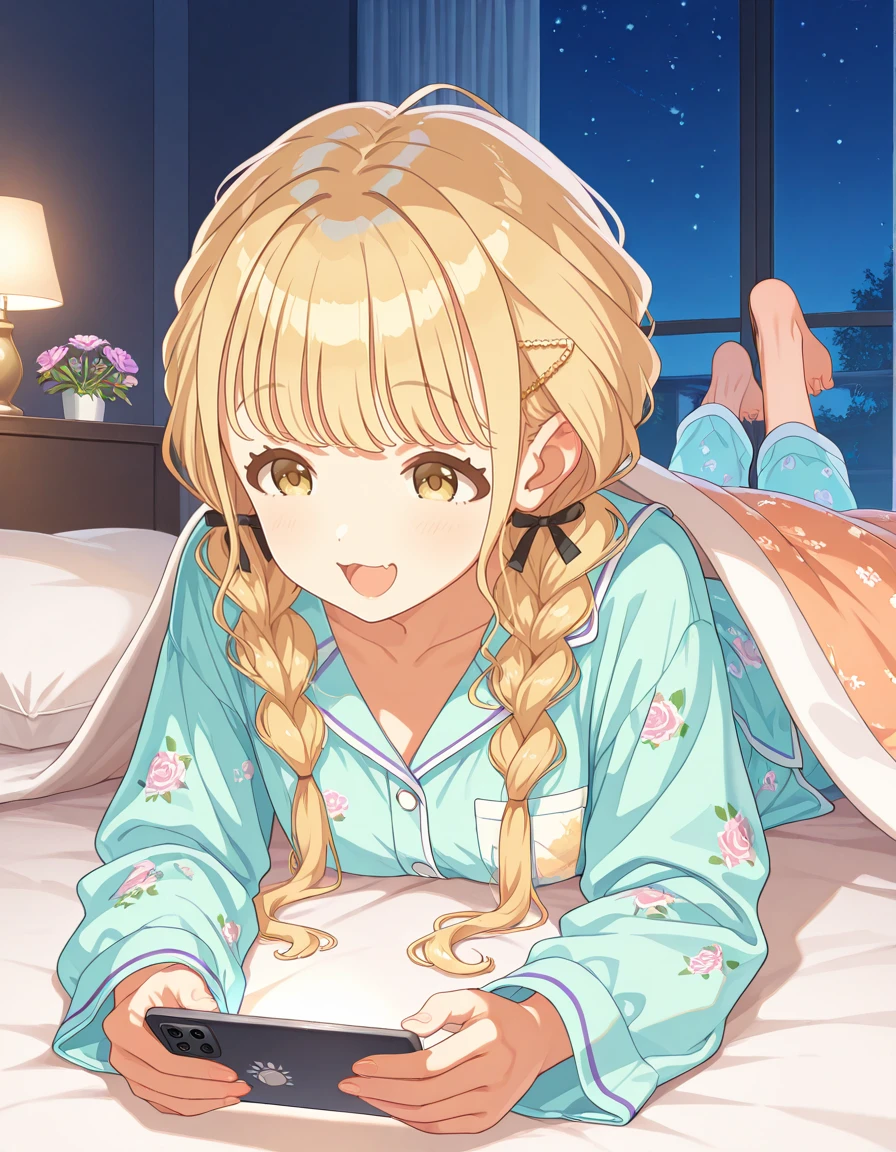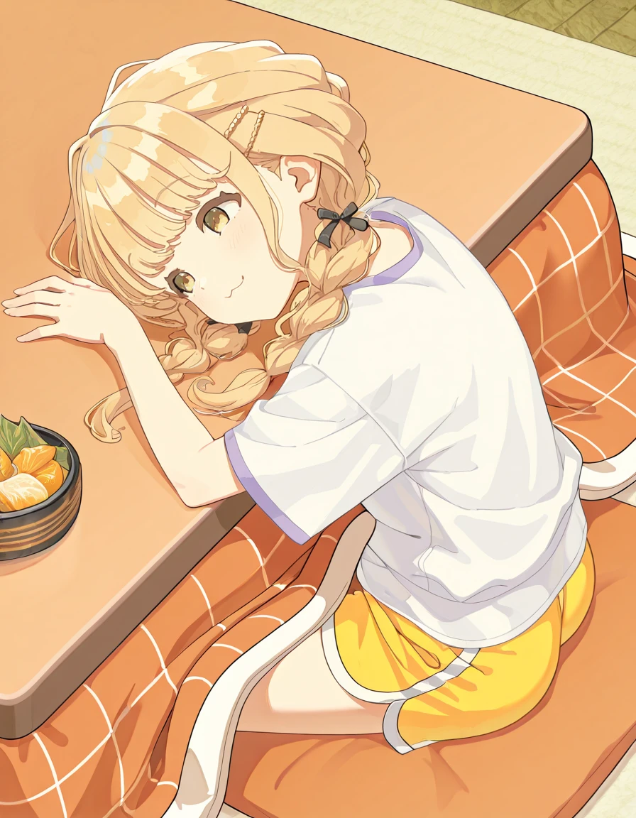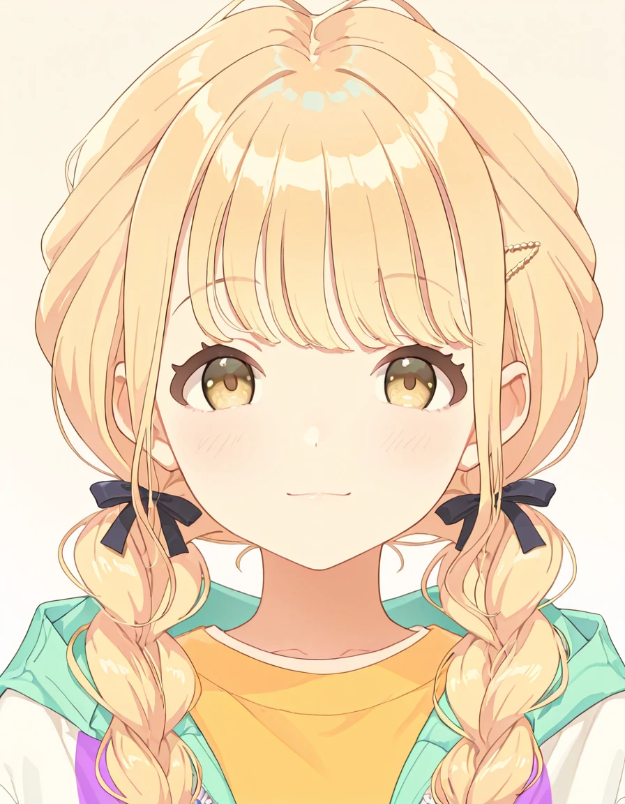 <lora:kotone_fujita-idolmaster_gakuen-ixl-game-soralz:1>, kotone fujita (idolmaster gakuen), long hair, blonde hair, twin braids, hair ribbon, hairclip, yellow eyes