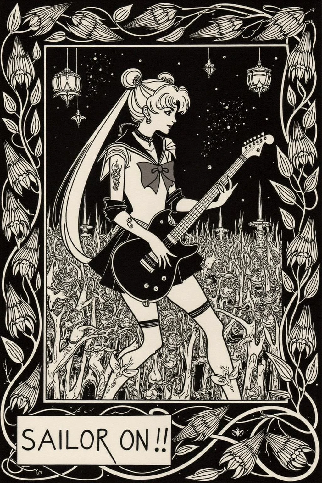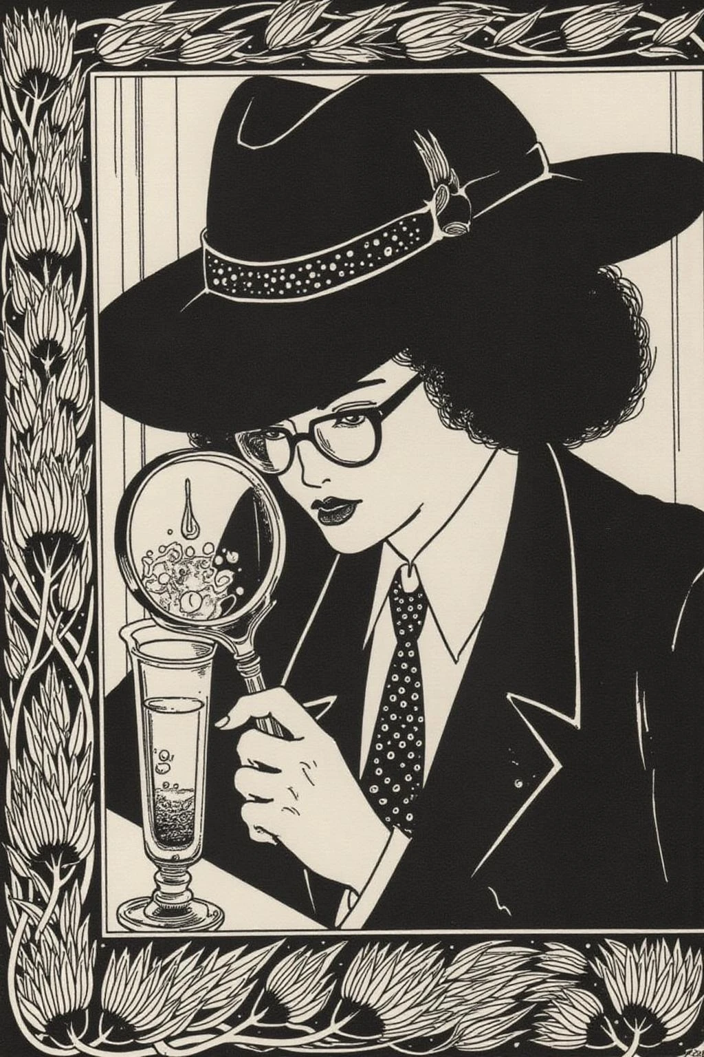The drawings were heavily ?????? and grotesque, featuring androgynous figures, elongated forms, and elaborate patterns.