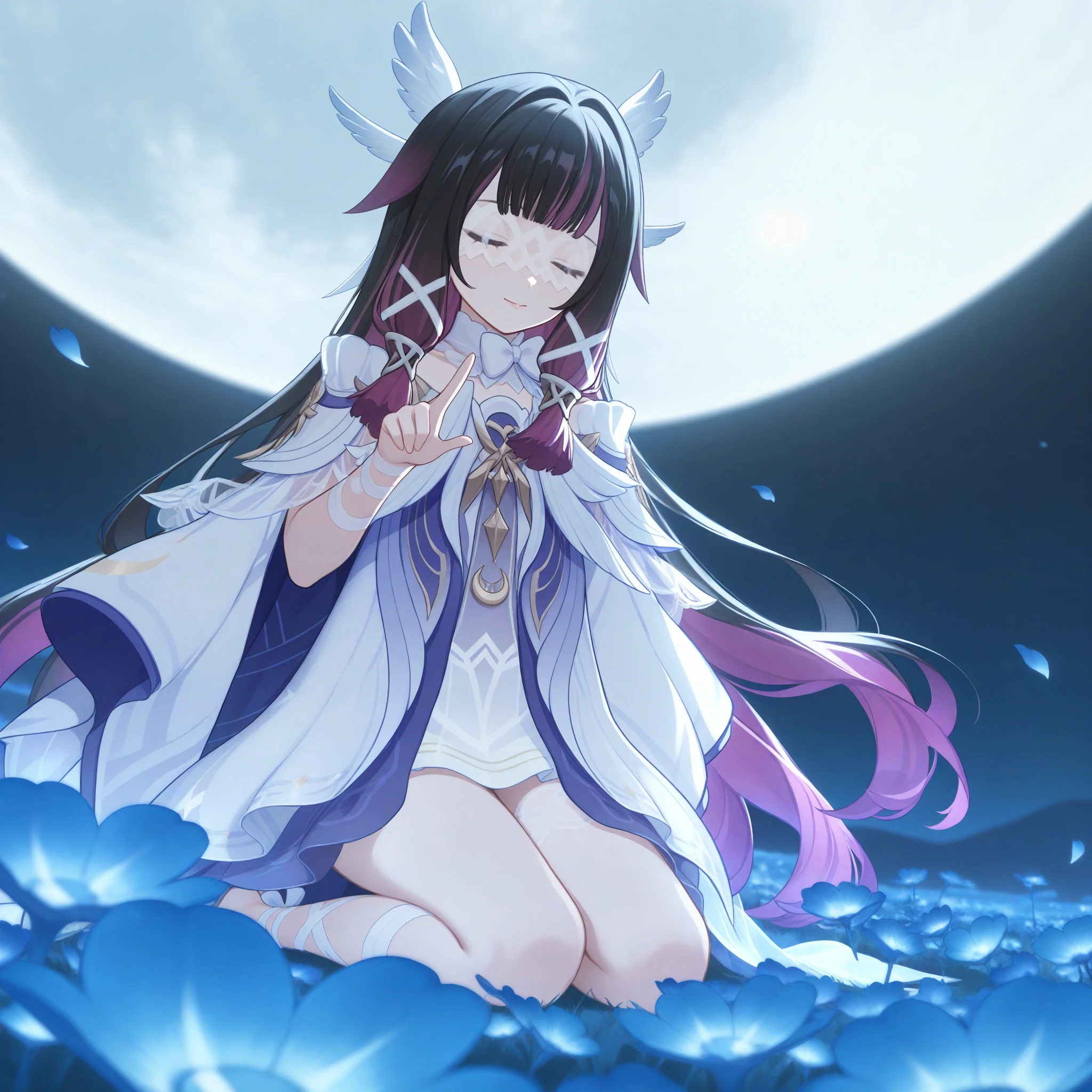 Columbina \(genshin impact\),closed eyes,eye mask,x hair ornament,wing hair ornament,head wings,hair ribbon,white ribbon,服装 (outfit)