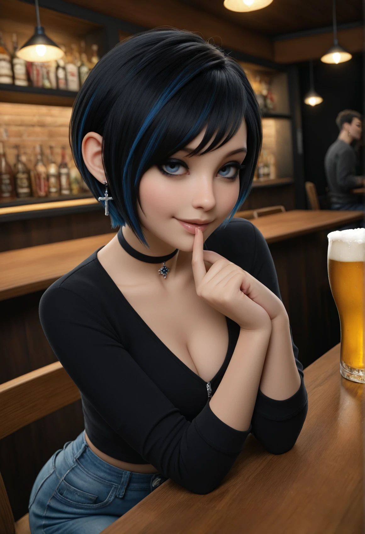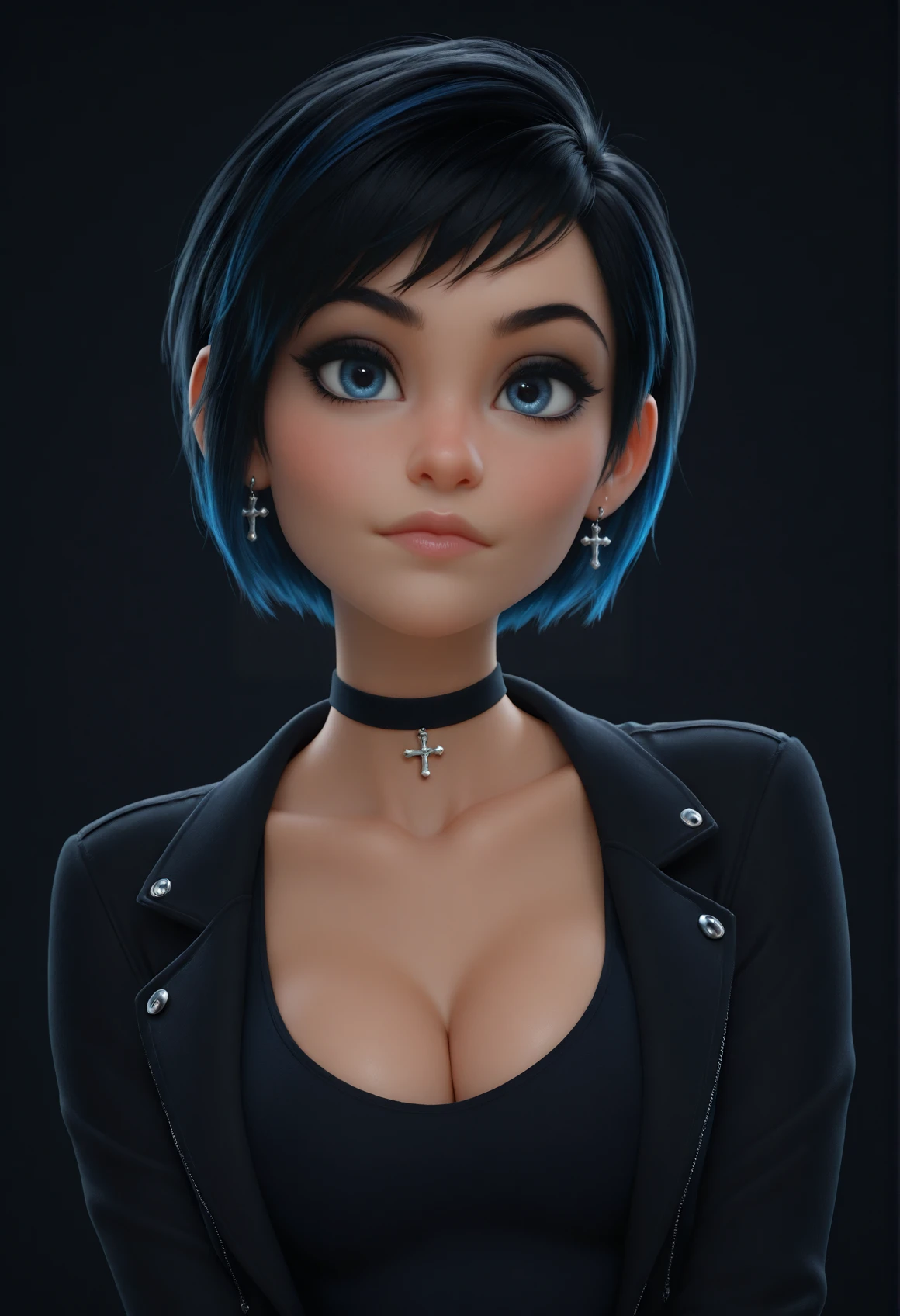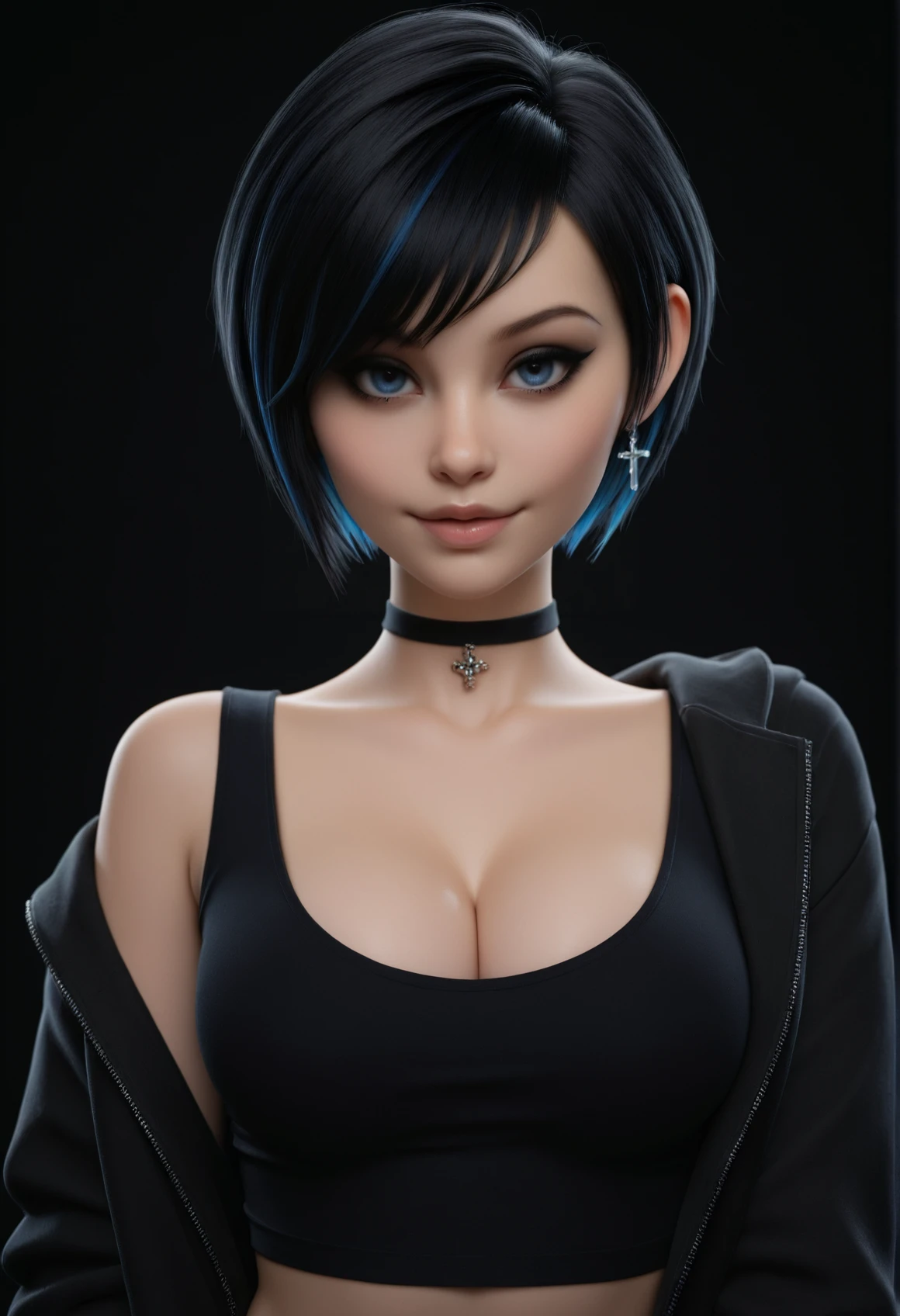 LaraCute, blue eyes, short hair, black hair, blue highlights