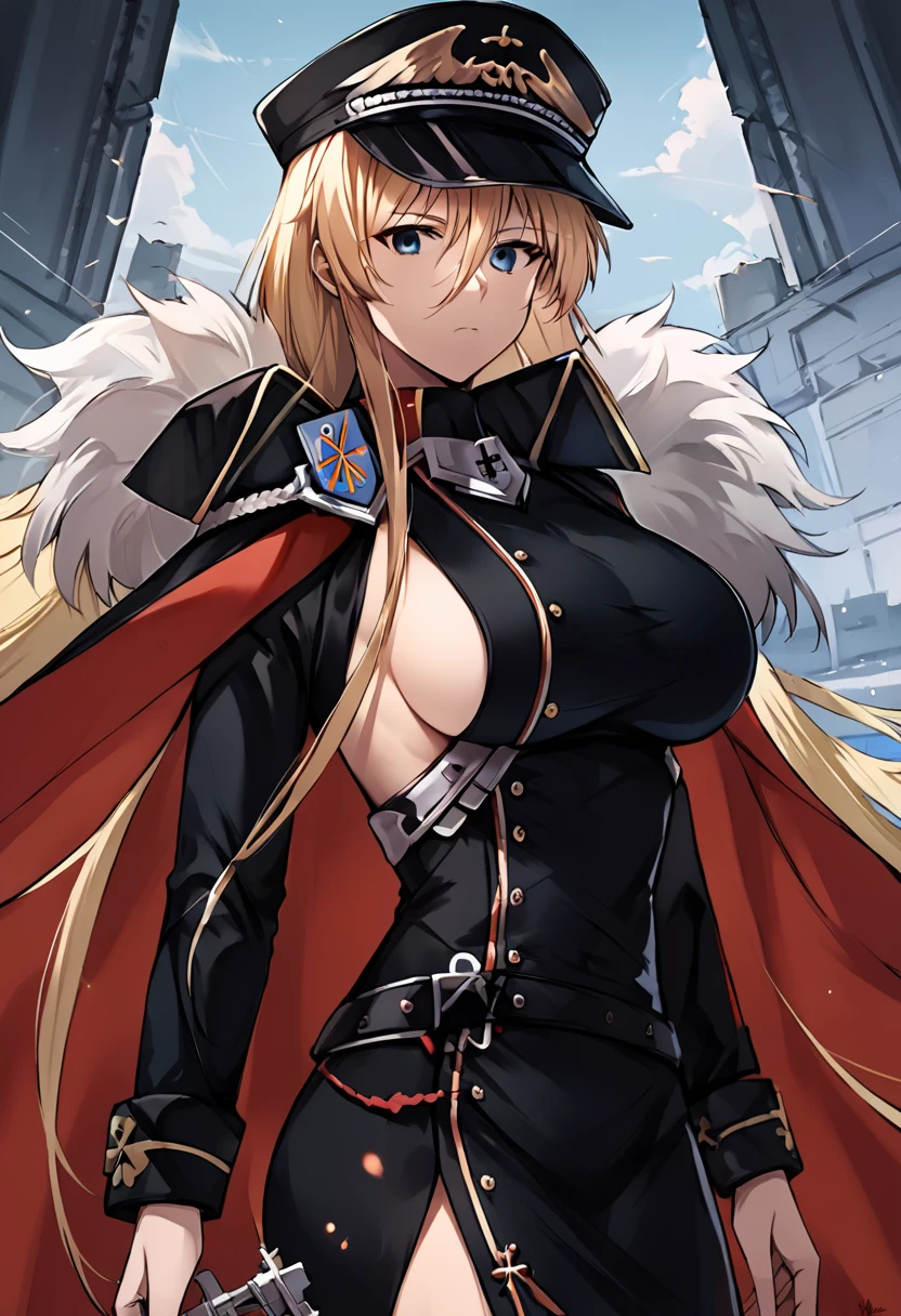 bzw, 1girl, bismarckzweia, solo, long hair, breasts, l blue eyes, blonde hair, large breasts, krs_hat, hair between eyes, upper body, krsw_uniform, cape, coat, fur trim, military, sideboob,