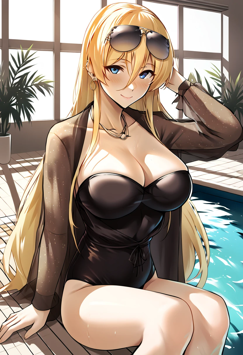 bzwb, 1girl, bismarkzweib, solo, long hair, breasts, bangs, blue eyes, blonde hair, large breasts, long sleeves, cleavage, hair between eyes, jewelry, very long hair, closed mouth, collarbone, brk_swimsuit, sidelocks, earrings, open clothes, necklace, see-through, strapless, sunglasses, straight hair, eyewear on head,
