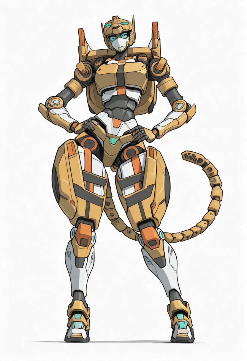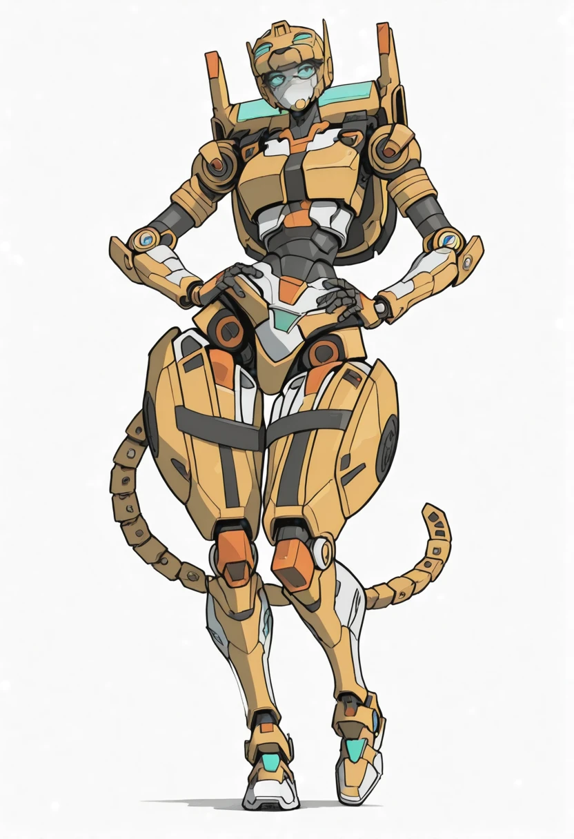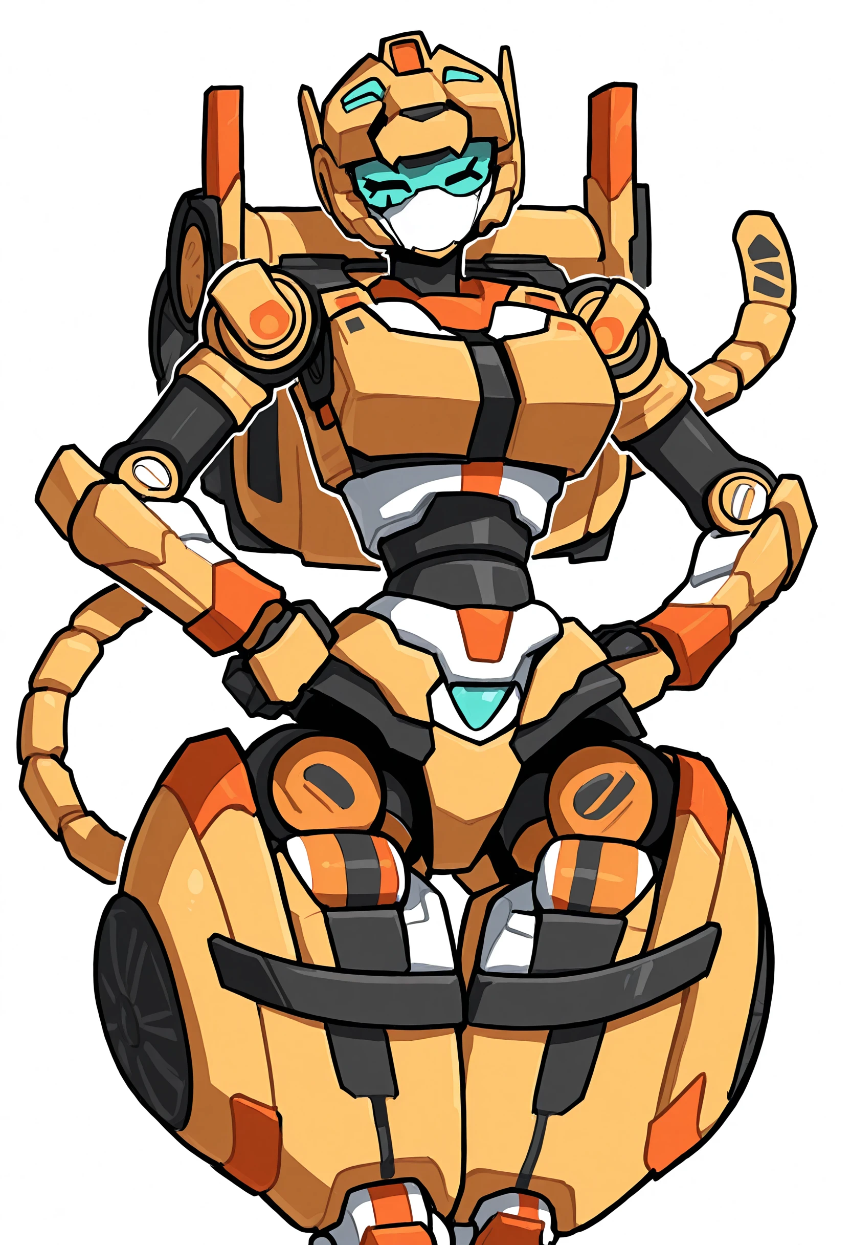 yellow armored feline robot, cyan glowing eyes, silver mouthplate, cat-shaped helmet, bulky thigh armor, segmented mechanical tail, construction vehicle backpack, orange accent panels, black joints, white plating, teal core gem, anthropomorphic transforming robot