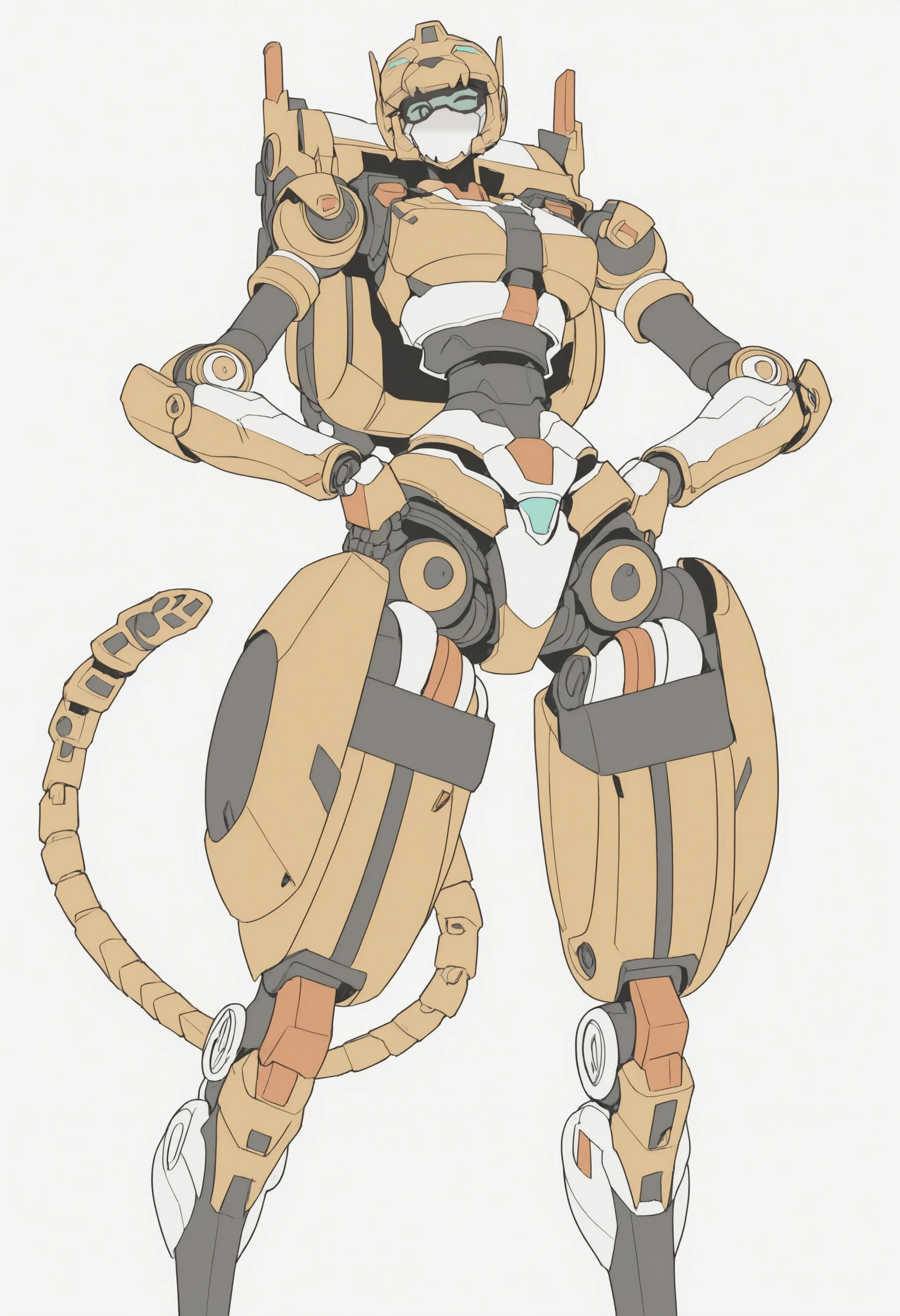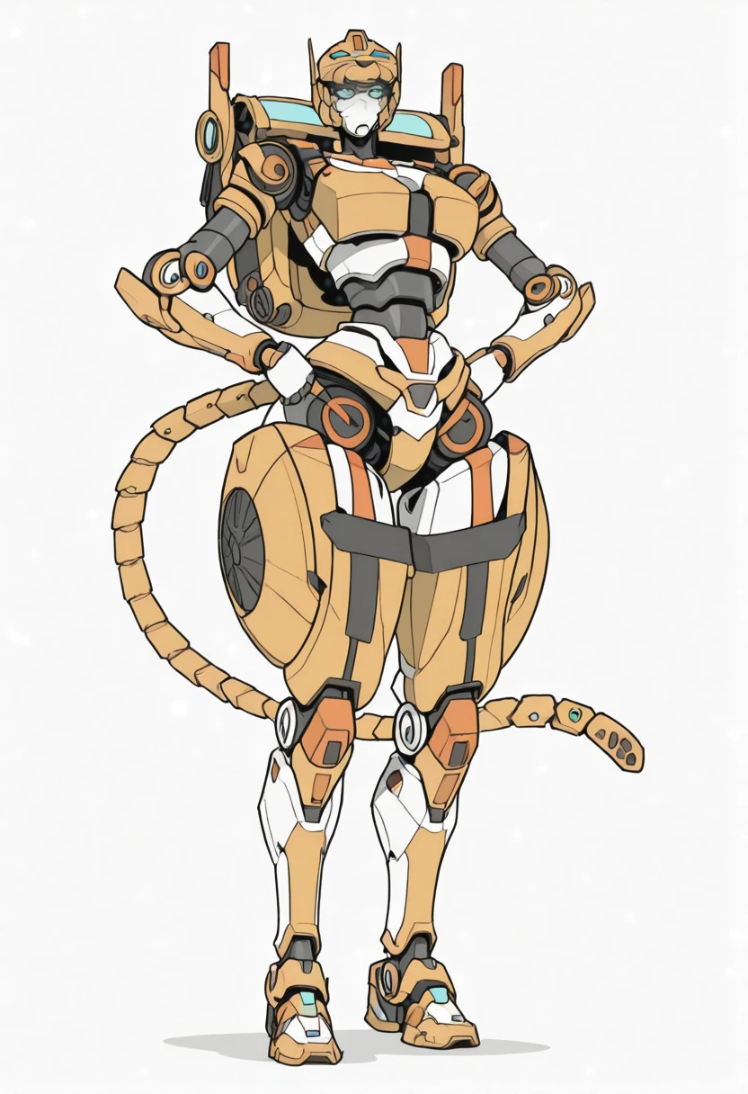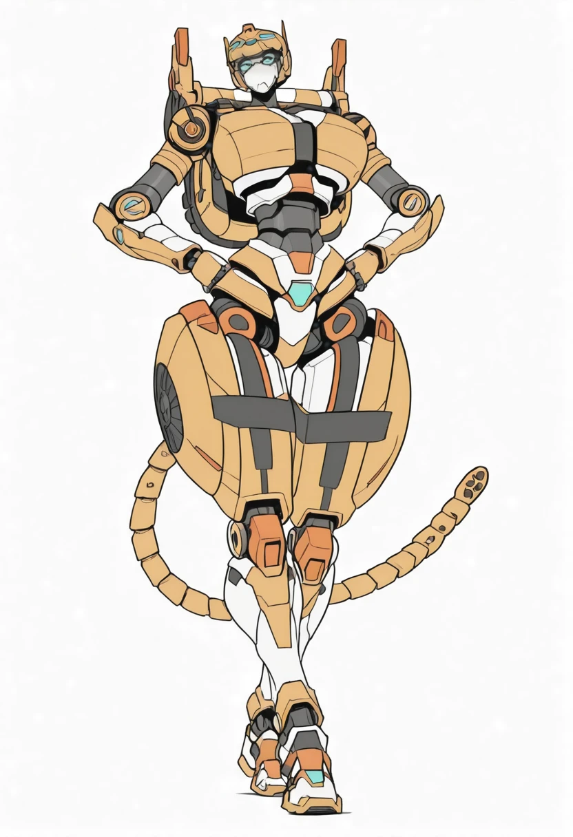 yellow armored feline robot, cyan glowing eyes, silver mouthplate, cat-shaped helmet, bulky thigh armor, segmented mechanical tail, construction vehicle backpack, orange accent panels, black joints, white plating, teal core gem, anthropomorphic transforming robot