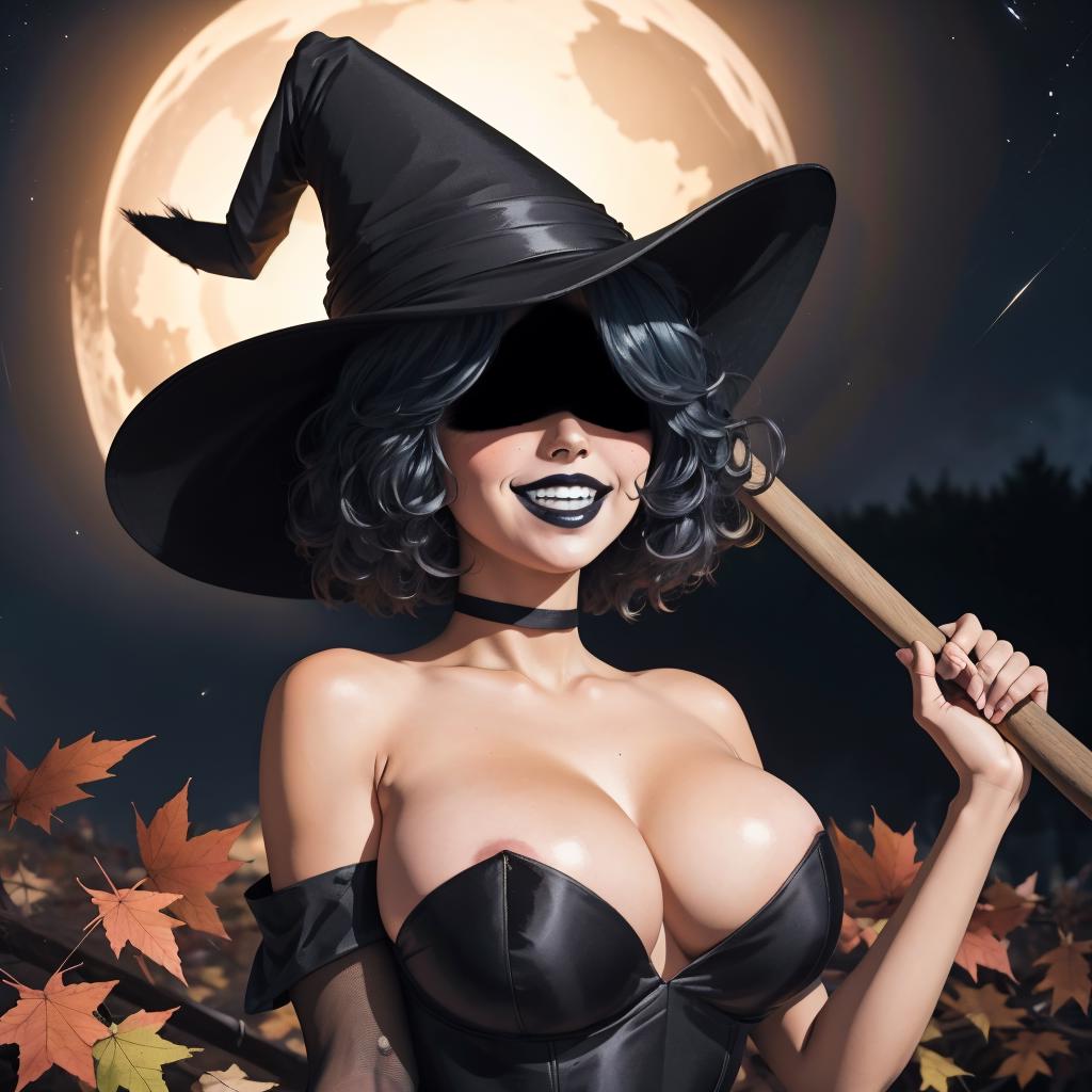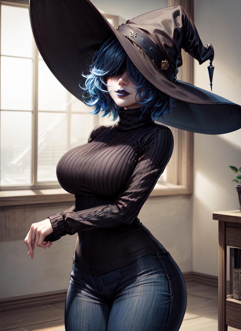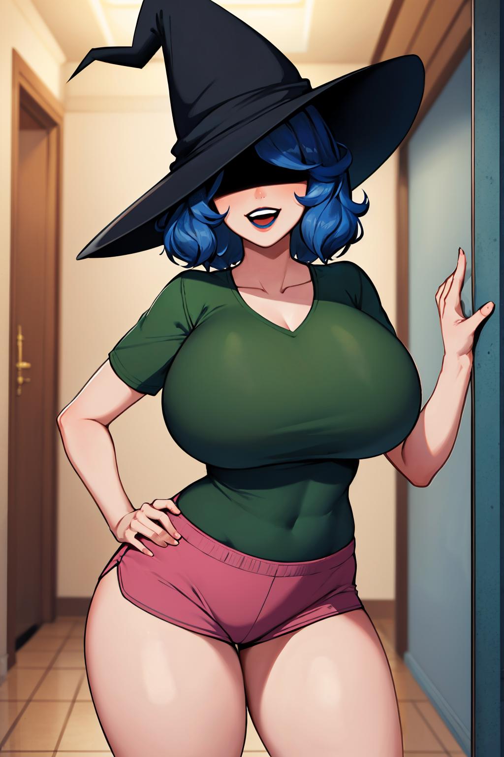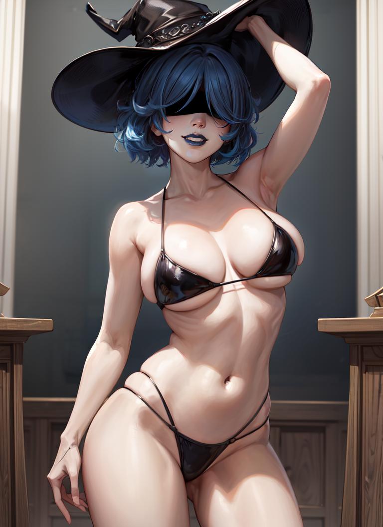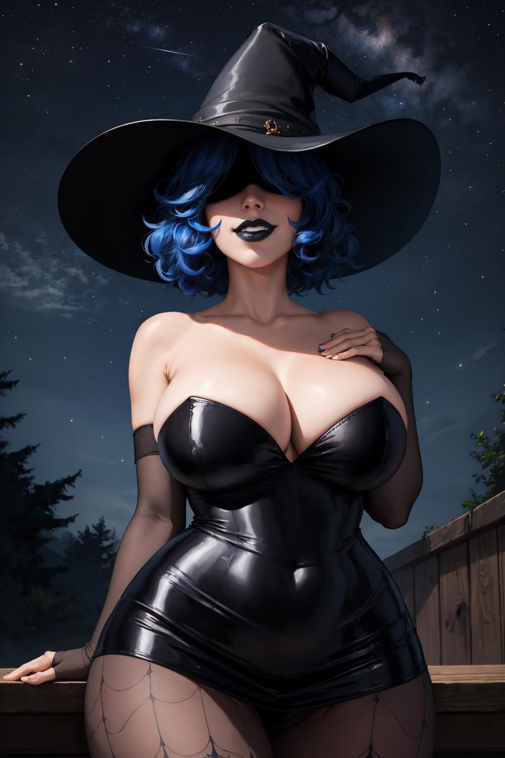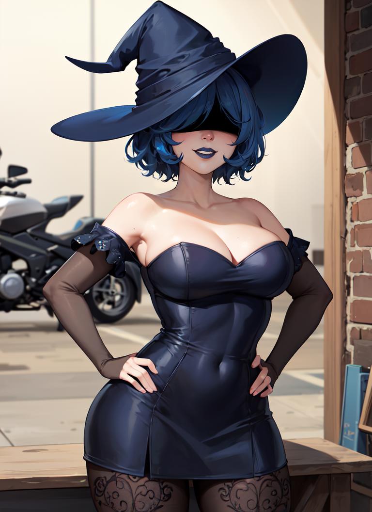 Add "witch hat, covered eyes, strapless dress, pantyhose, elbow gloves, black lipstick" for her typical look.