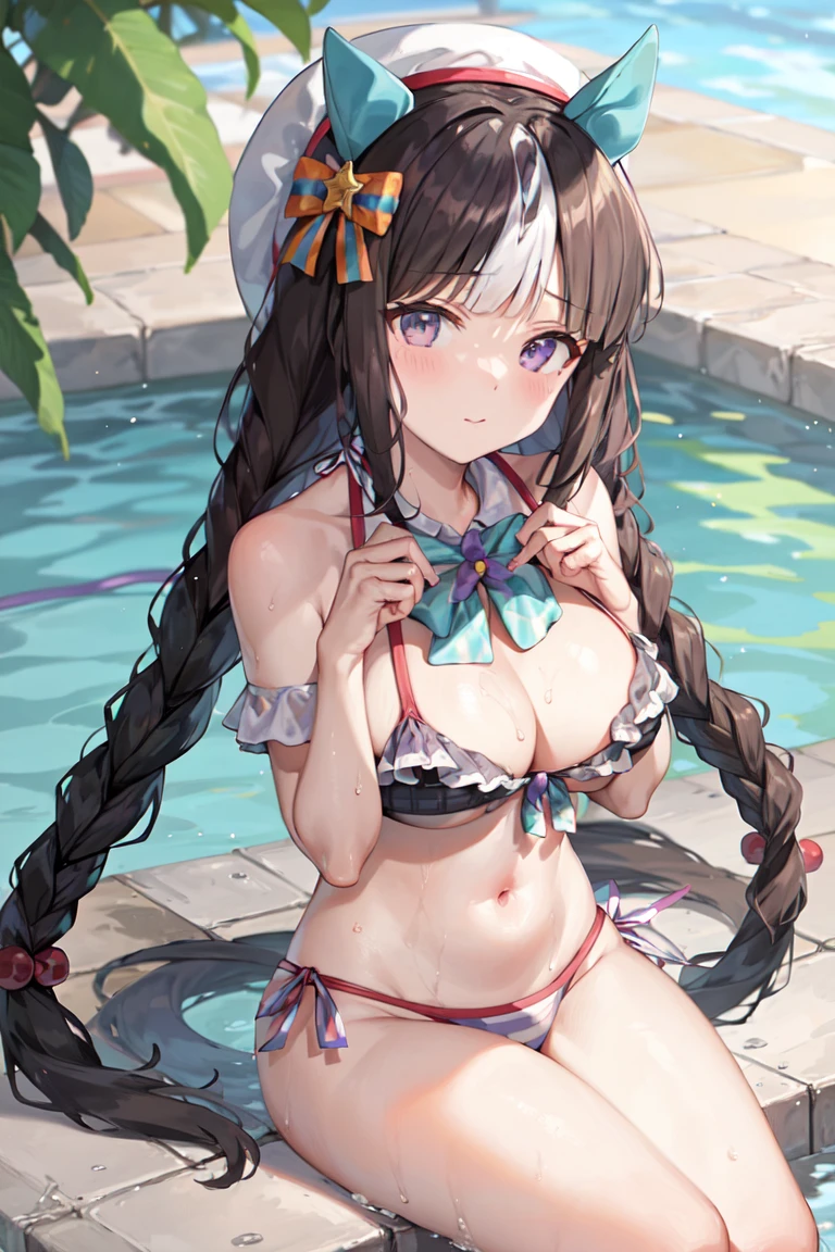 white thighhighs, tracen school uniform, purple shirt, pleated skirt, puffy short sleeves, white skirt, puffy sleeves, summer uniform, frilled skirt, sailor collar, sailor shirt, miniskirt, frills