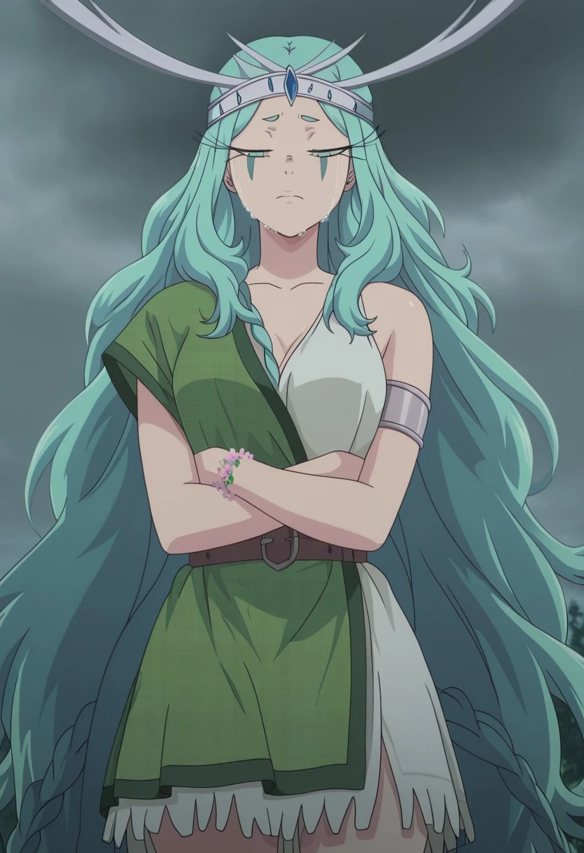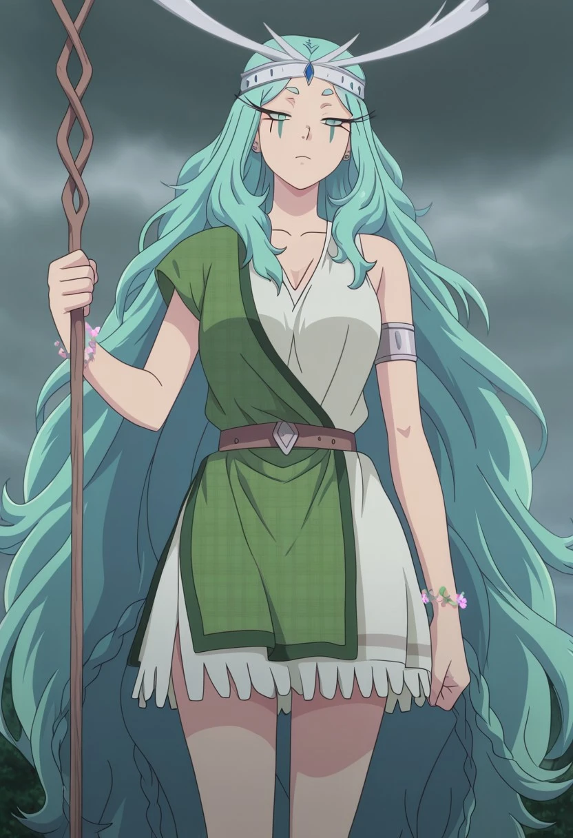 Boadicee, 1girl, solo, very long hair, aqua hair, parted bangs, twin braids, hair flowers, long eyelashes, green eyes, facial mark, large breast, curvy, wide hips, collarbone, antlered tiara, forehead blue jewel on tiara, short open side dress, white dress, single bare shoulder, sleeveless, green short toga, belt, greco-roman clothes, silver bracelet, jewelry, flowers anklets, flowers armlet, barefoot, holding staff, wood staff,