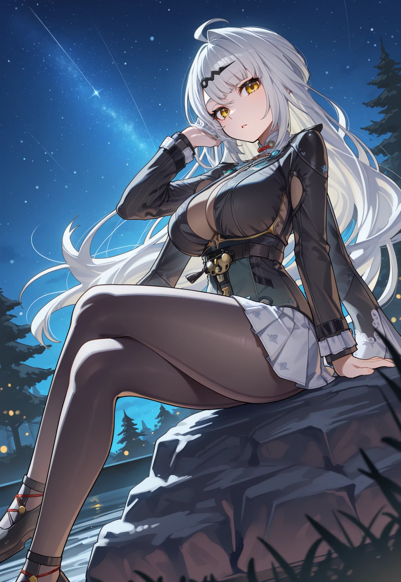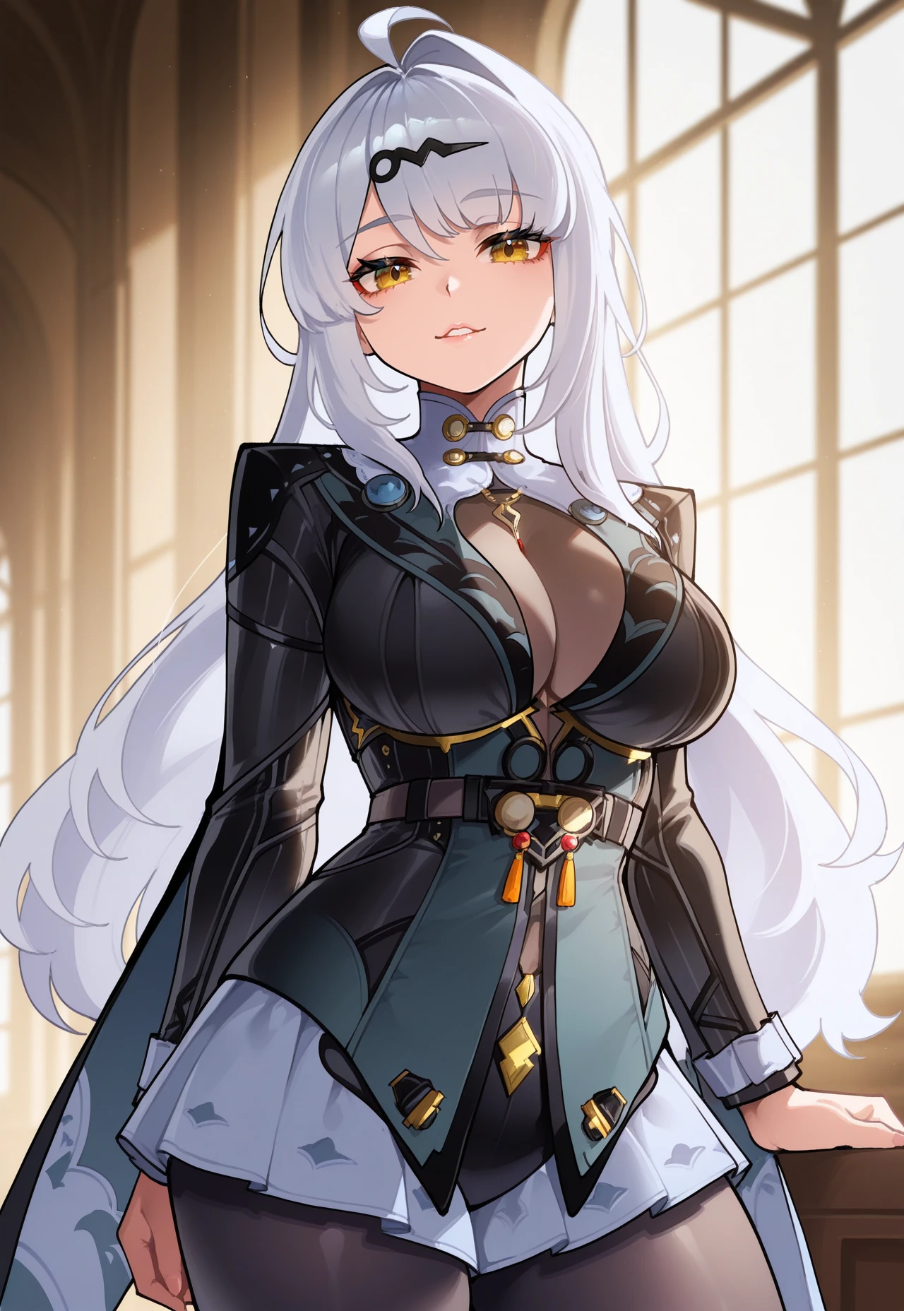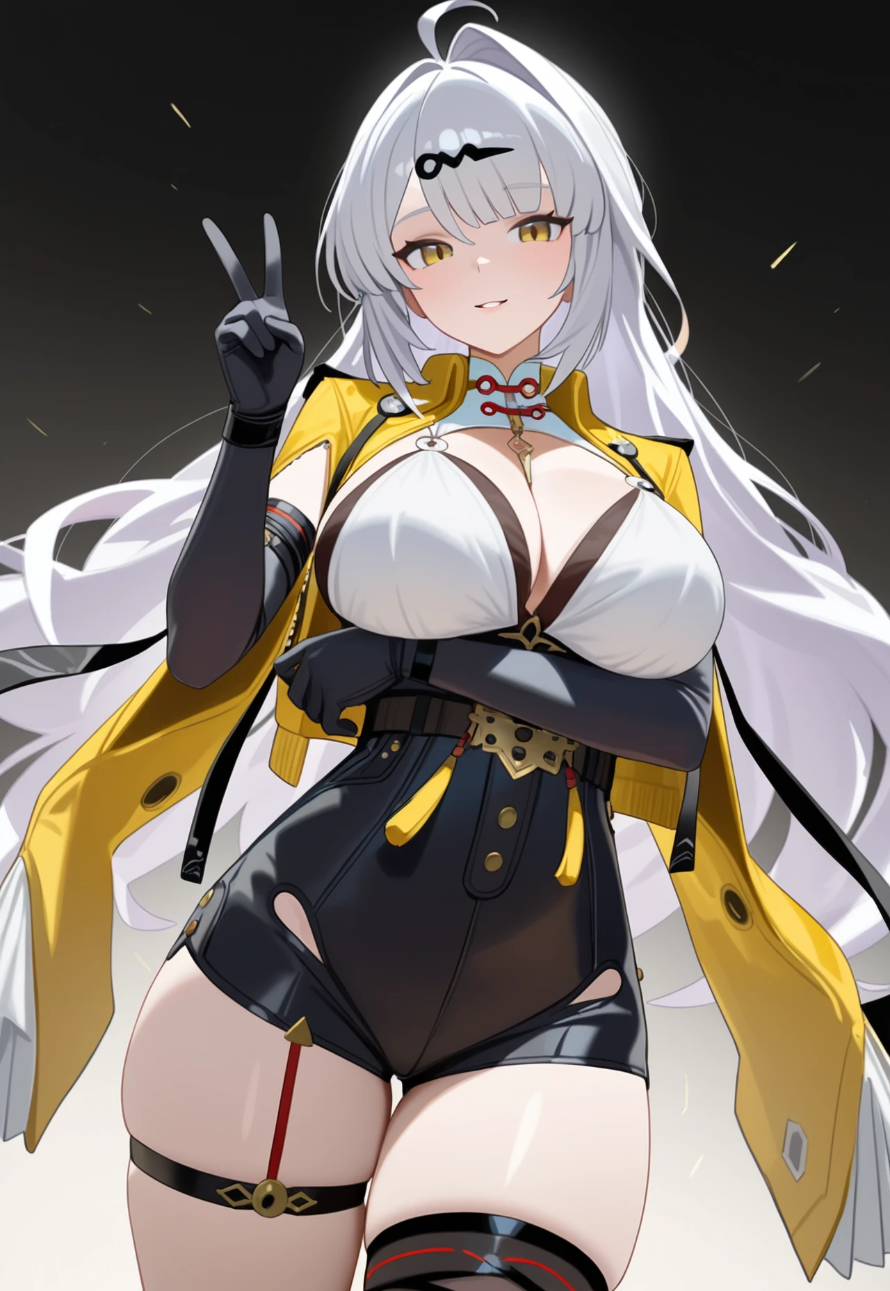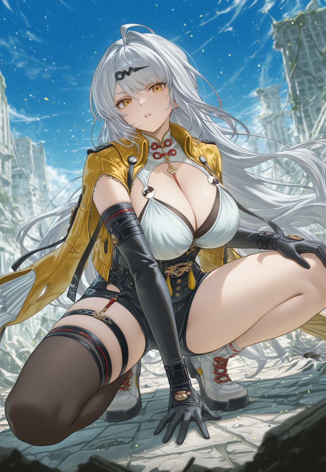 yi xuan outfit, yellow jacket, black shorts, thigh strap, elbow gloves, single thighhigh,