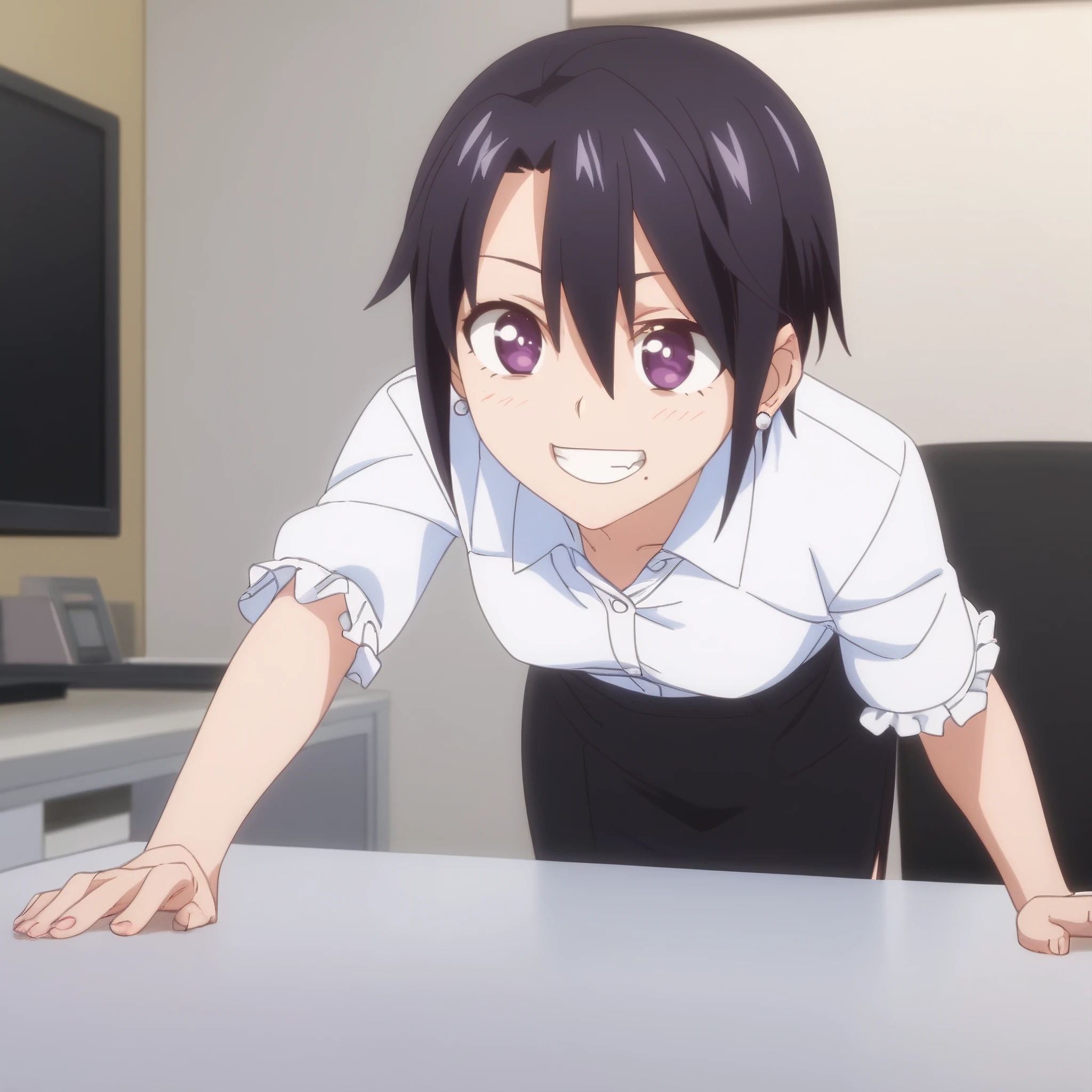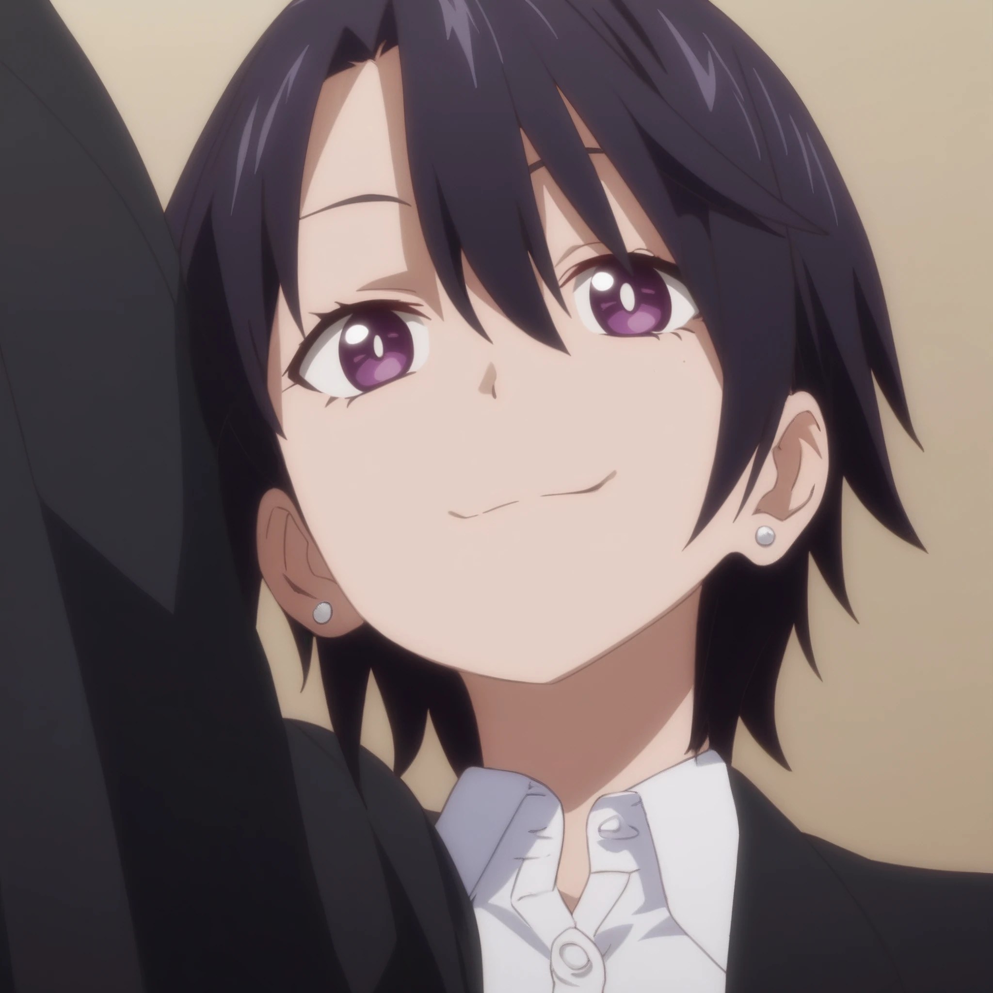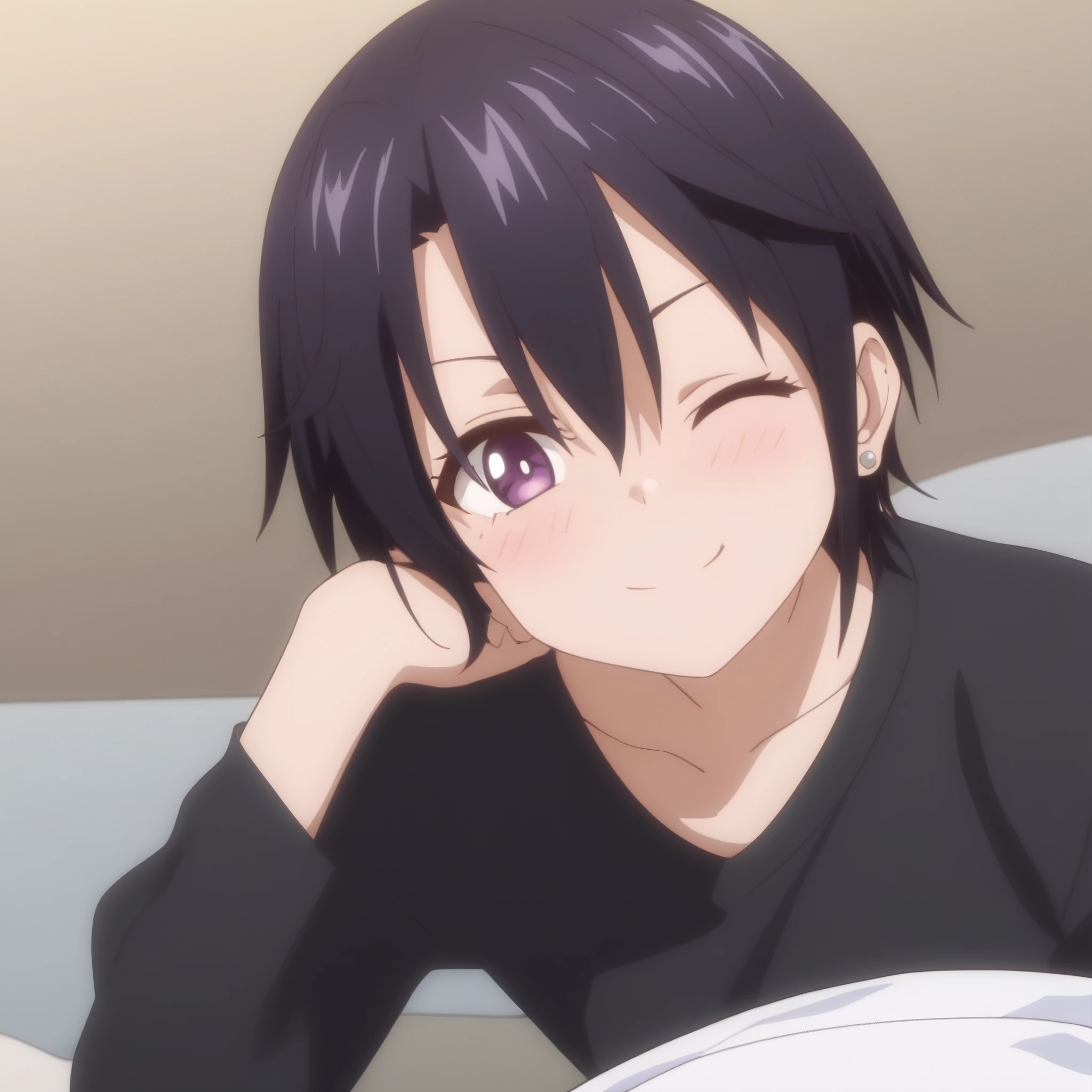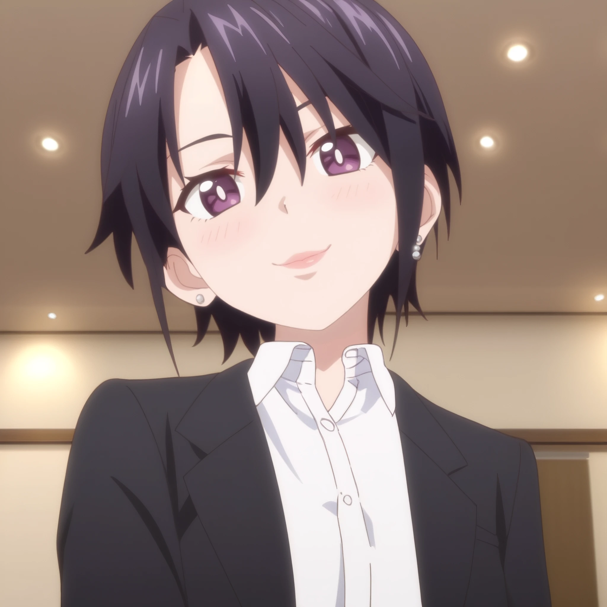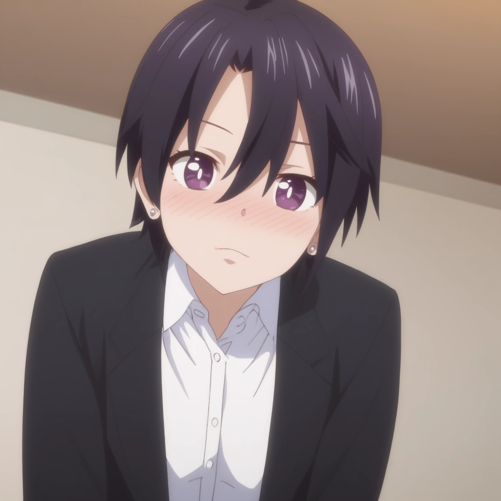 ANAKuro, black hair, short hair, purple eyes, hair between eyes, bangs, earrings, eyebrows visible through hair, stud earrings,