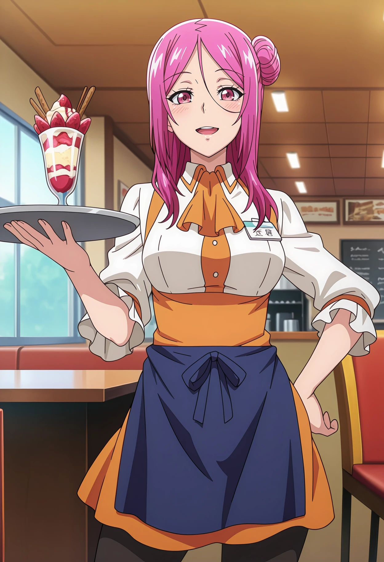 orange ascot, collared shirt, white shirt, name tag, frilled sleeves, orange dress, orange skirt, blue apron, black pantyhose