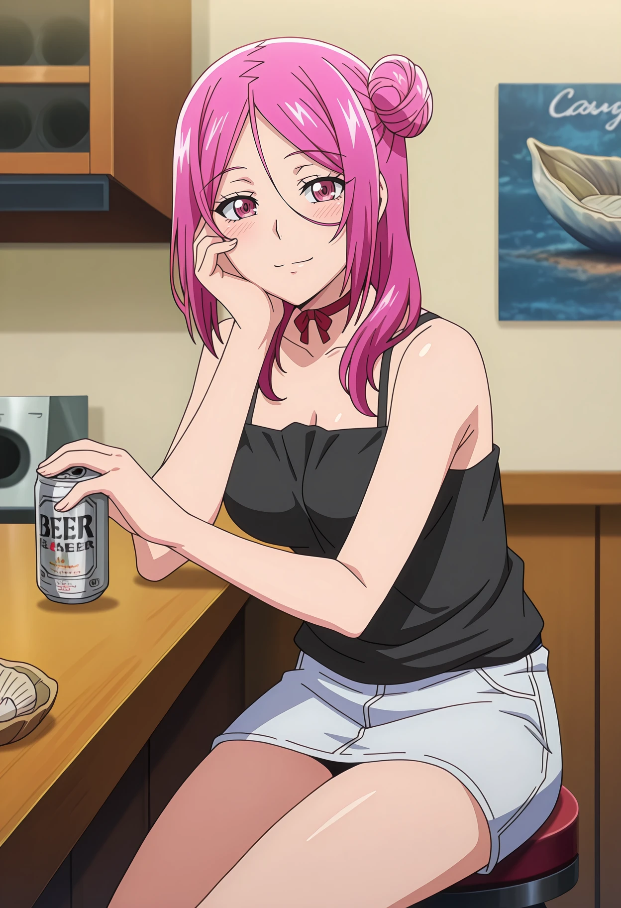 ribbon choker, red choker, bare shoulders, black camisole, medium breasts, denim skirt, white skirt