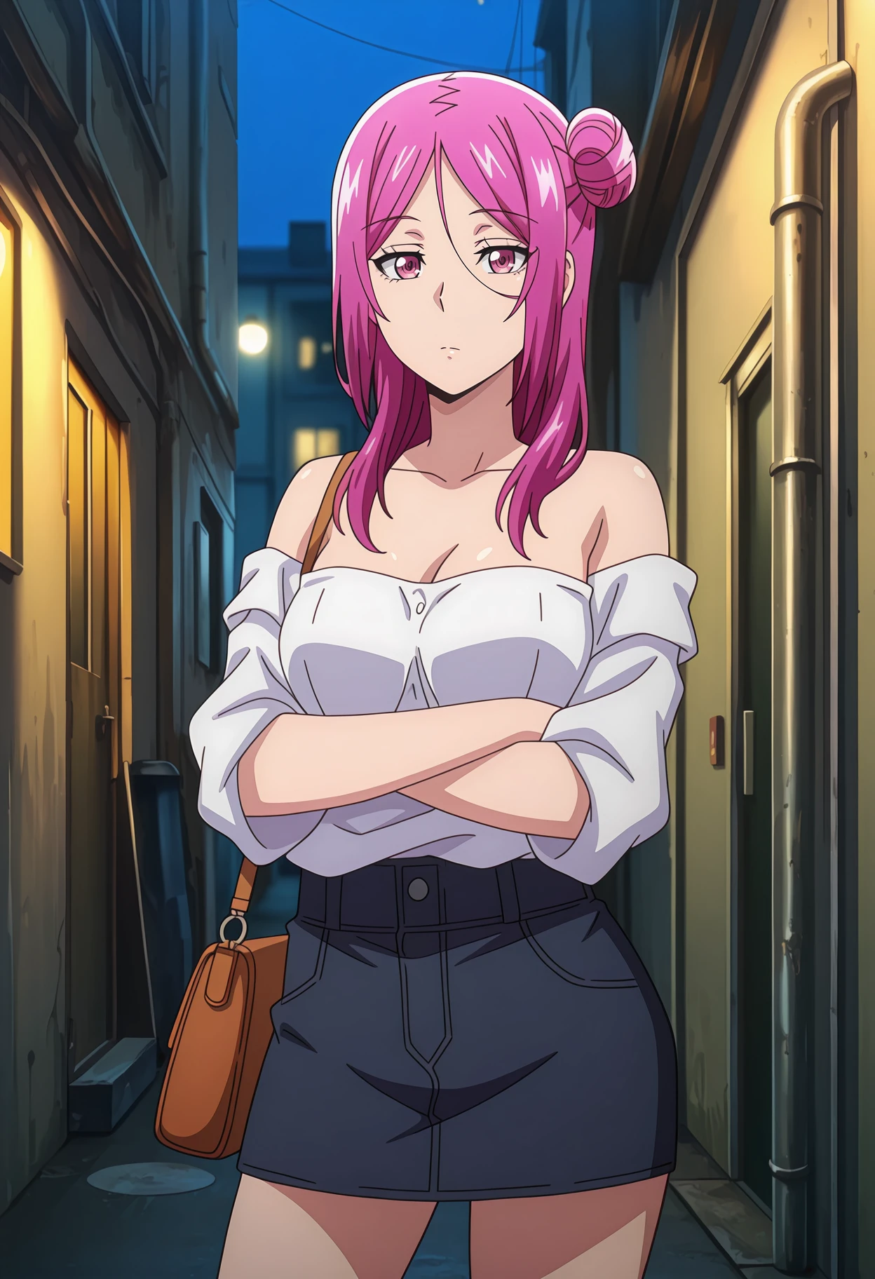 off-shoulder shirt, strapless shirt, white shirt, cleavage, medium breasts, denim skirt, miniskirt, black skirt