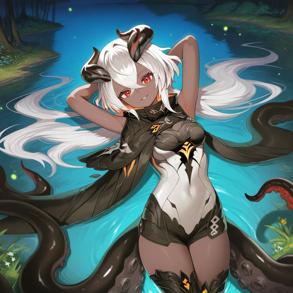 TabetheDNA, very dark skin, black horns, horns, red eyes, petite, long hair, white hair, monster girl, dark skin, dark-skinned female, tentacles,Character Prompts are included in each Outfit.