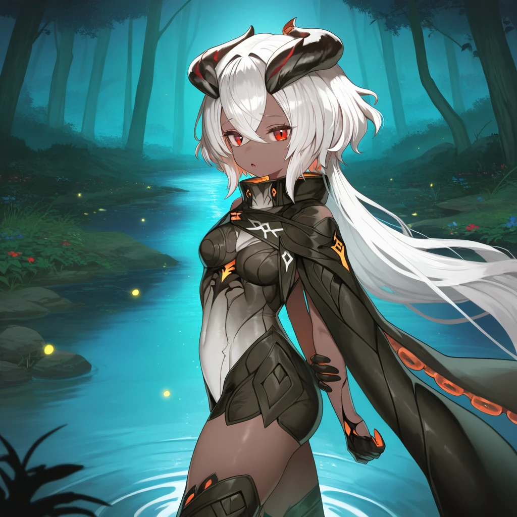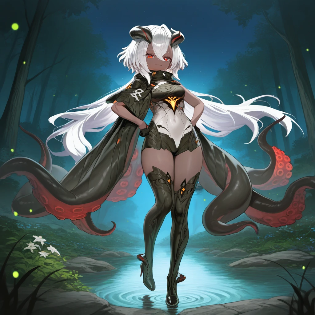 TabetheDNA, orange gemstone, very dark skin, shorts under bodysuit, gradient bodysuit, sleeveless bodysuit, white bodysuit, black horns, horns, red eyes, petite, long hair, white hair, monster girl, dark skin, dark-skinned female, half gloves, black gloves, black shorts, short shorts, orange trim, glowing cracks, cracks, high collar, side cape, black cape, tentacles, black tentacles, thigh boots, black footwear,The results of your generations are dependent on the additional LoRAs, weights, and models you use, so it may not work or come out as consistent as my sample images.