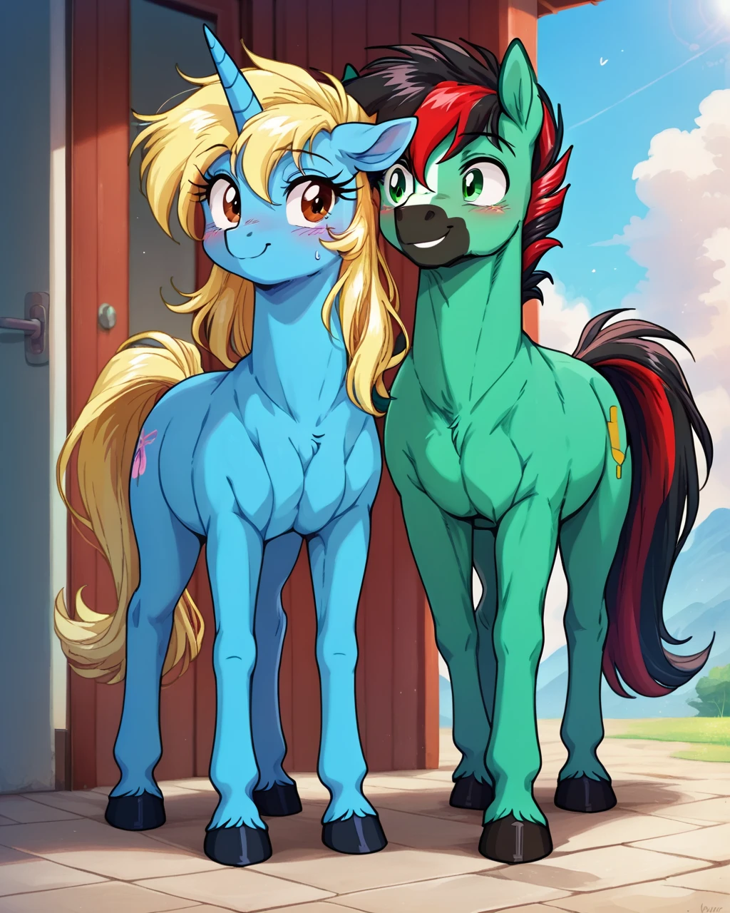 girlfriend-oc, horse, unicorn, blue body, blonde hair, brown eyes