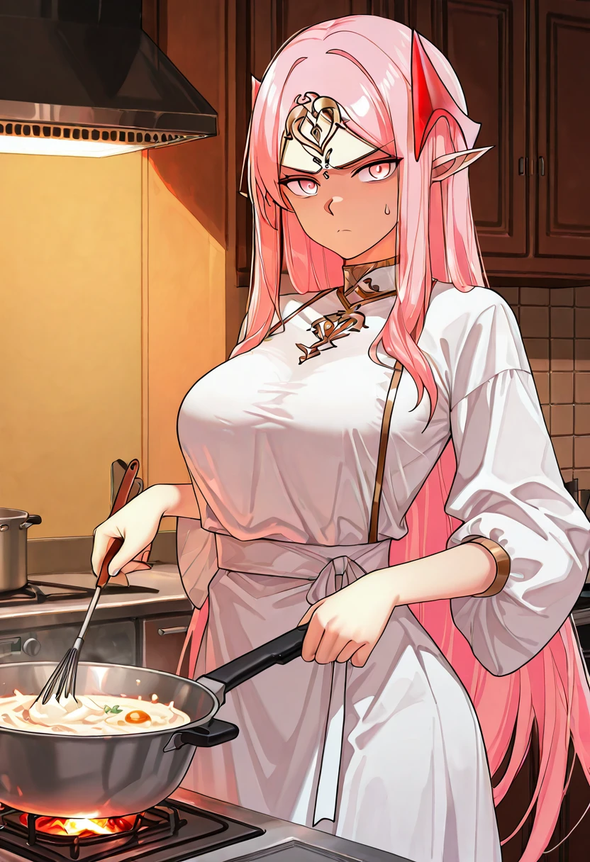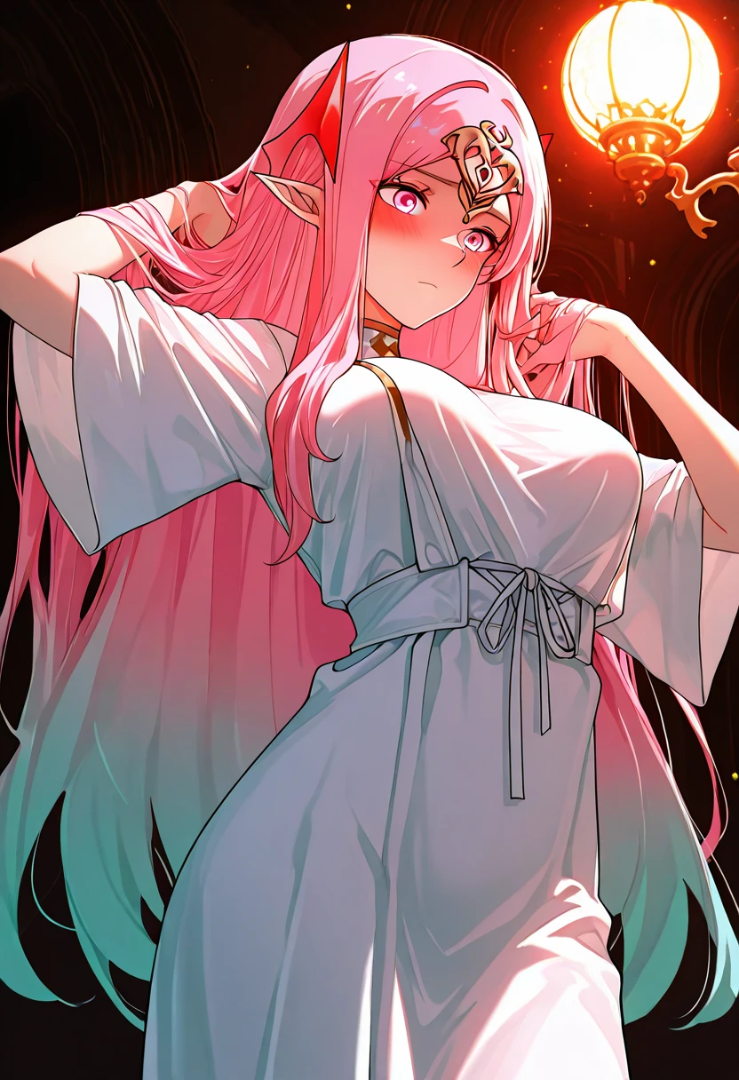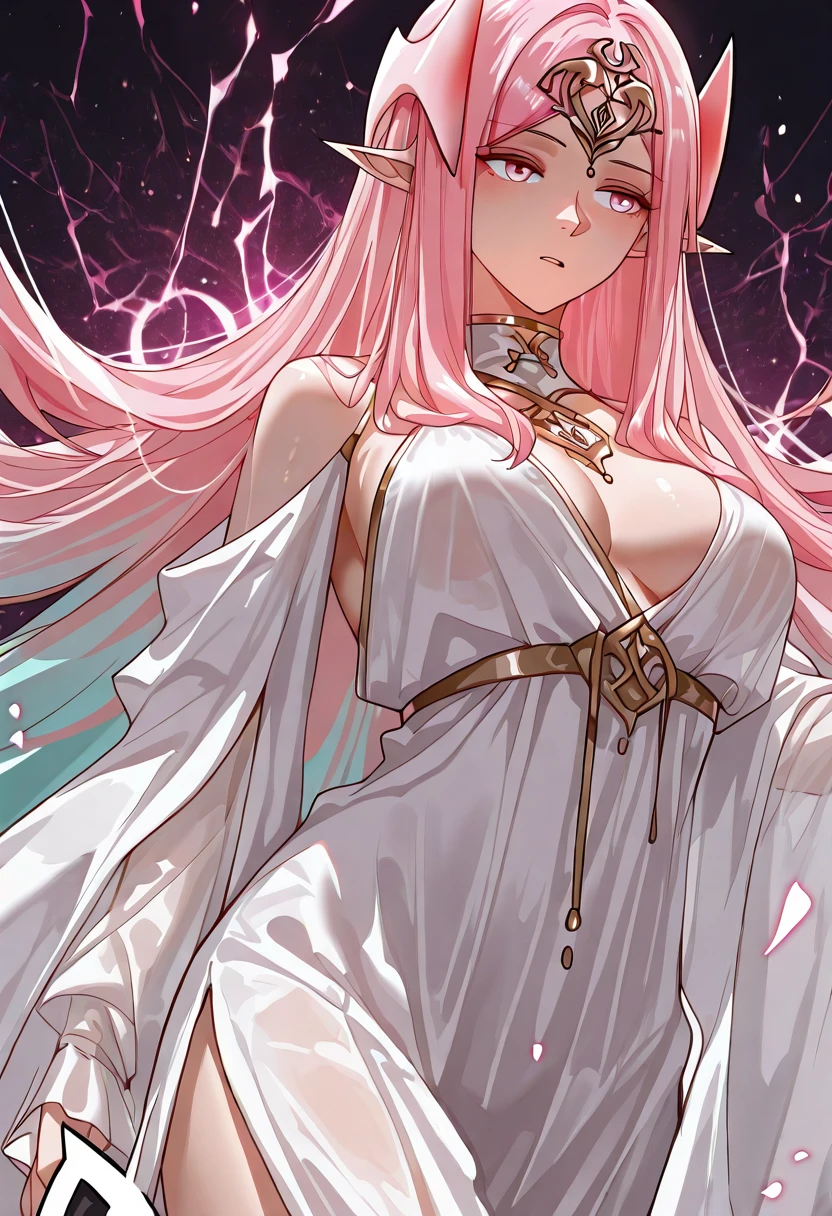 ,yu ru meng,yu ru meng,1girl,solo,pointy ears,pink hair,breasts,long hair,pink eyes,large breasts,white dress,
