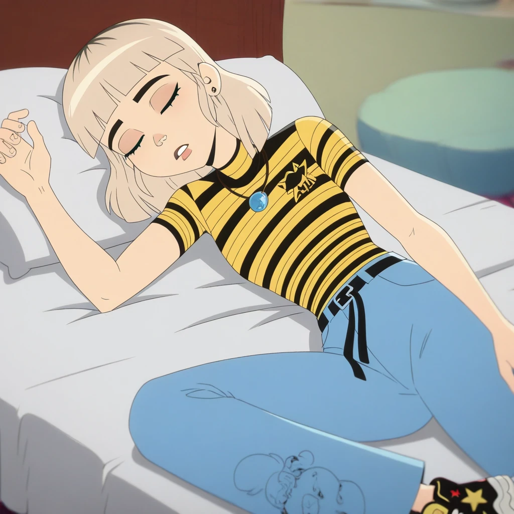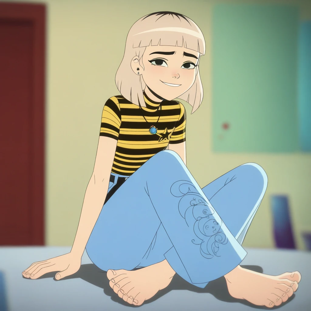 jentrychau, absurdres, masterpiece, best quality, 8k, white background, 1girl, blonde hair, medium hair, bangs, black eyes, casual outfit, yellow and black striped shirt, short sleeve, blunt bangs, light blue pants, wide leg pants, flared pants, flared pants, big feet, sneakers, striped, necklace, full body,