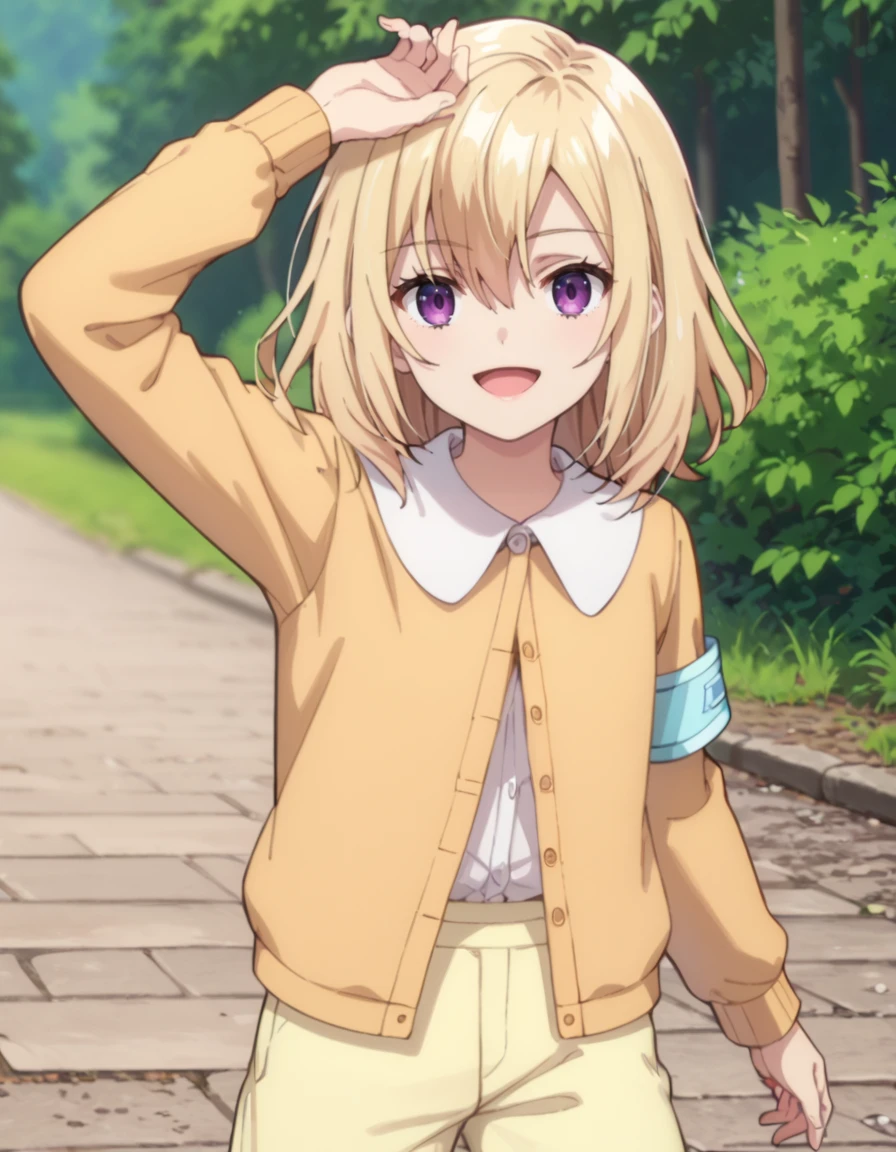 white collared shirt, orange cardigan, armband, long sleeves, yellow pants, pantyhose under shorts, pantyhose, brown footwearPrompt below is for v1.0-pre: