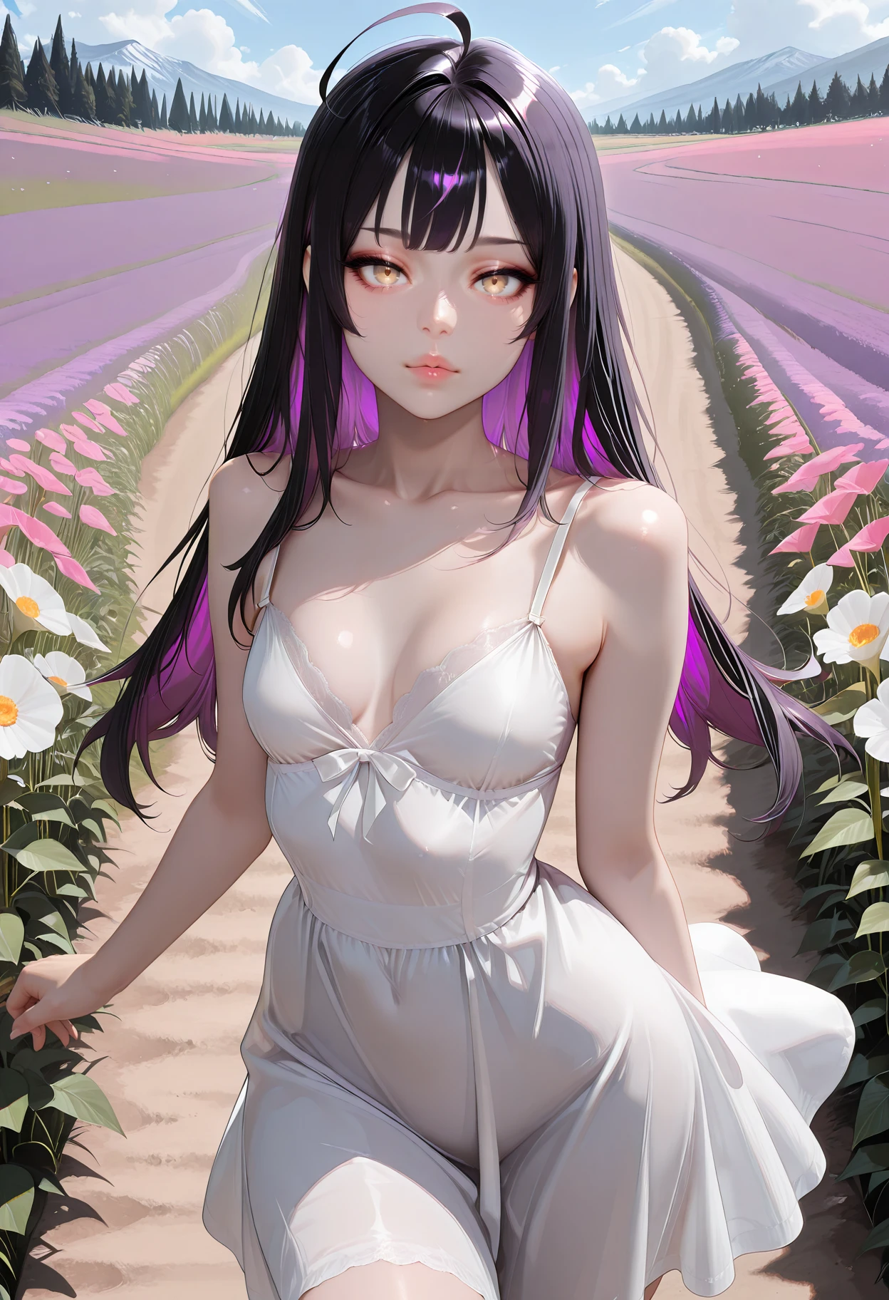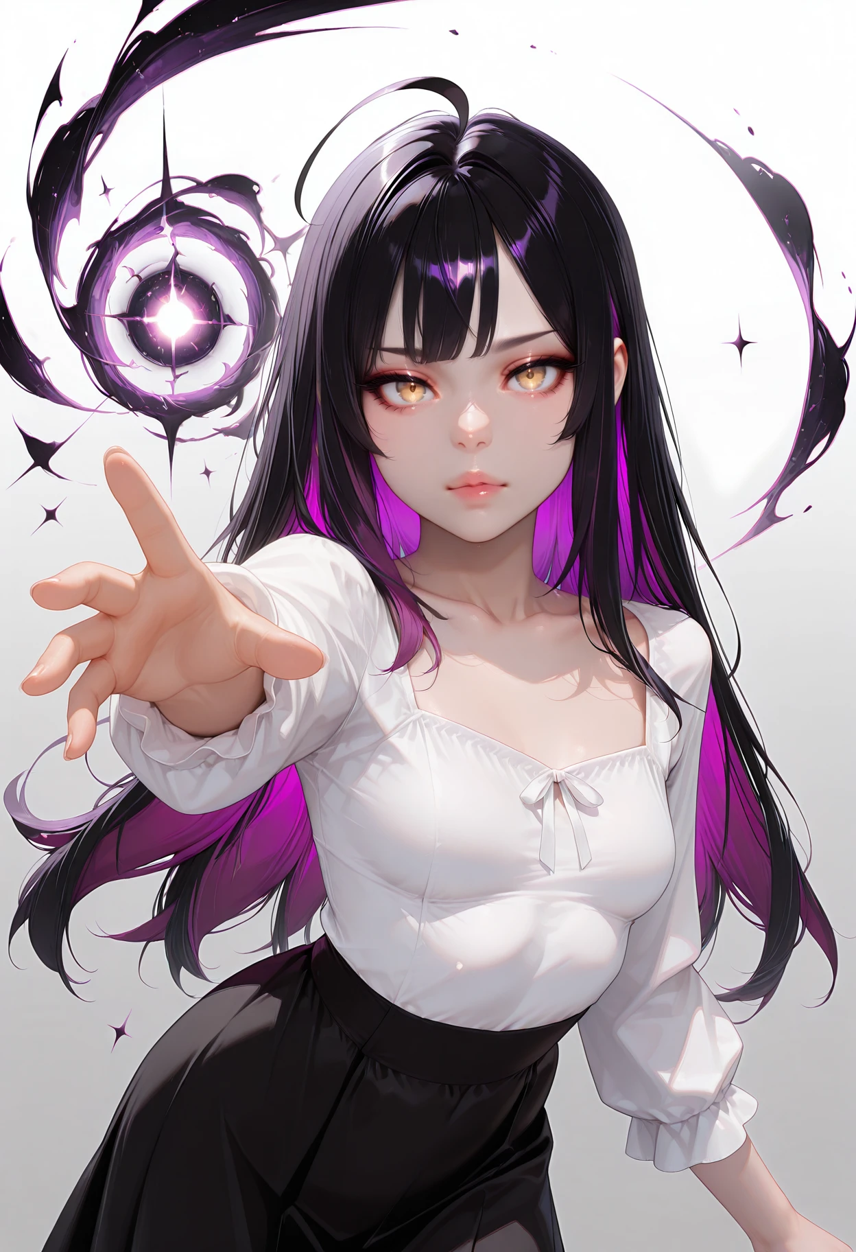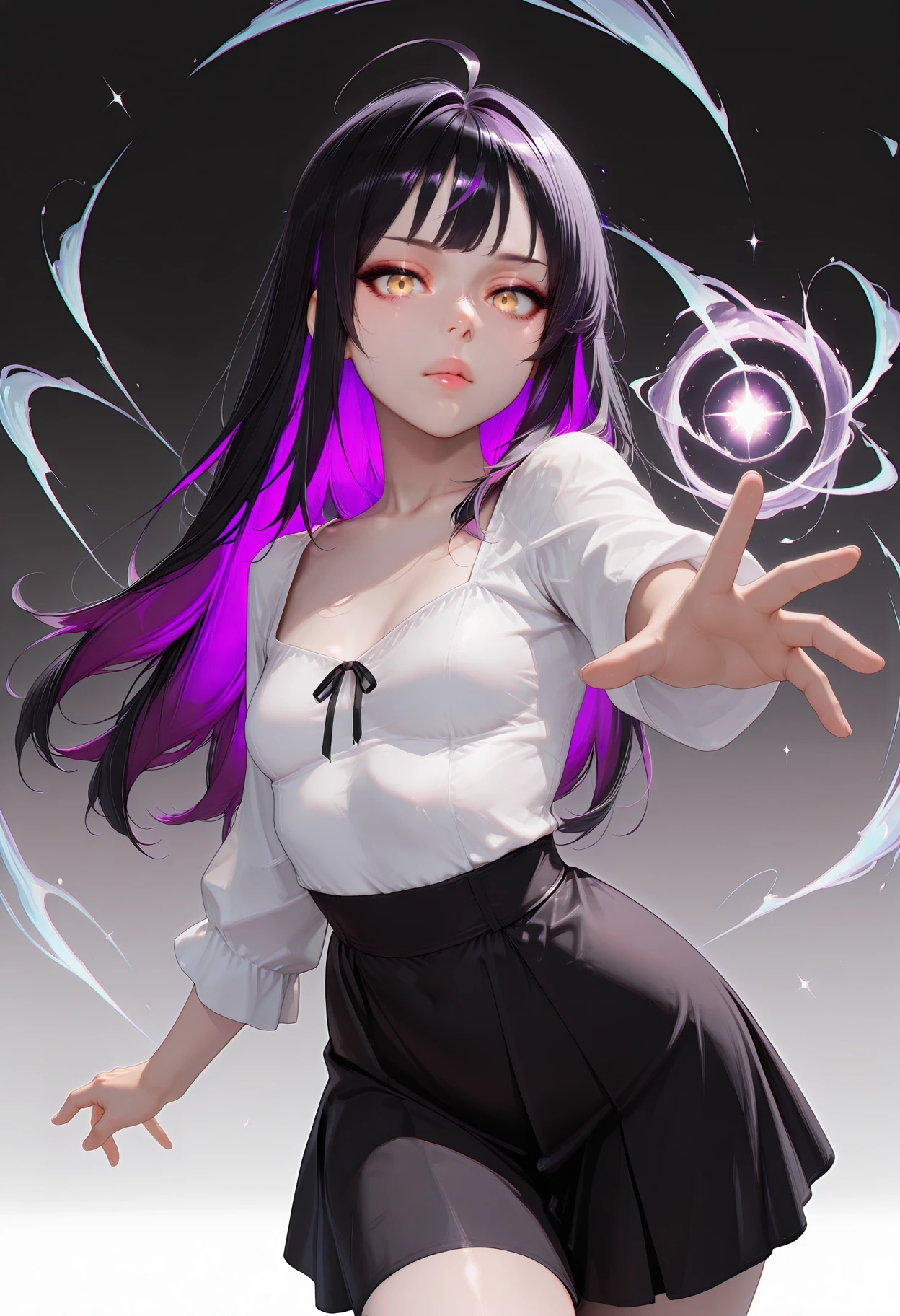 Appearance features: black hair with purple hues, pale skin (from constant laboratory work in the tower), golden eyes, petite stature (156 cm), small breasts