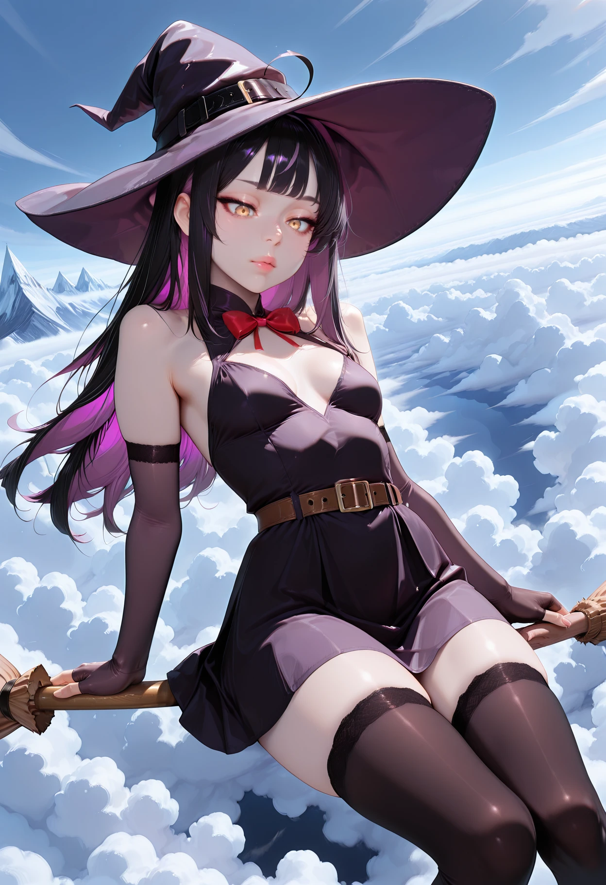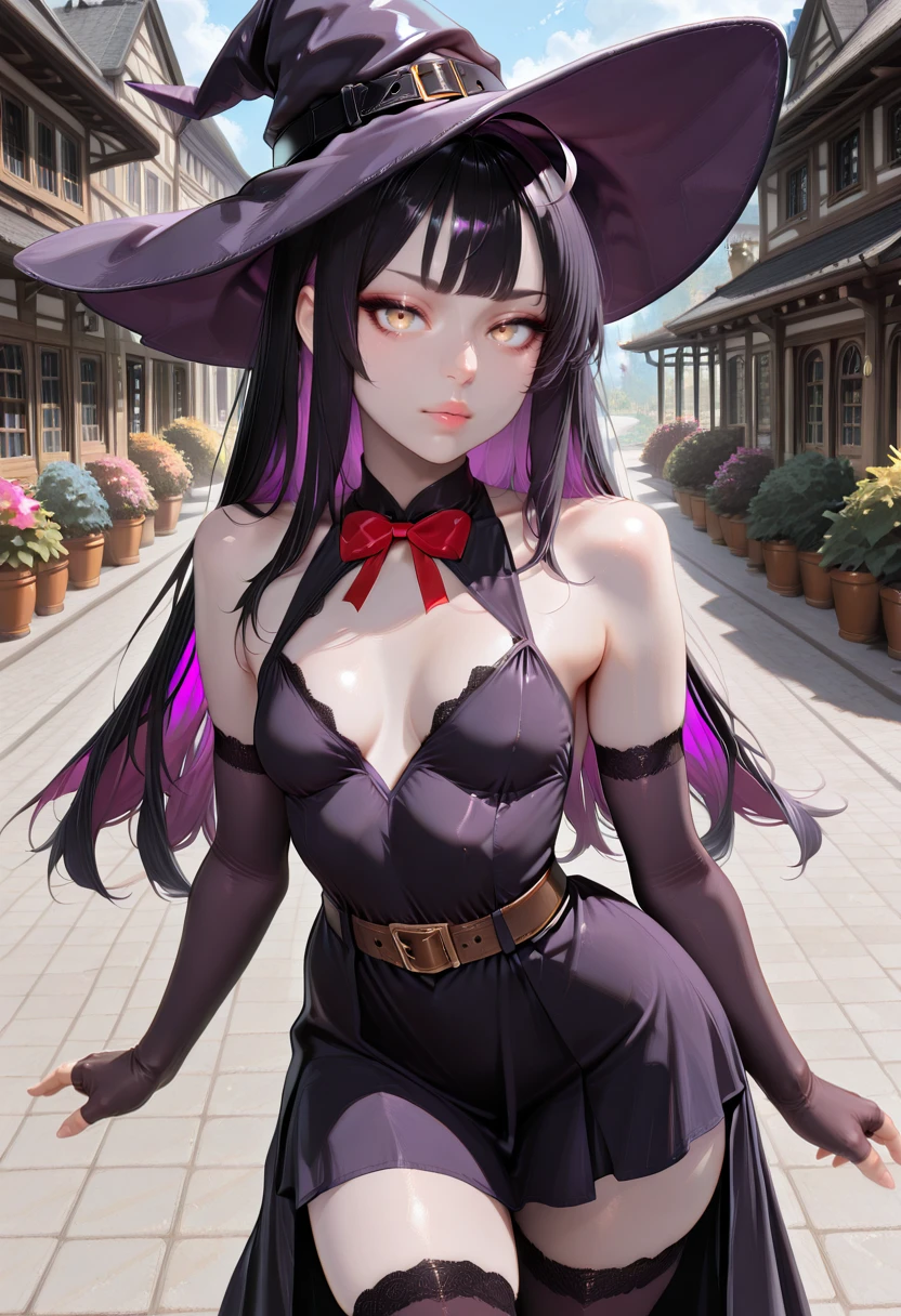 Her original outfit: mirabelle witch dress, witch hat, red bowtie, belt, belt buckle, sleeveless, elbow gloves, nylon gloves, fingerless gloves, thighhighs,