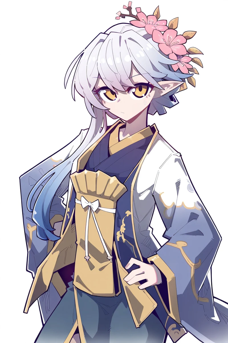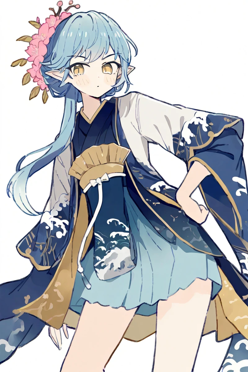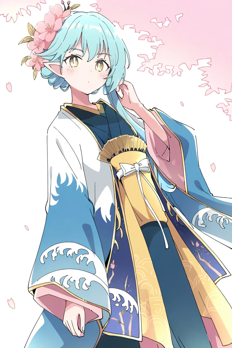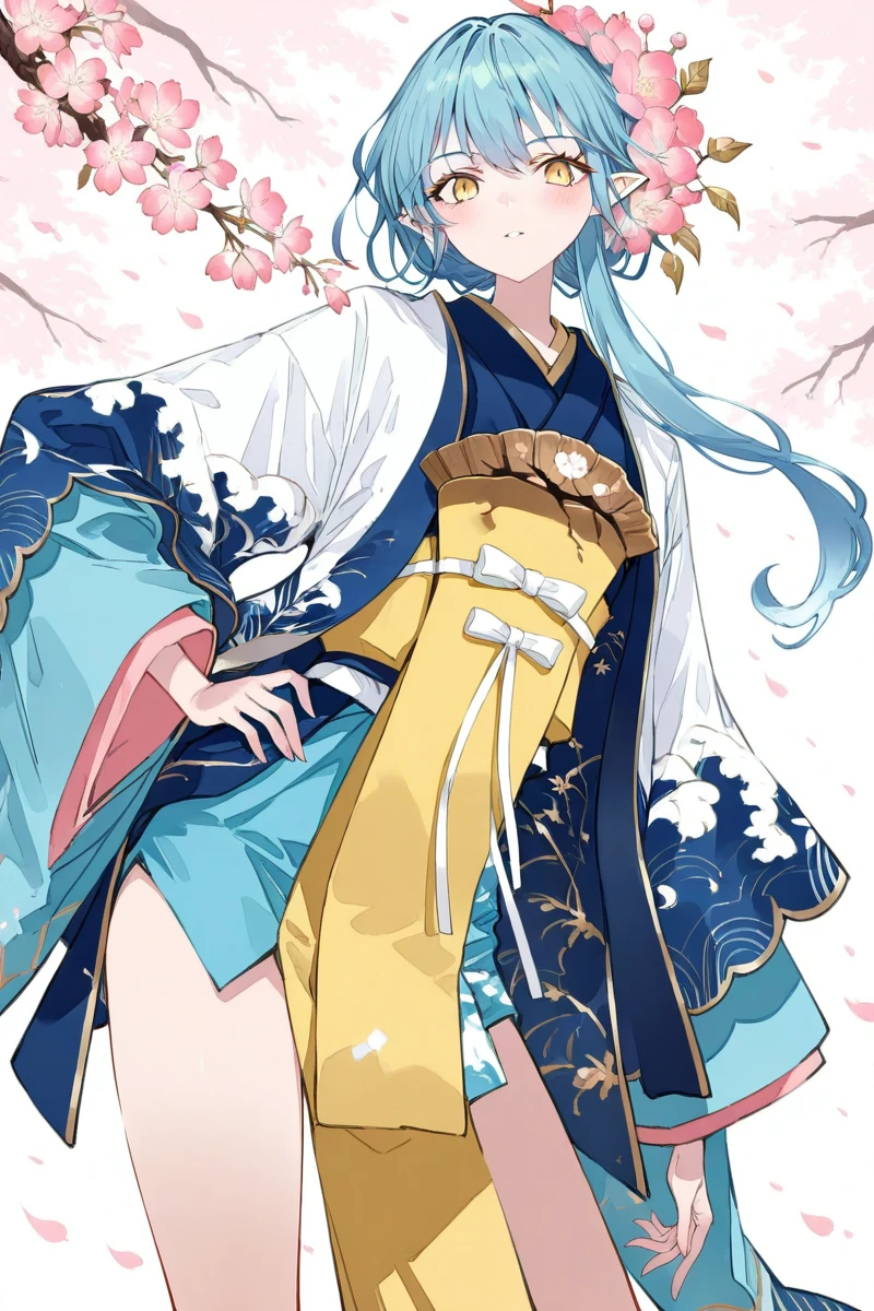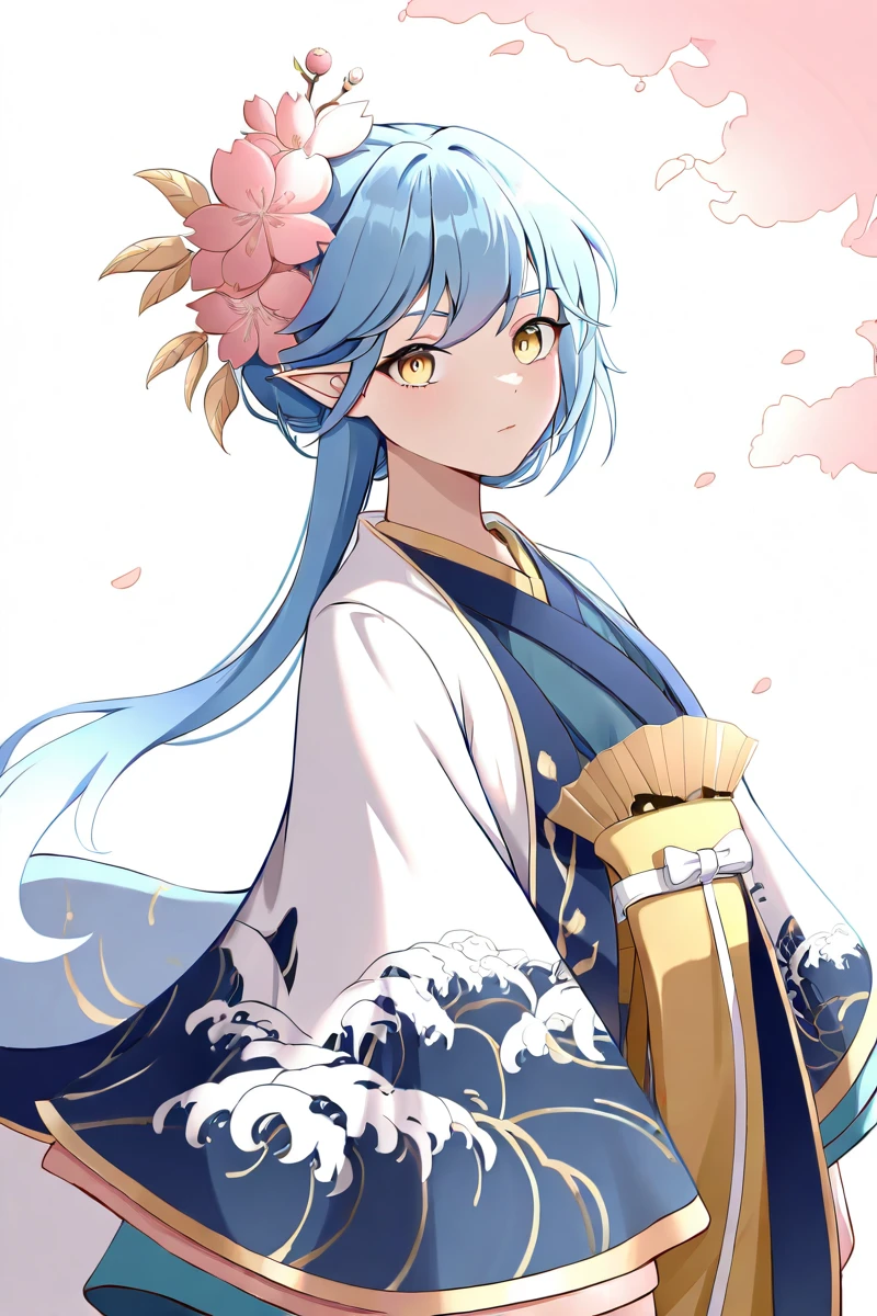 blue hair,hair ornament,hair flower,kimono,pink flower,yellow eyes,long sleeves,wide sleeves,pointy ears,cherry blossoms,sash,haori,