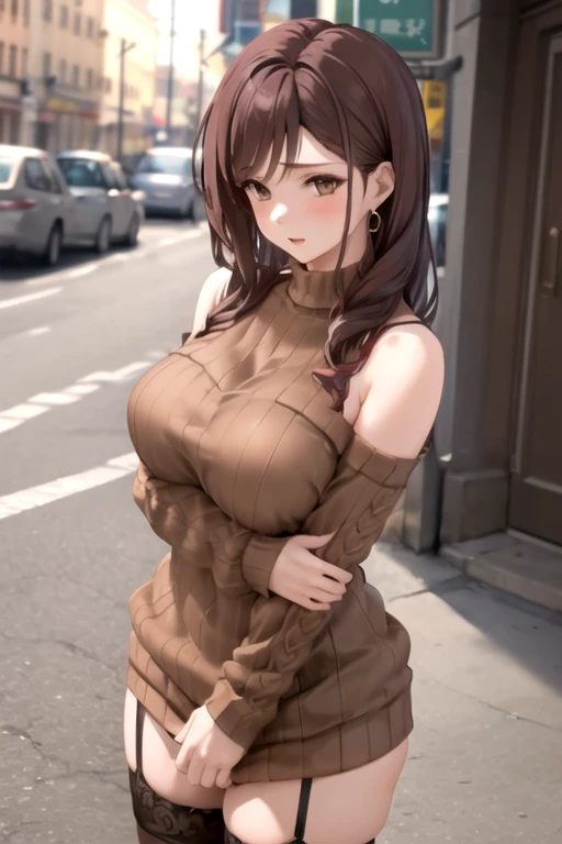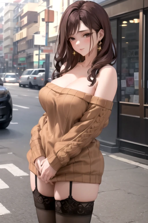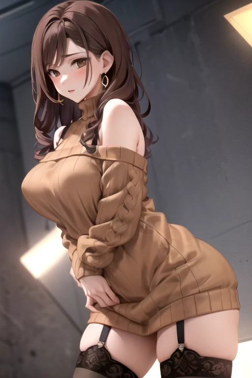 ShihoKujo, 1girl, solo, long hair, large breasts, brown hair, black thighhighs, sweater dress, bare shoulders, brown eyes, earrings, garter straps, brown sweater,