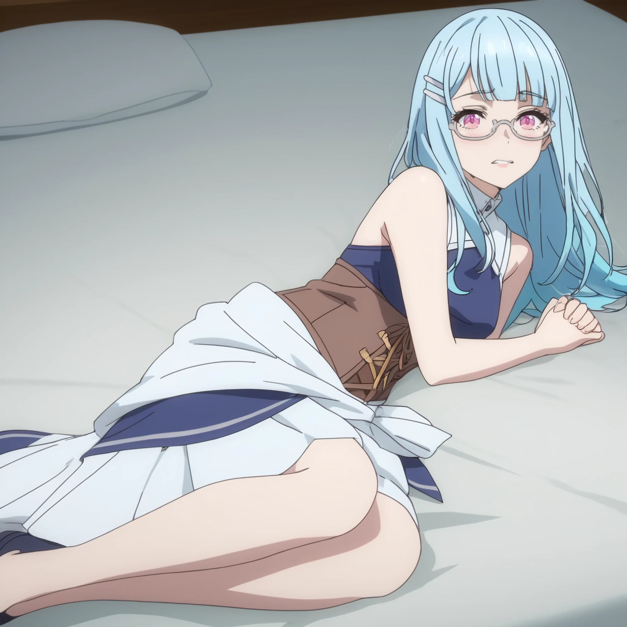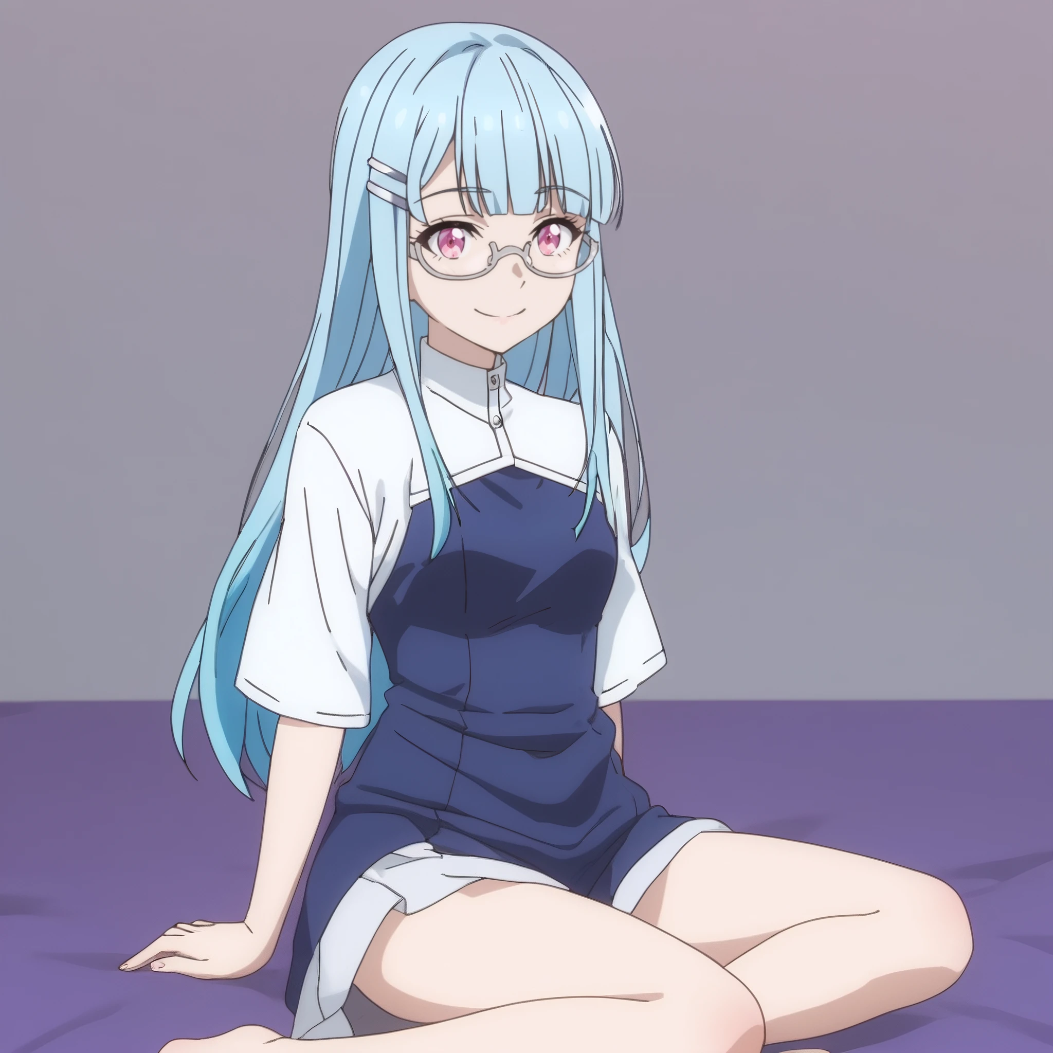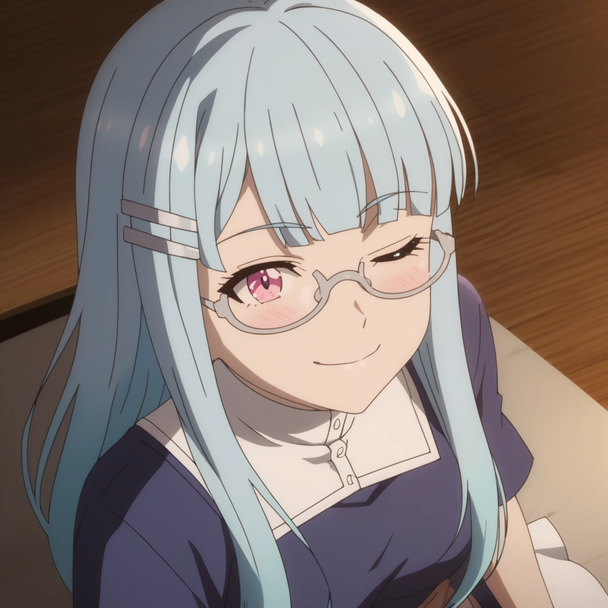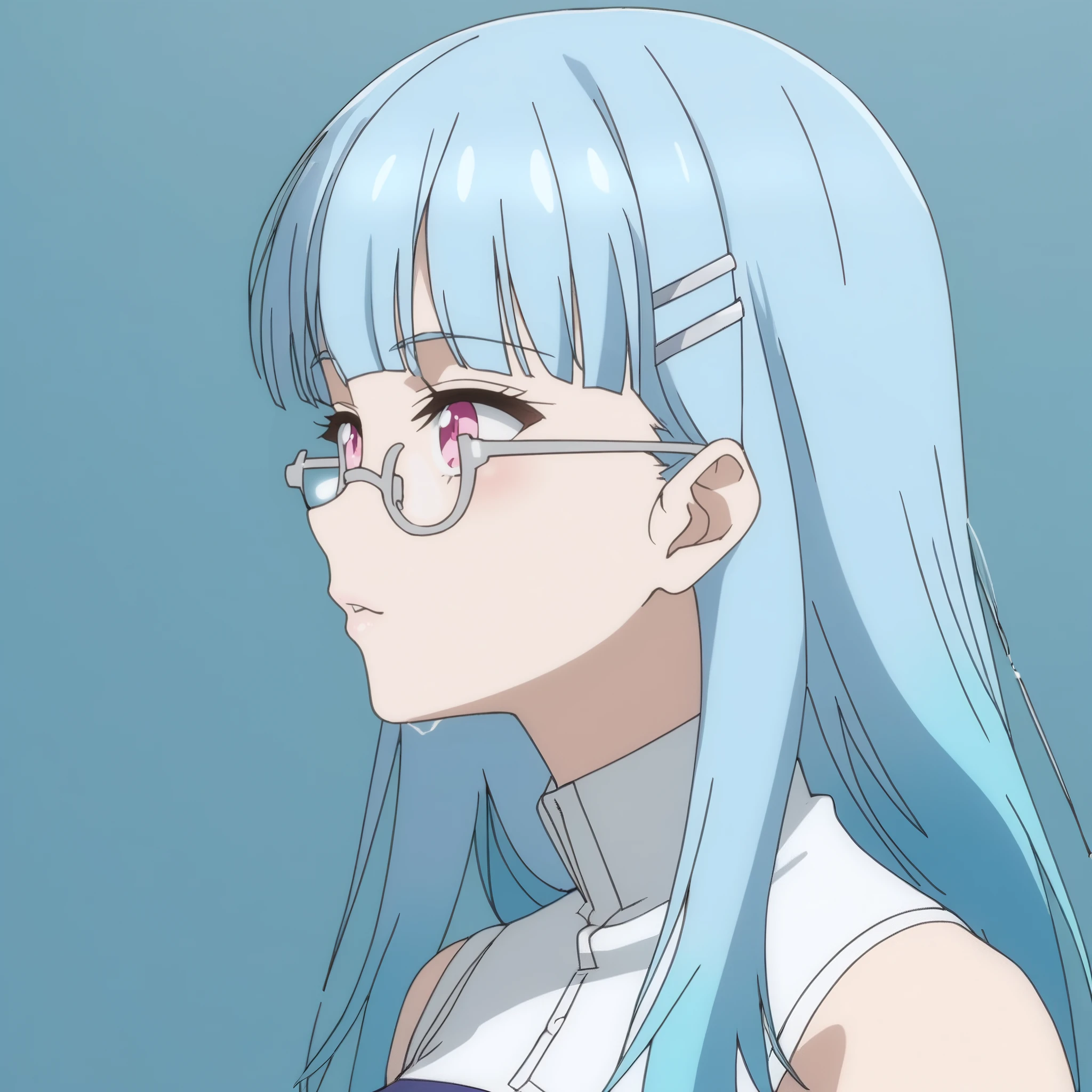 SRASilica, long hair, glasses, hair ornament, hairclip, pink eyes, blue hair, semi-rimless eyewear, grey-framed eyewear, blunt bangs, sidelocks,