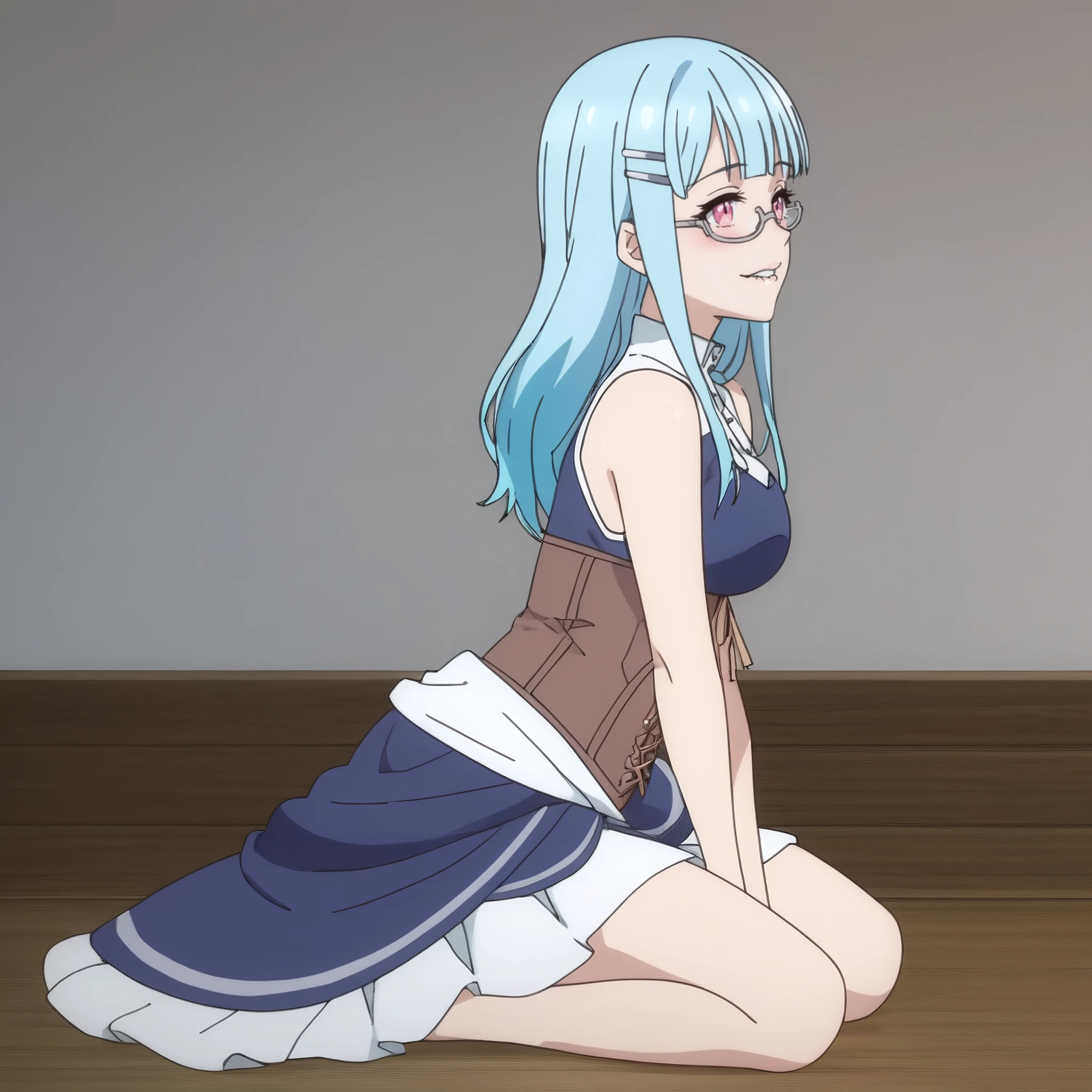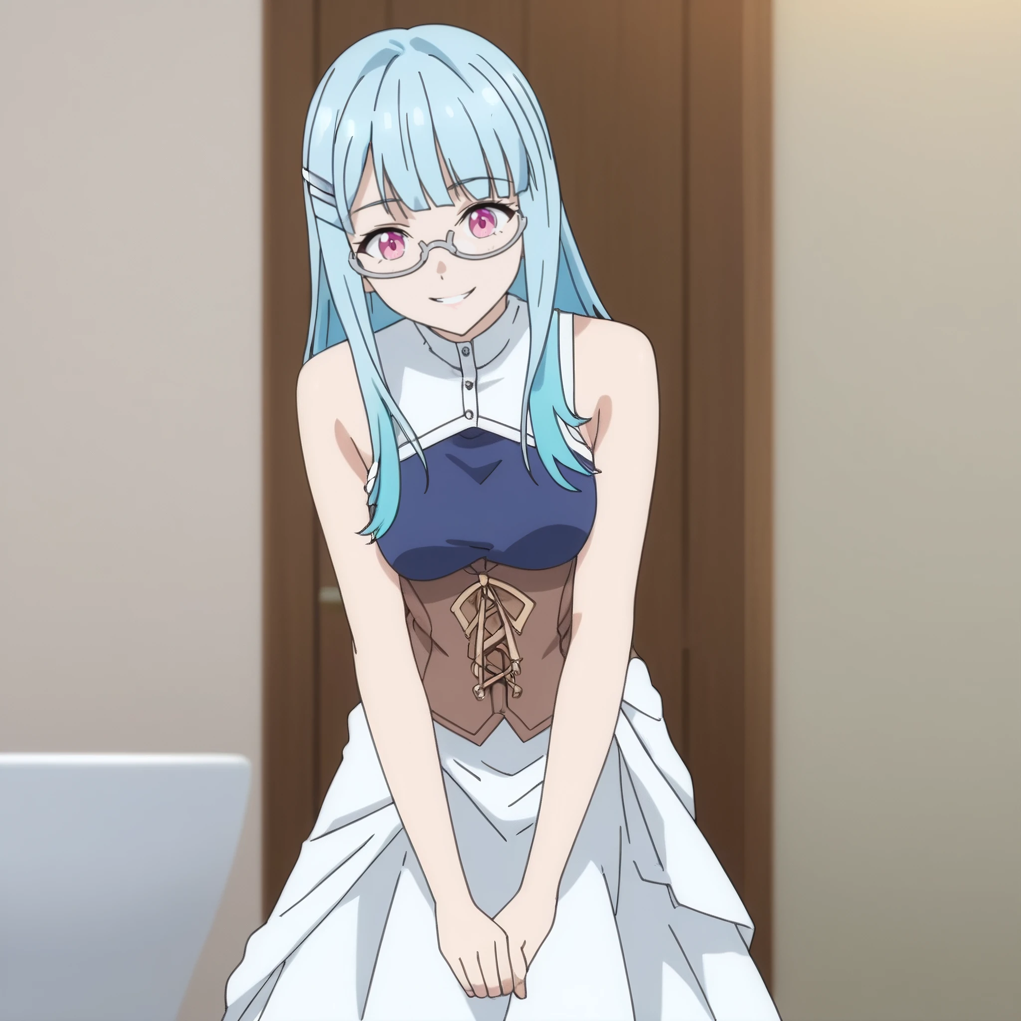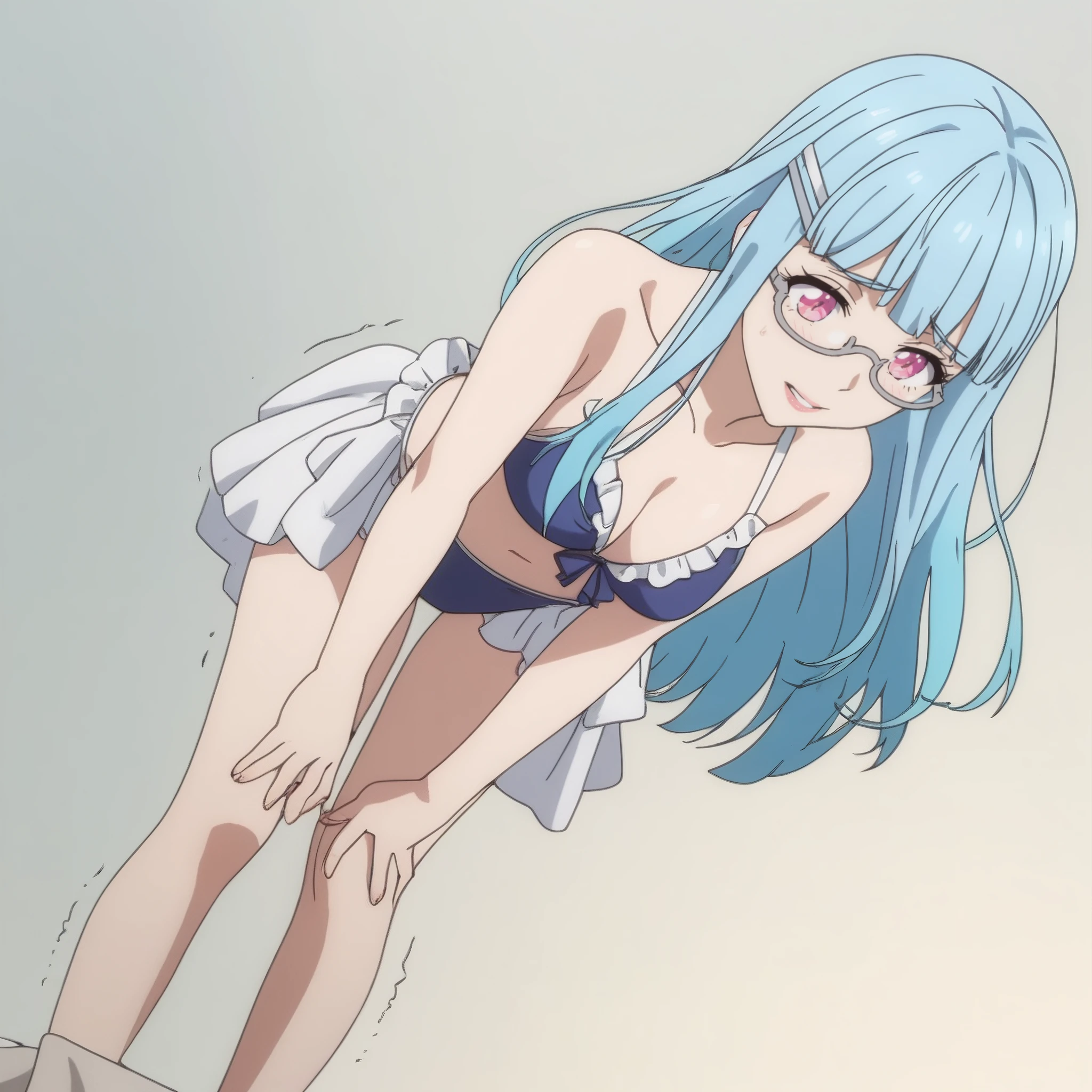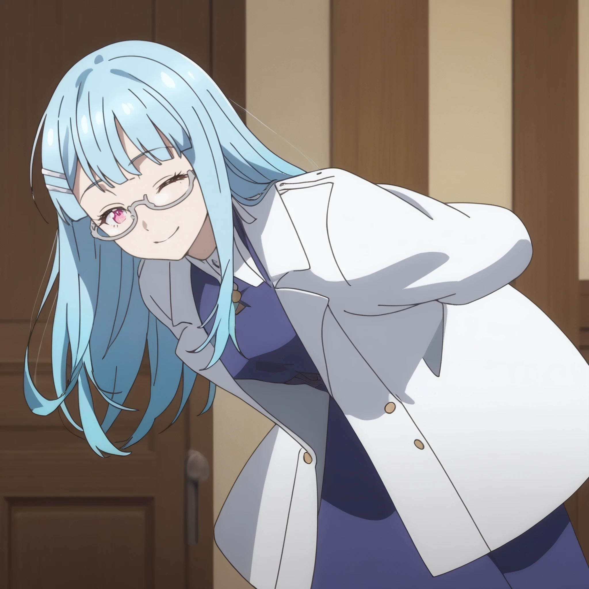 SRASilica, long hair, glasses, hair ornament, hairclip, pink eyes, blue hair, semi-rimless eyewear, grey-framed eyewear, blunt bangs, sidelocks,