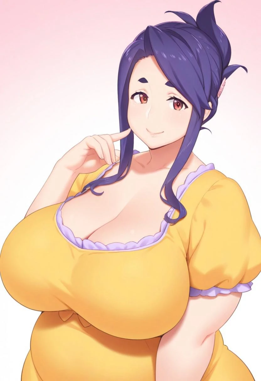 folded ponytail, blue hair, red eyes, dress, mature female,