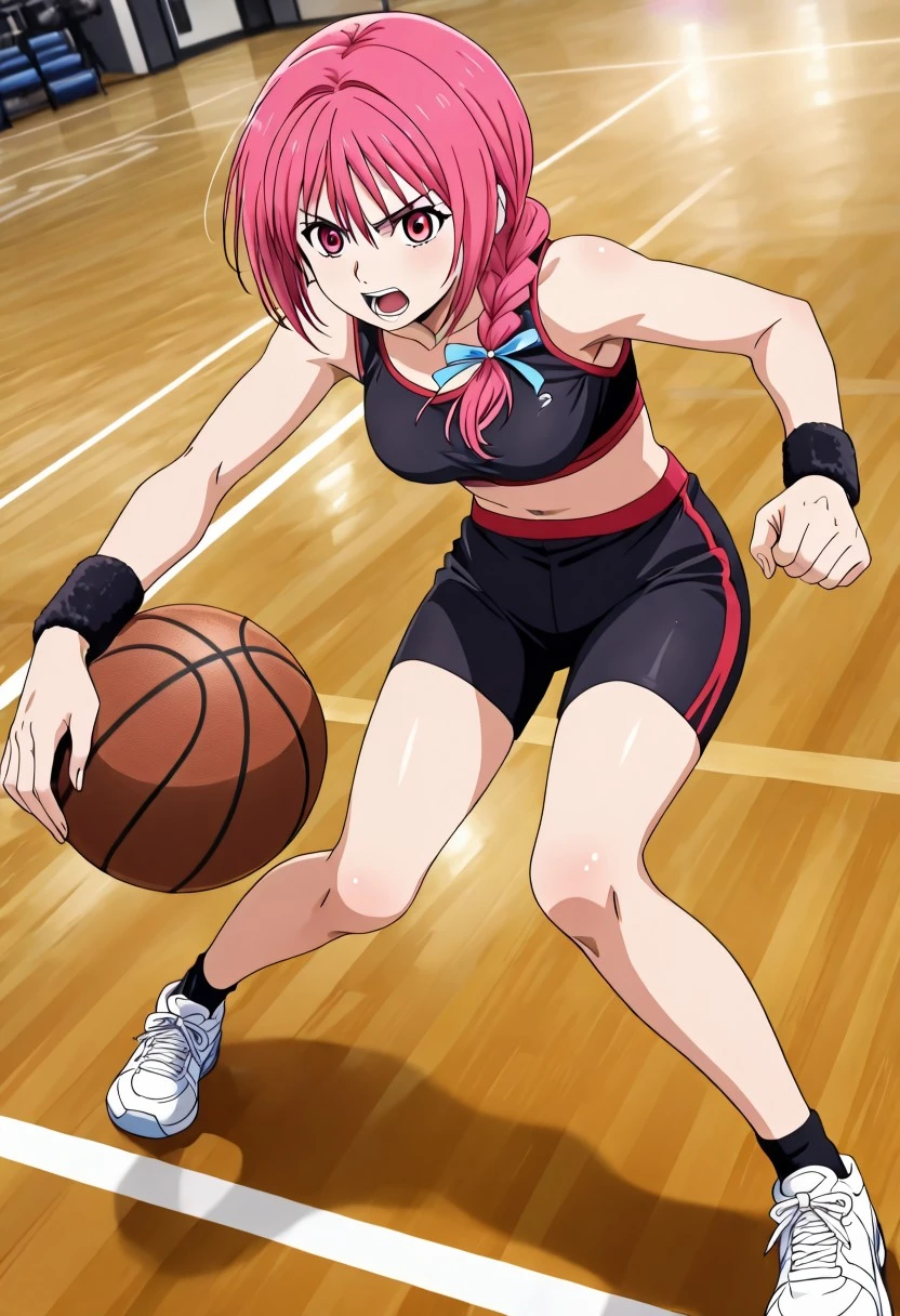 basketball blue uniform, bare shoulders, blue shorts, wristband