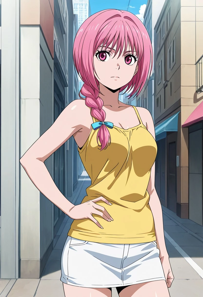 Character: 1 girl, solo, Cha-che, pink eyes, pink hair, hair between eyes, braided hair, blue ribbon hair,