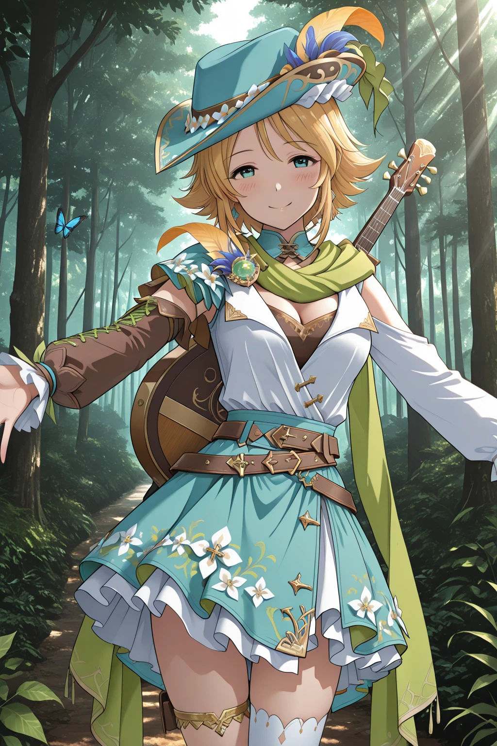 ssr1dress, tricorne, hat flower, hat feather, earrings, brooch, green gem, green scarf, white shirt, cleavage window, (asymmetrical sleeves, single brown sleeve, single tight sleeve, cross-laced sleeve:1.2), criss-cross strings, multiple belts, floral print skirt, layered skirt, single thighhigh, single kneehigh, white legwear, asymmetrical legwear, thighlet, ankle cuffs, white shoes, high heels,