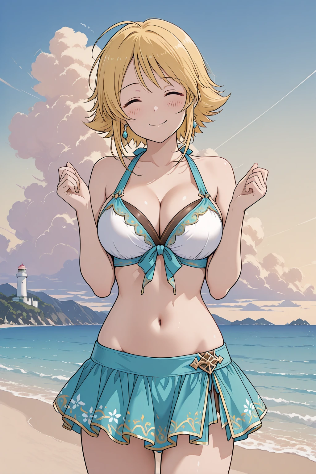 cgotoha, aqua eyes, blonde hair, short hair, sidelocks, ahoge, In addition, this lora is trained on her first SSR. The trigger is ssr1dress. The ensemble: