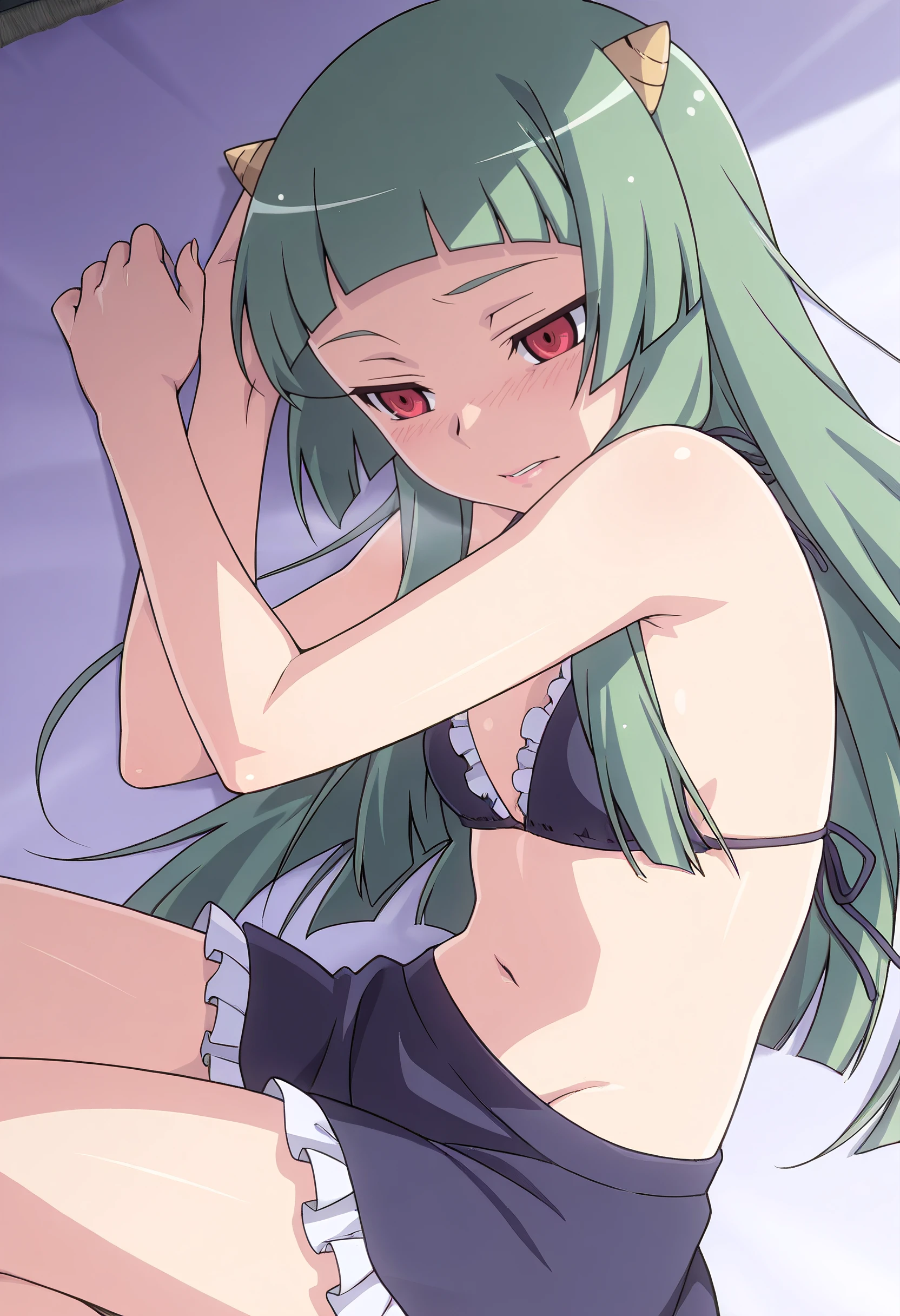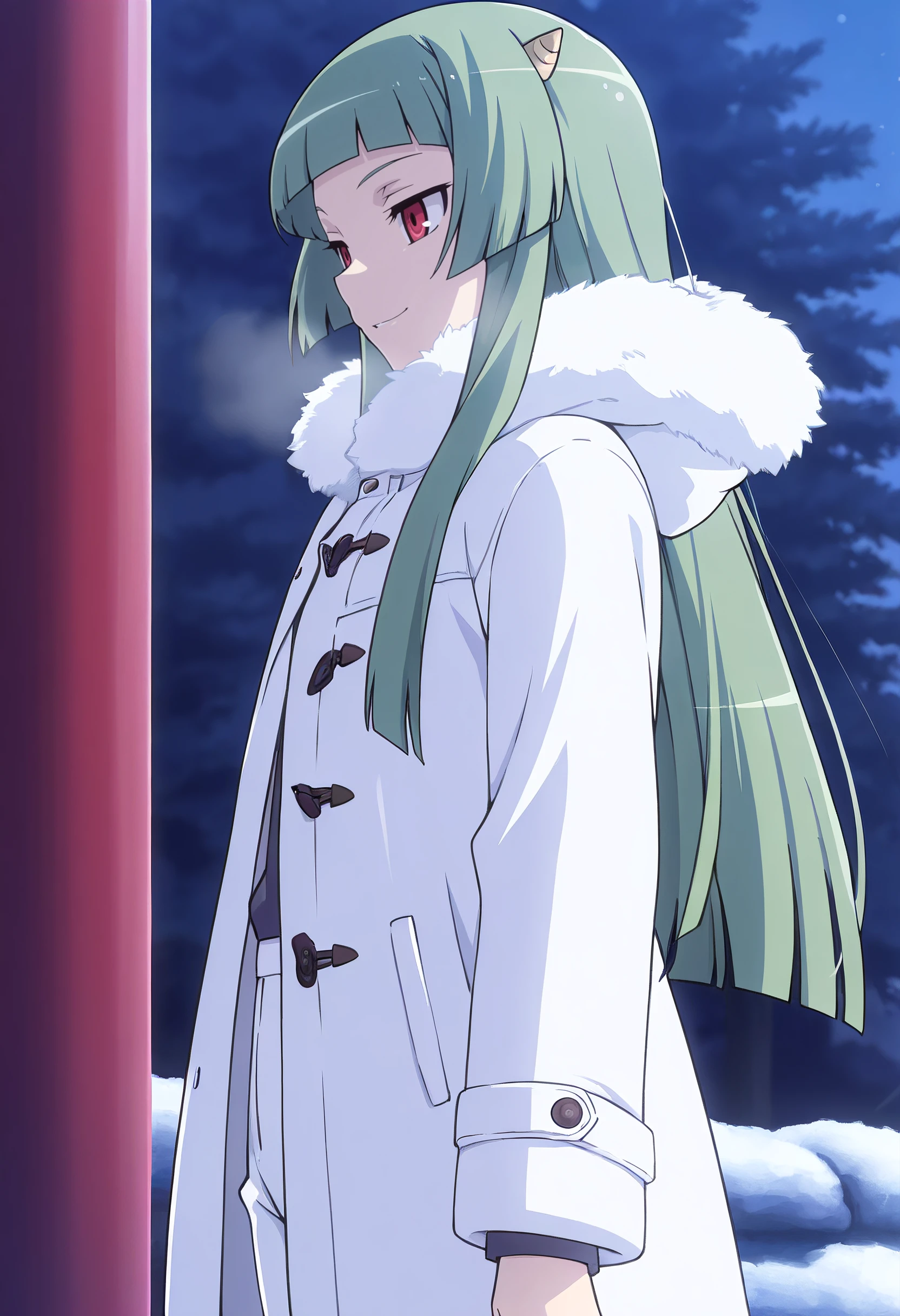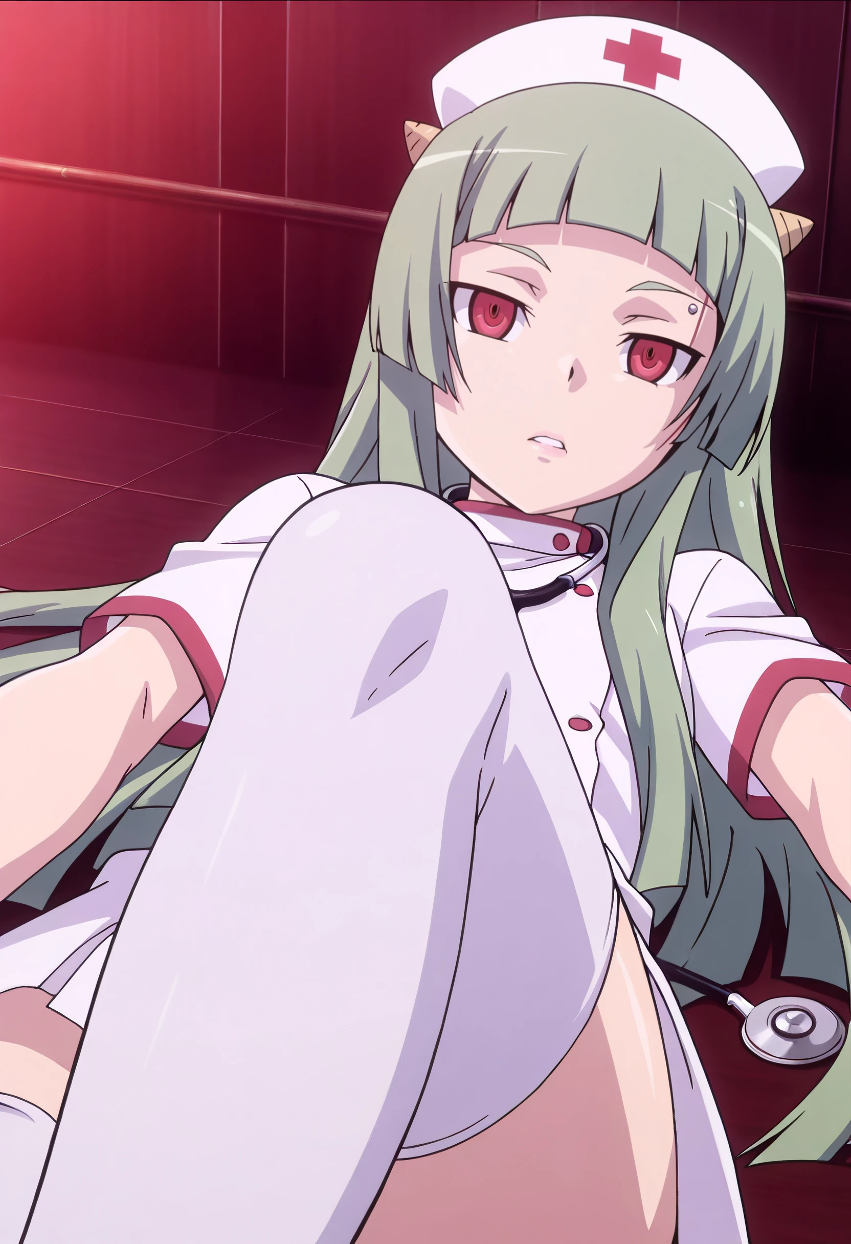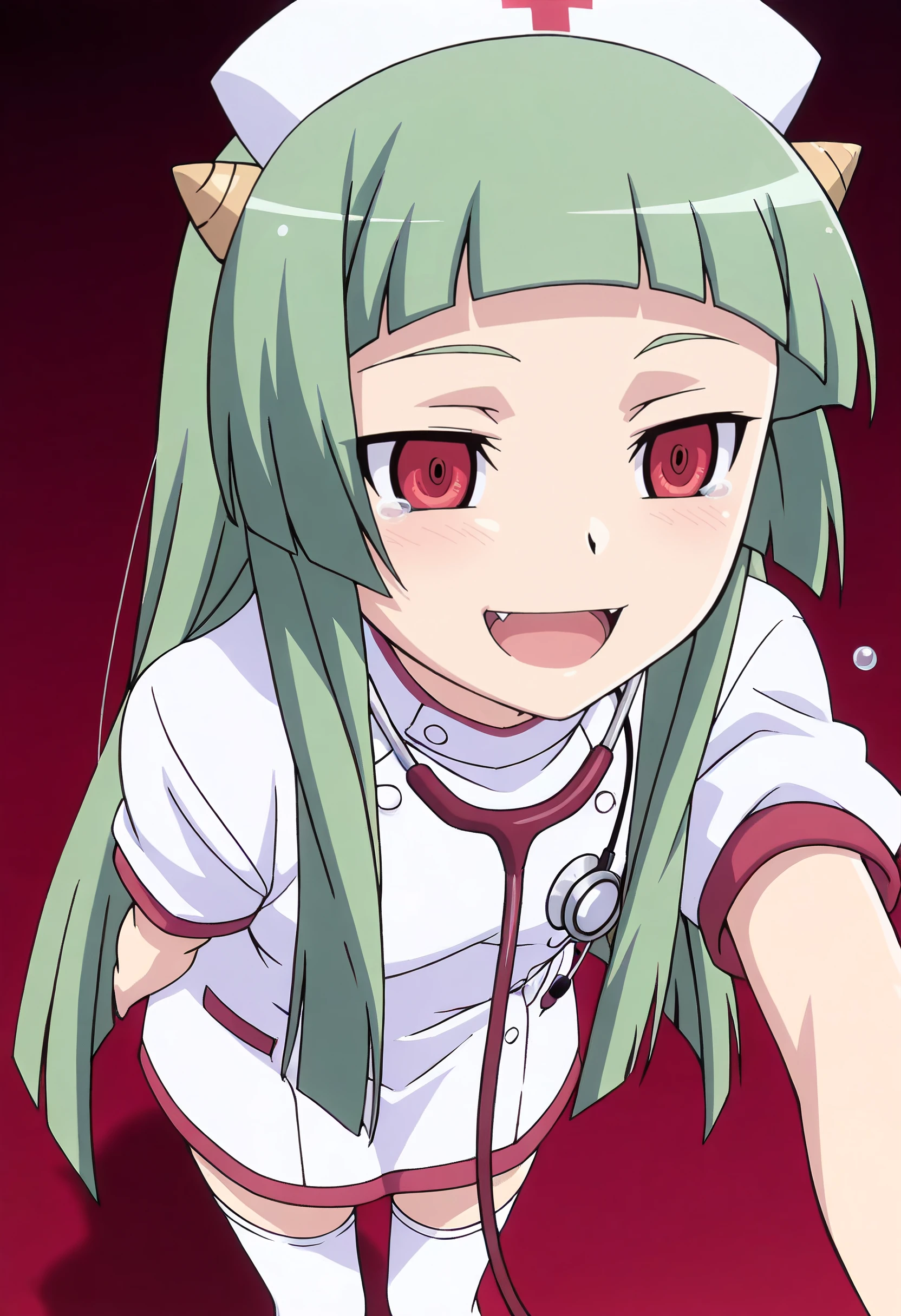 KNZLune, long hair, red eyes, green hair, blunt bangs, hime cut, horns, oni, oni horns,