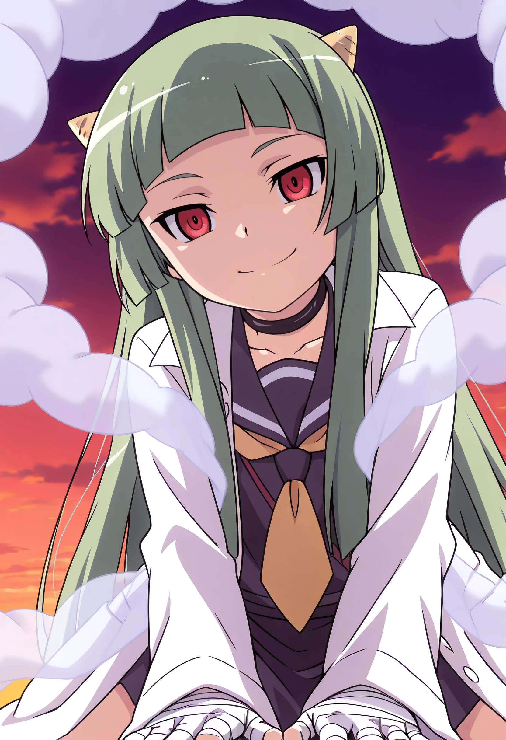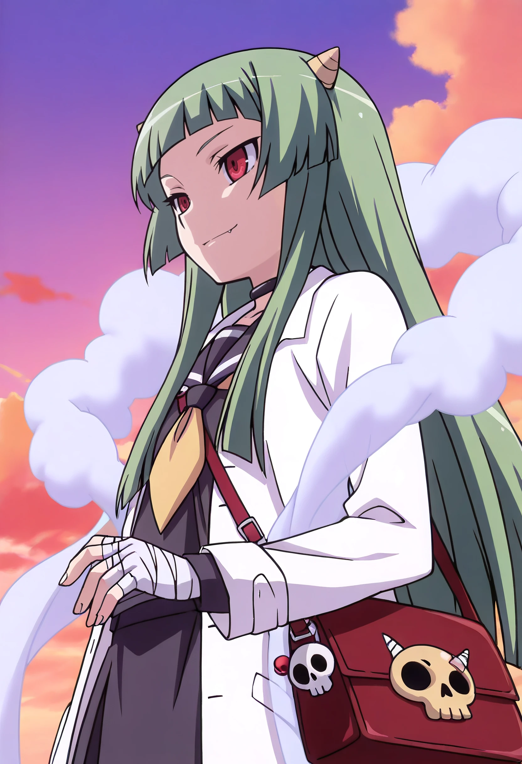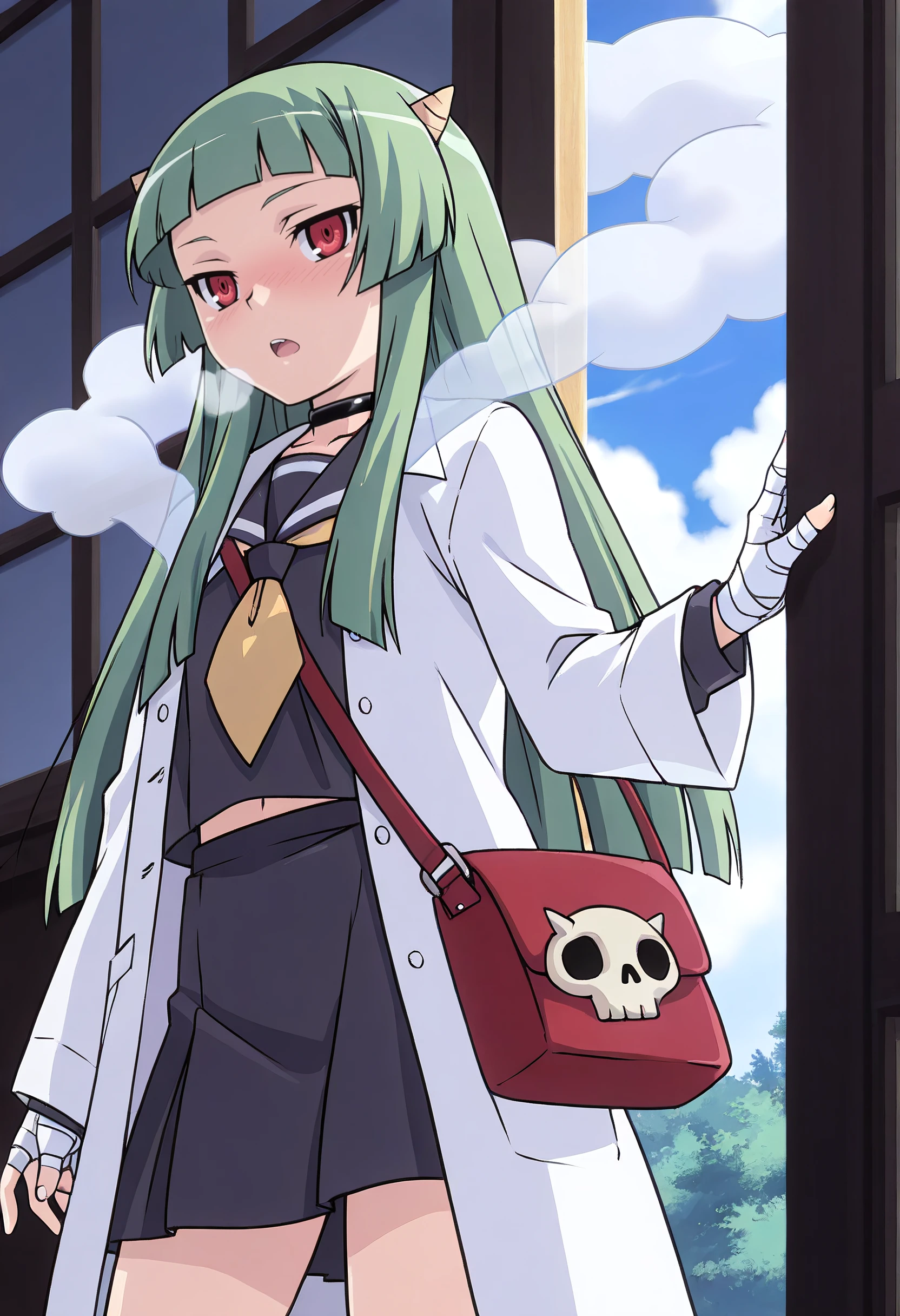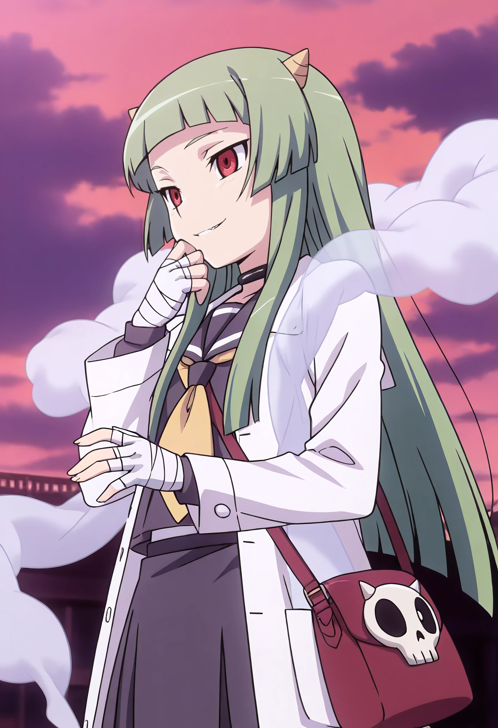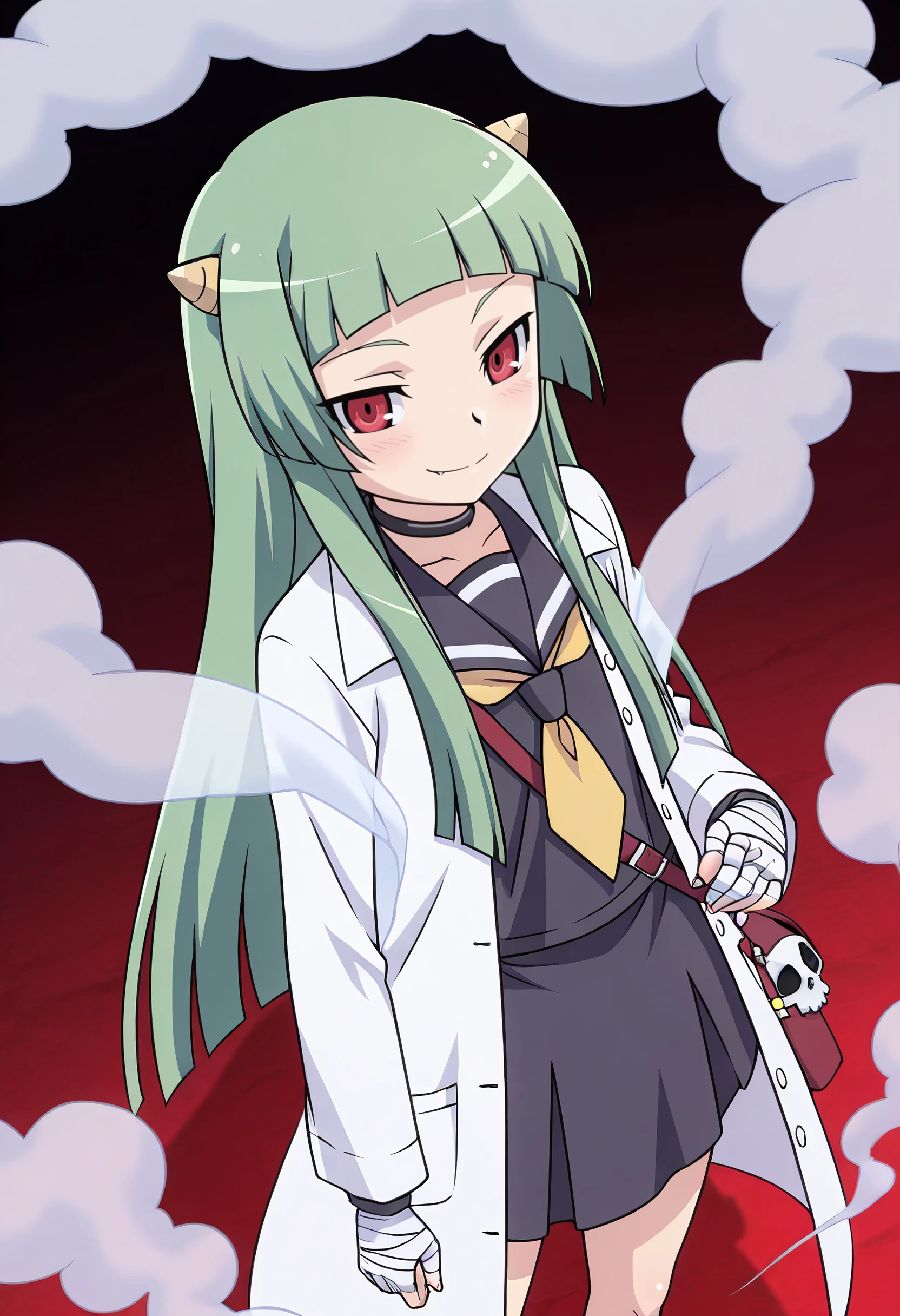 LuneStandard, school uniform, choker, serafuku, lab coat, sailor collar, bandages, bandaged hand, neckerchief, long sleeves, coat, black serafuku, necktie, shawl, skirt, white coat, open clothes, shirt, yellow necktie, bandaged fingers, black shirt, black skirt, smoke, cloud,