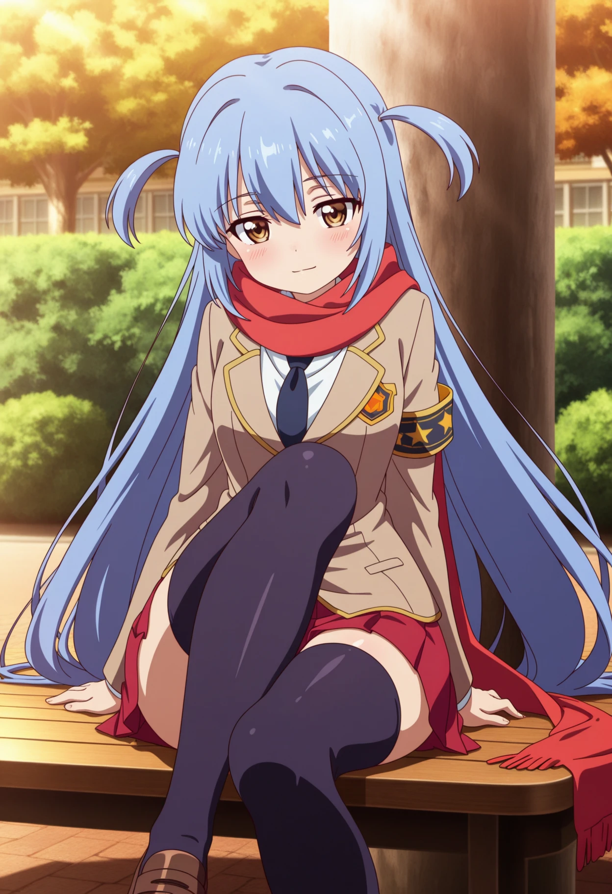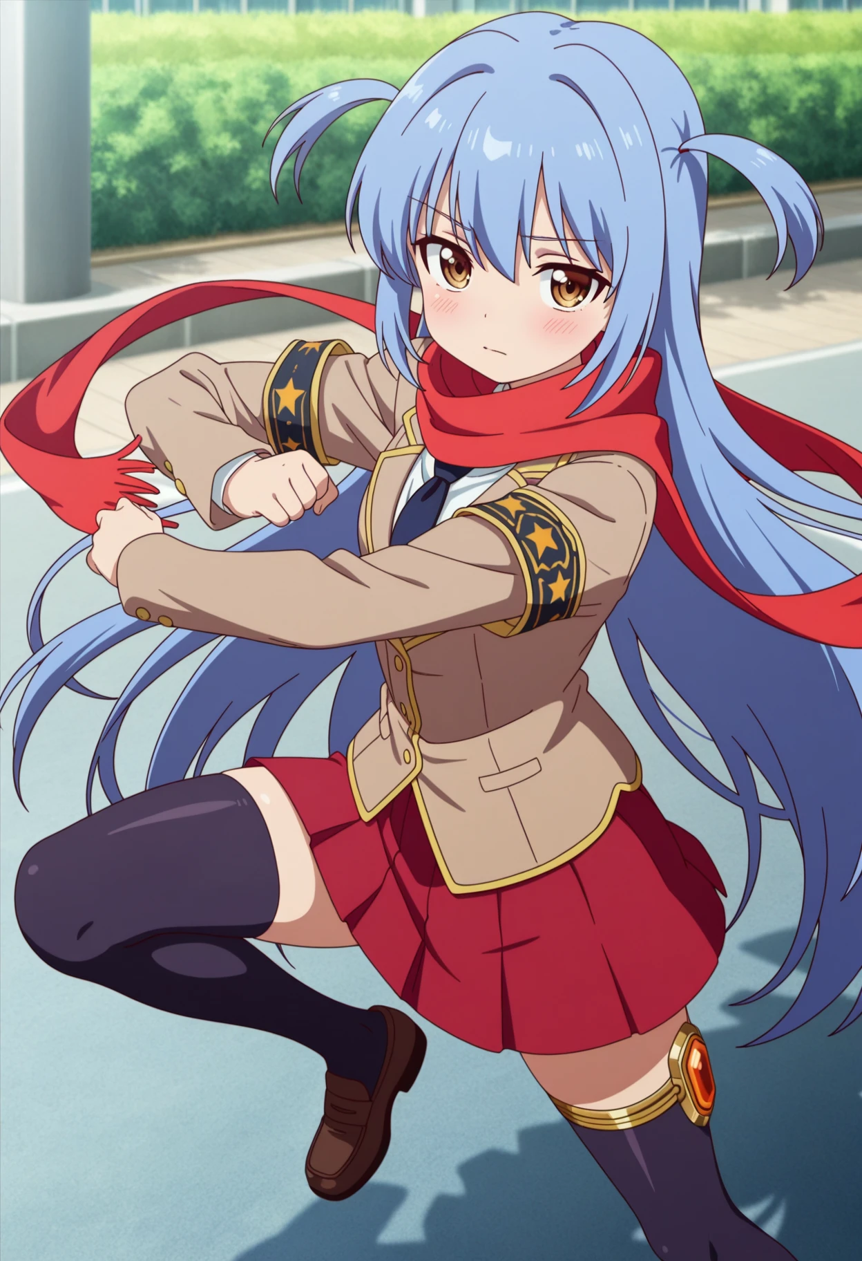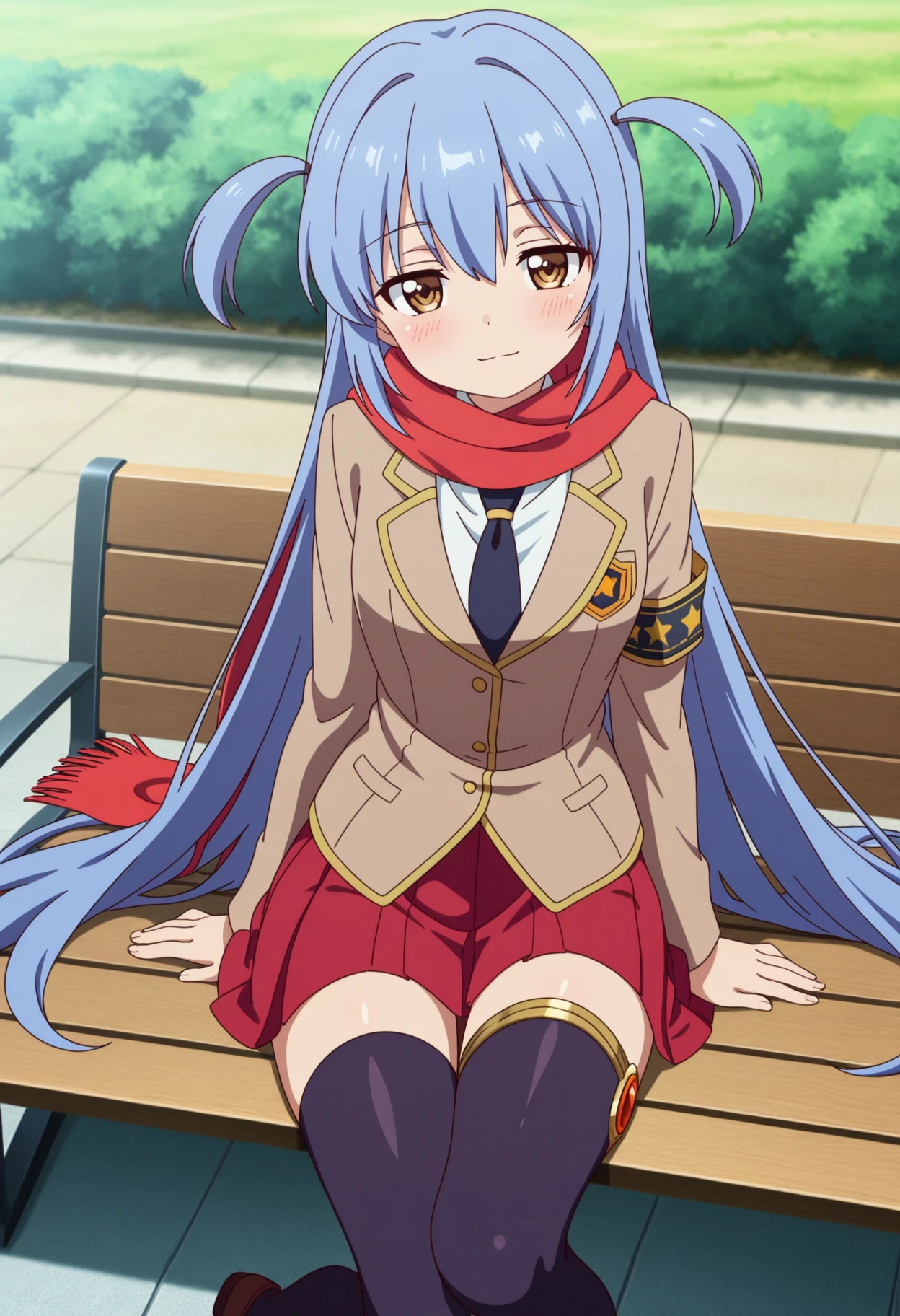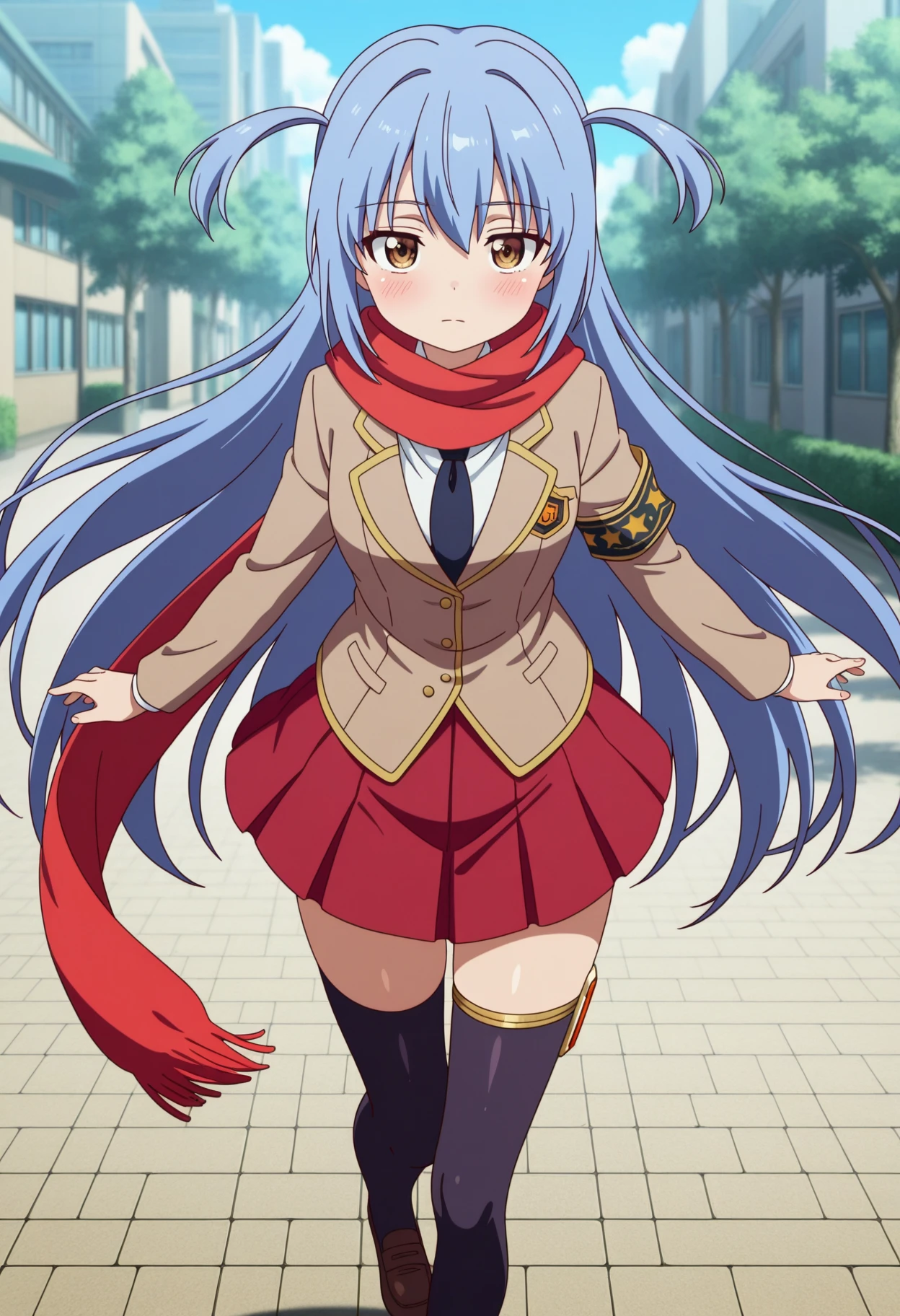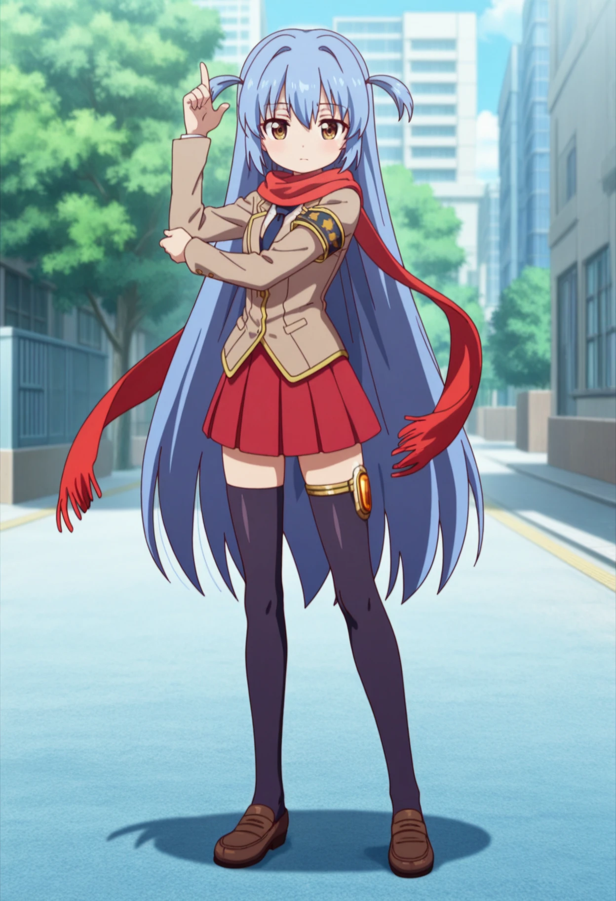 ichikawa_aoi_(nijiyome_gakuen_z-cune_aoi), blue long hair, two side up, brown eyes,blue very long hair school uniform, red scarf, armband, necktie, blazer, jacket,red pleated skirt,zettai ryouiki,loafers,