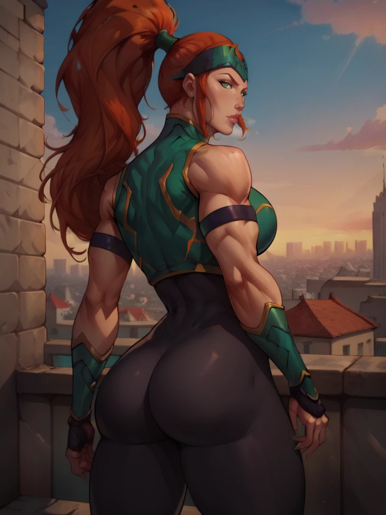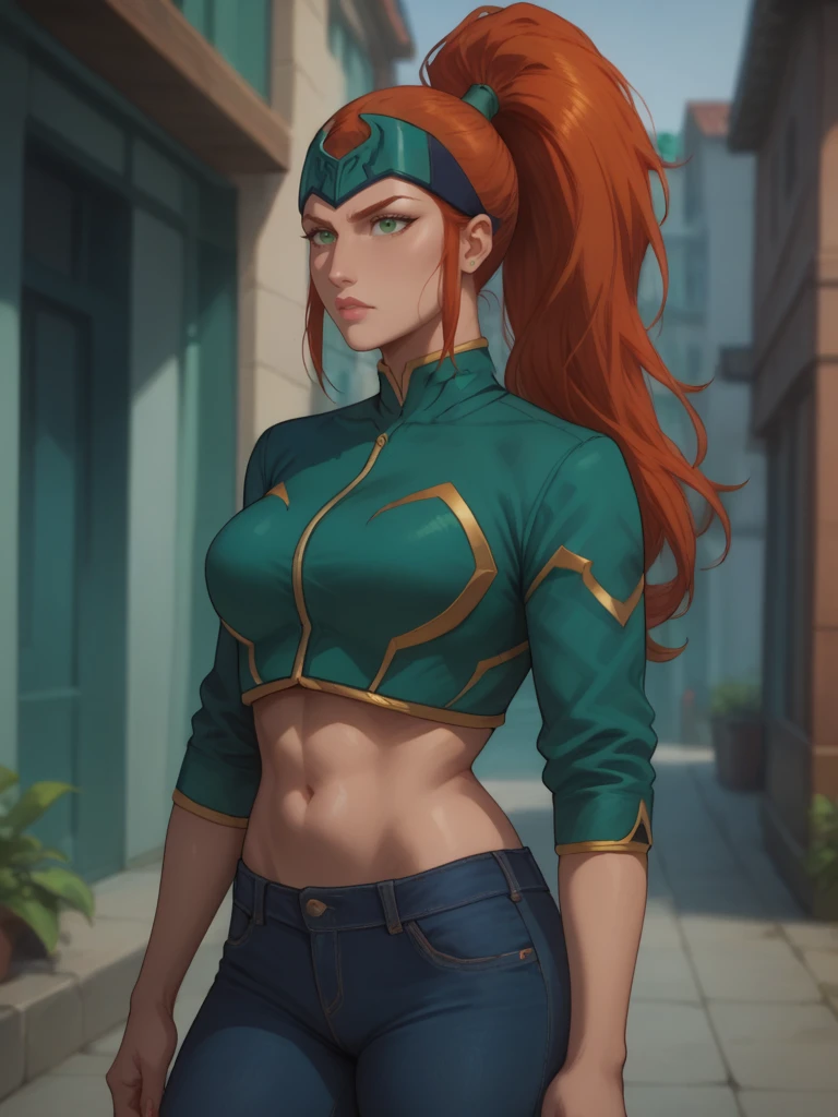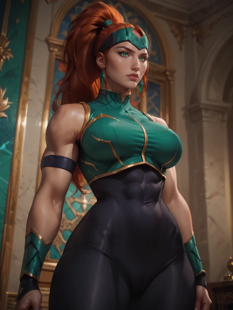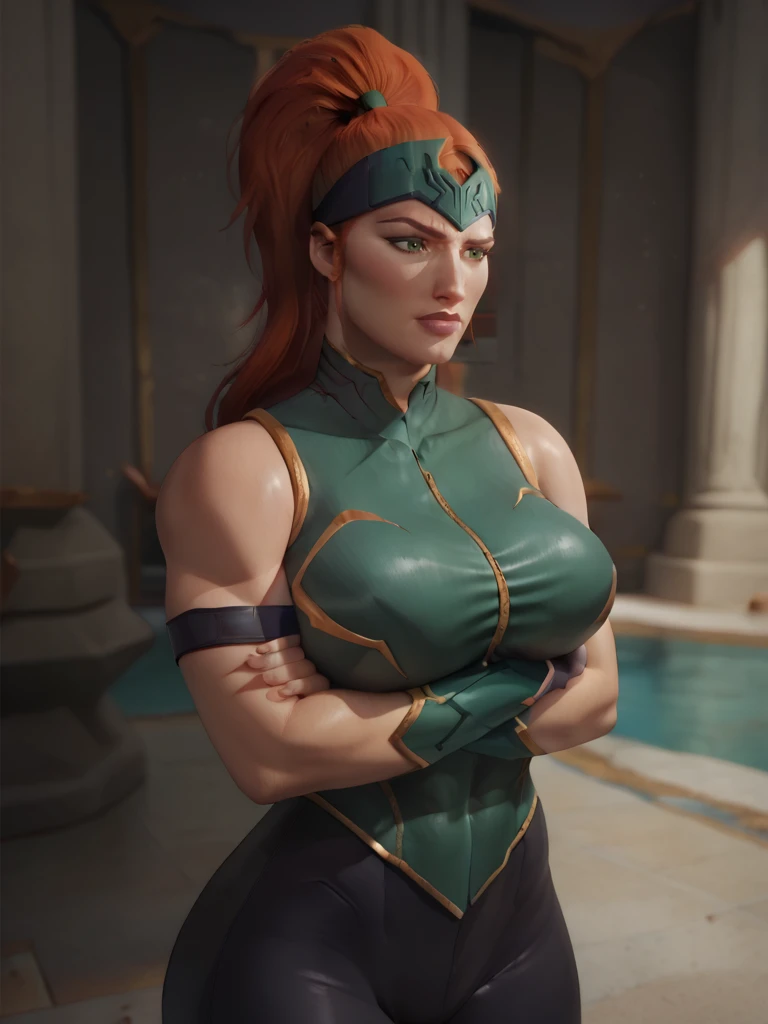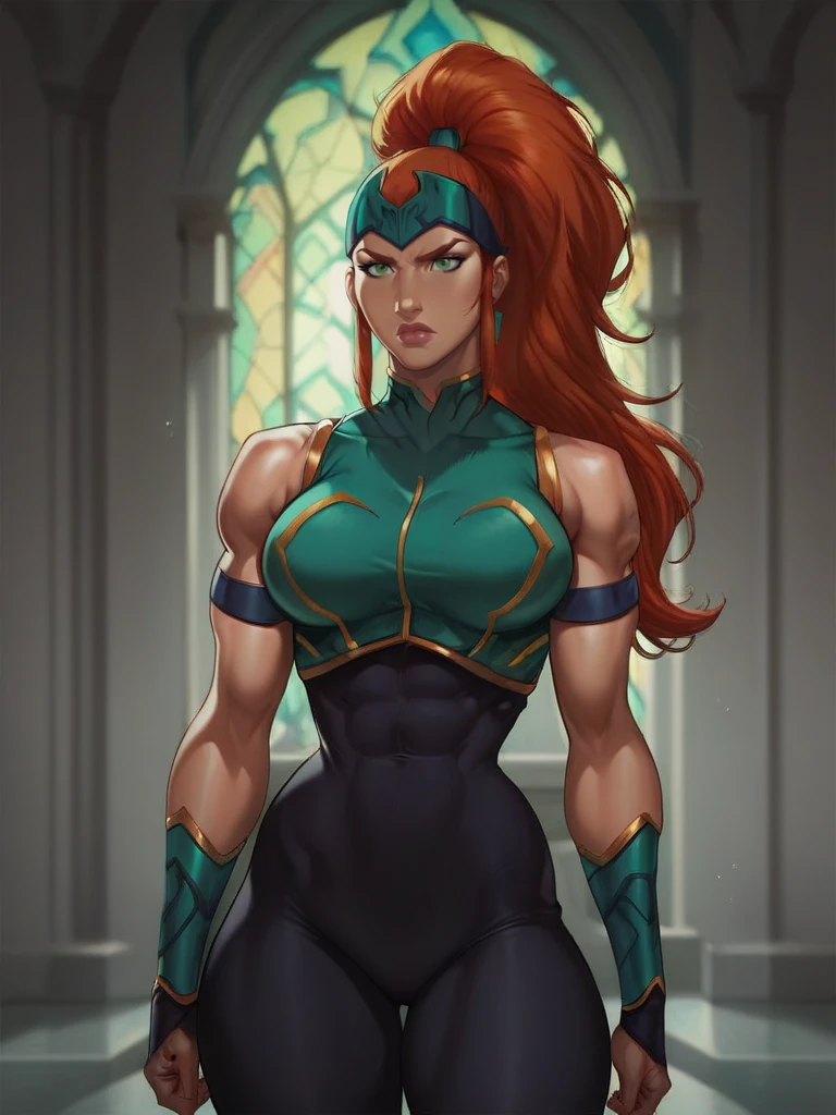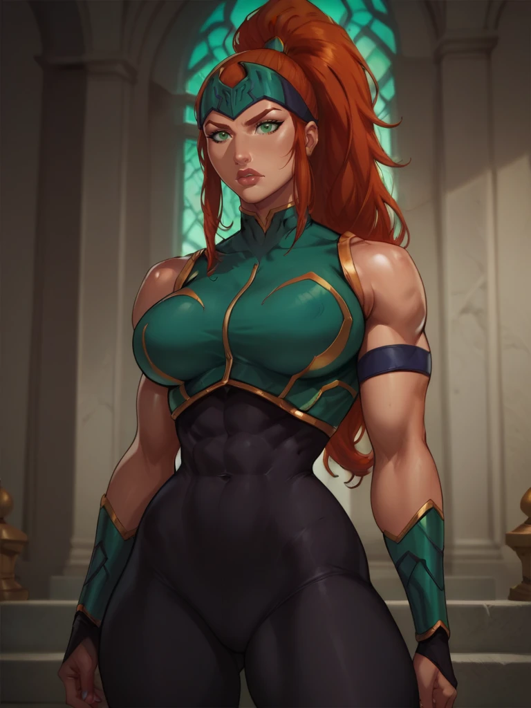 Mera, 1girl, forehead protector, green eyes, red ginger hair, high ponytail, top, bodysuit, armlet, bracers, boots, fingerless gloves, bare shoulders
