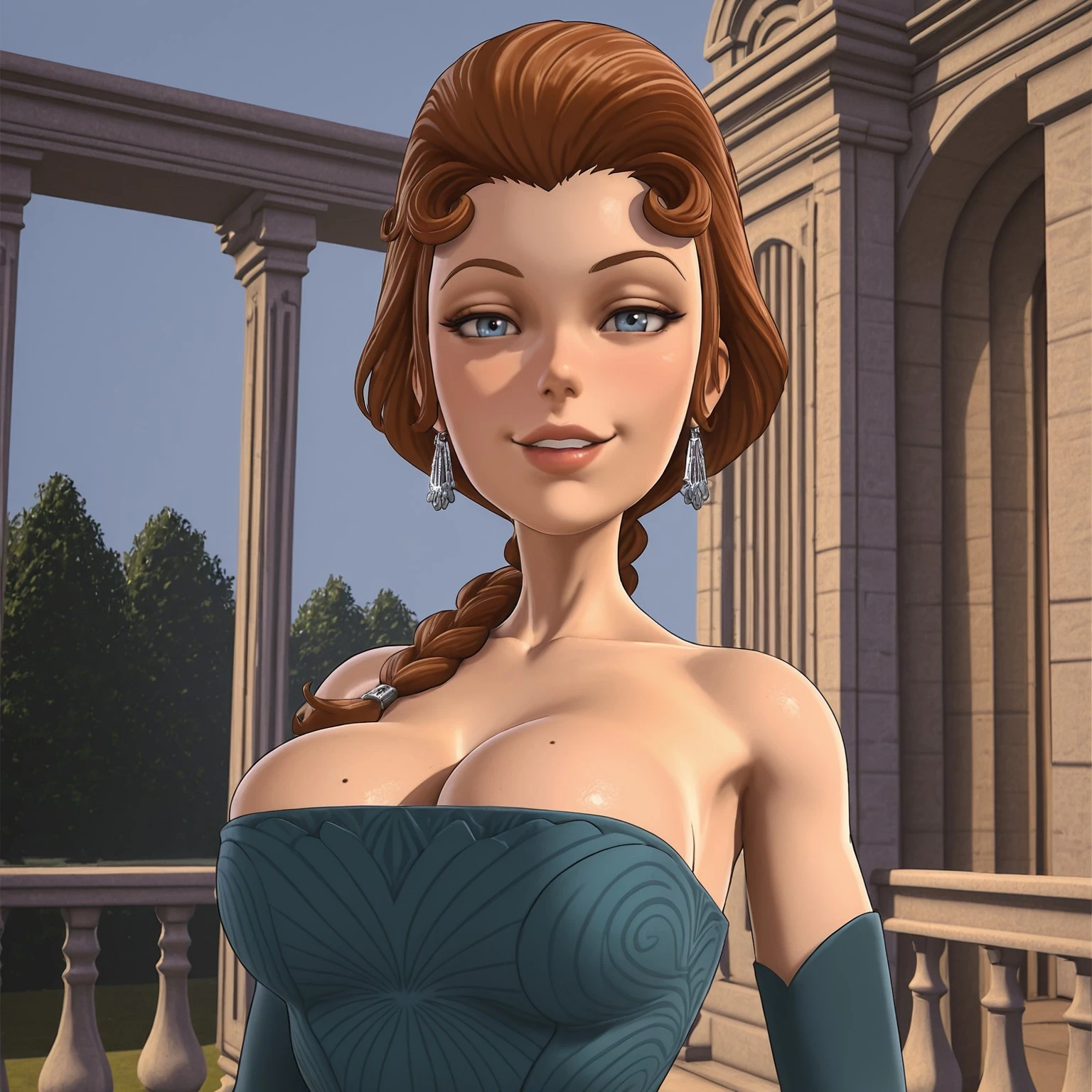 theladyagd, mature busty female, female with thin waist, blue eyes, brown hair with rear braid, single mole above lip, single mole on left breast, lipstick, thick lips, blue dress strapless, blue elbow gloves, silver earrings, silver rear hair ornament