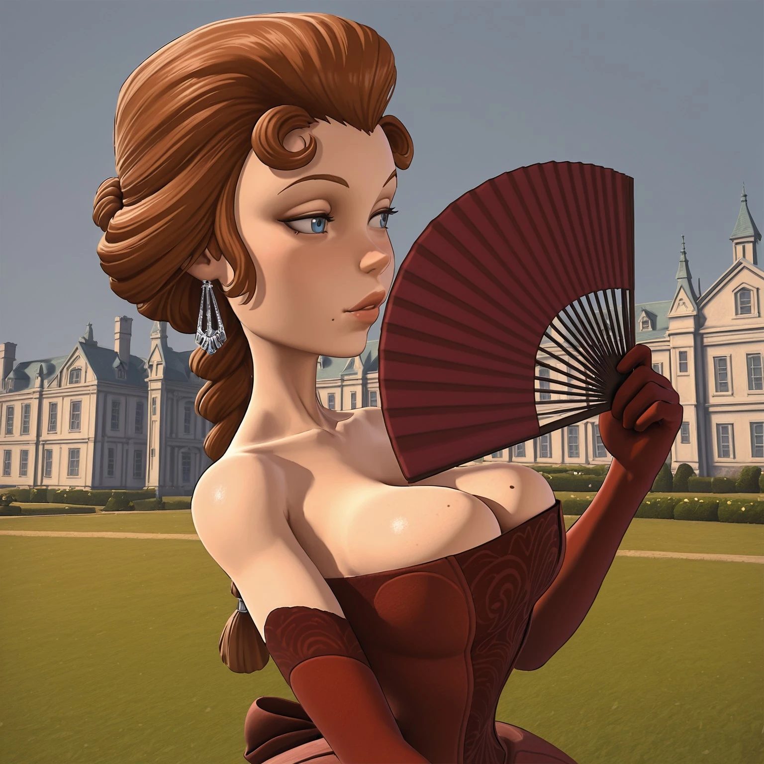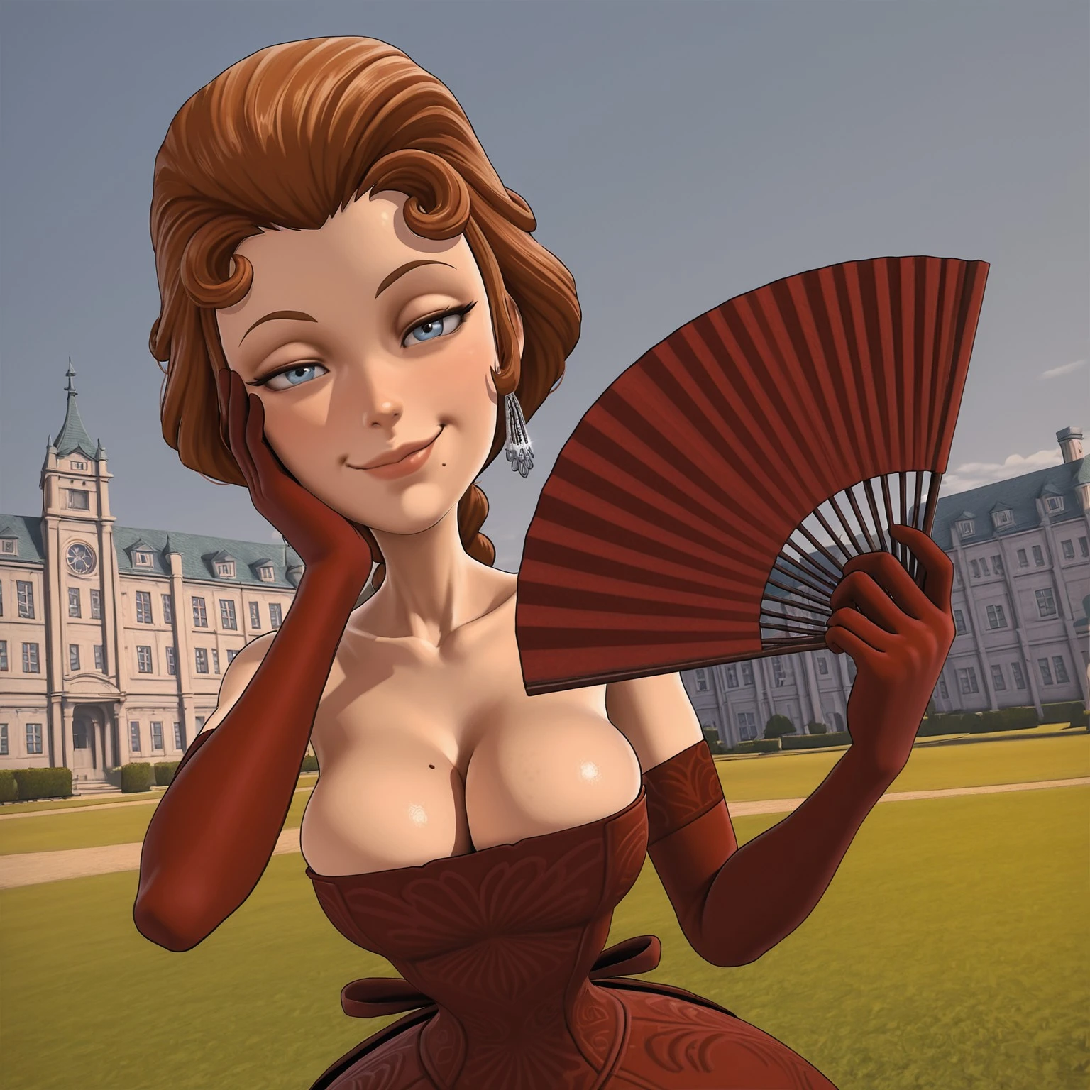 theladyagd, mature busty female, female with thin waist, blue eyes, brown hair with rear braid, single mole above lip, single mole on left breast, lipstick, thick lips, red strapless dress, red elbow gloves, silver earrings, silver rear hair ornament