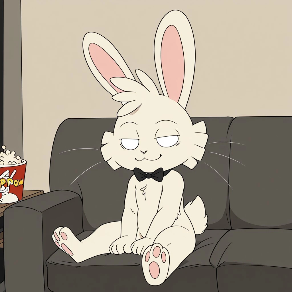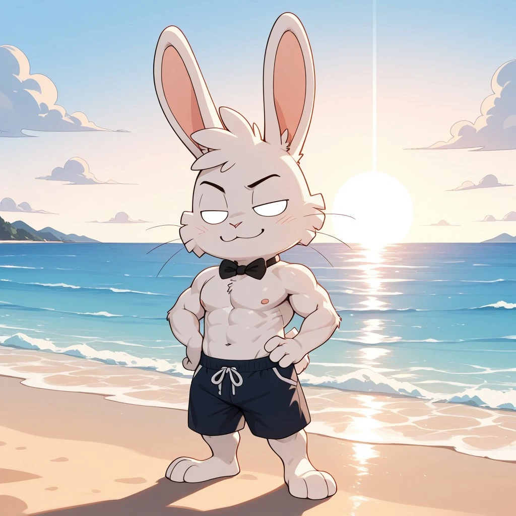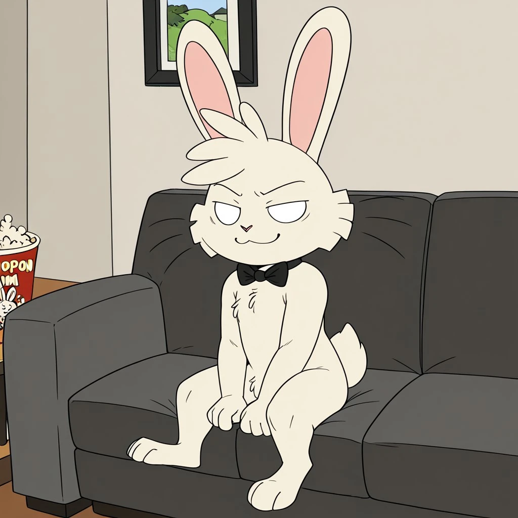 rabbit, rabbit boy, white fur, blank eyes, rabbit ears, pink nose, whiskers, rabbit tail, shortstack, black bowtie,