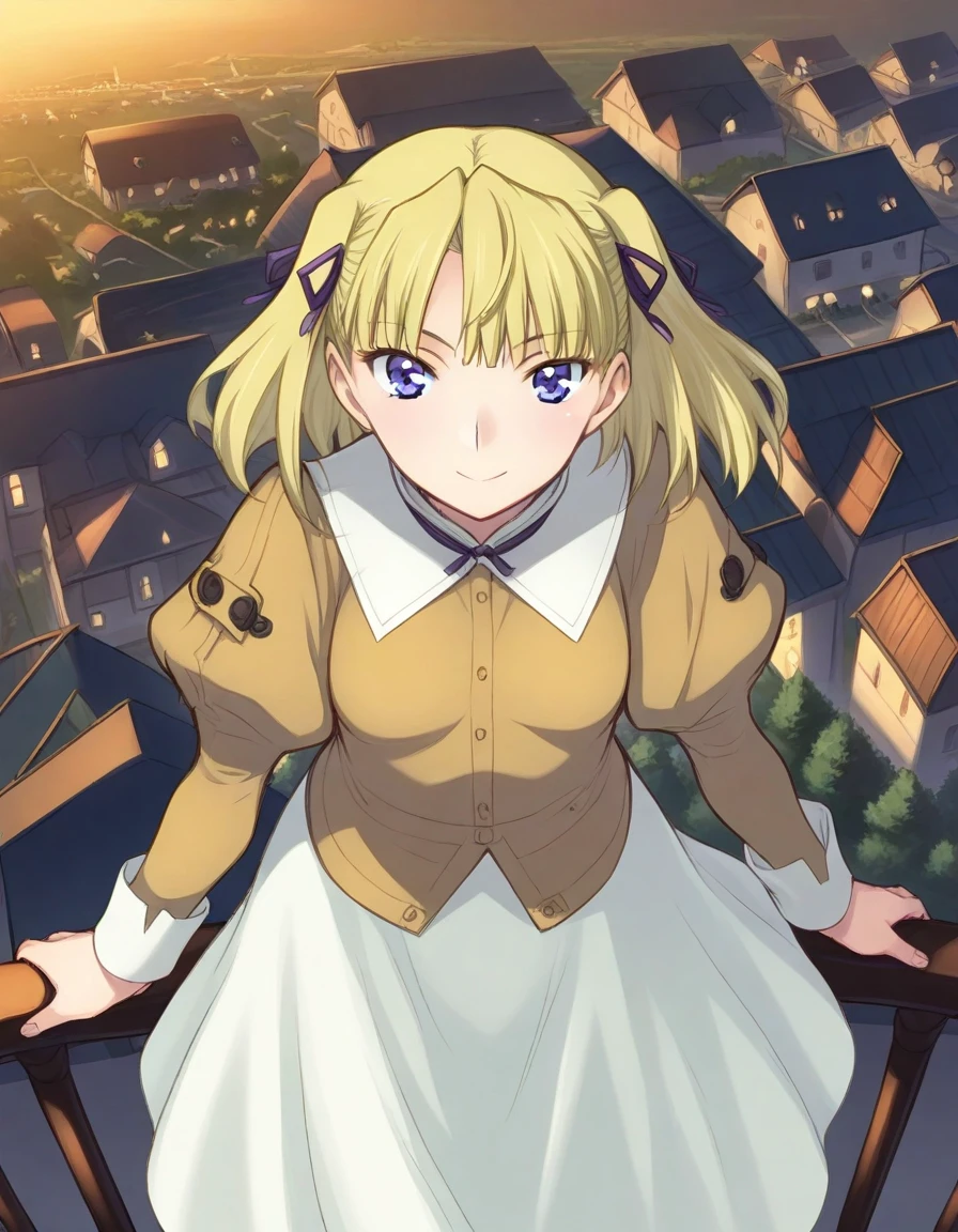 two side up, long sleeves, brown short dress, puffy sleeves, white skirt