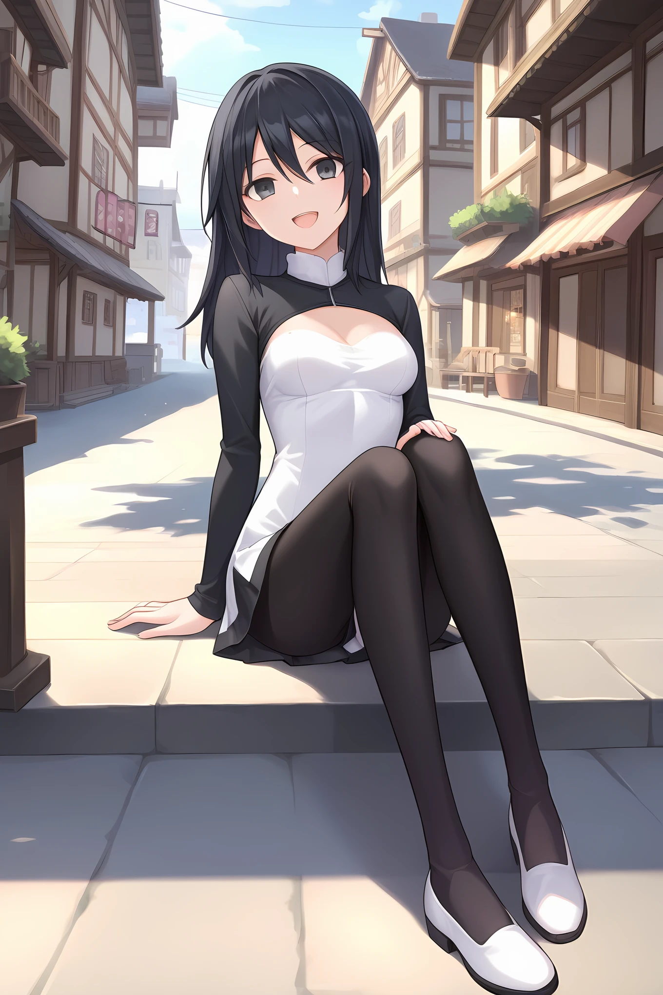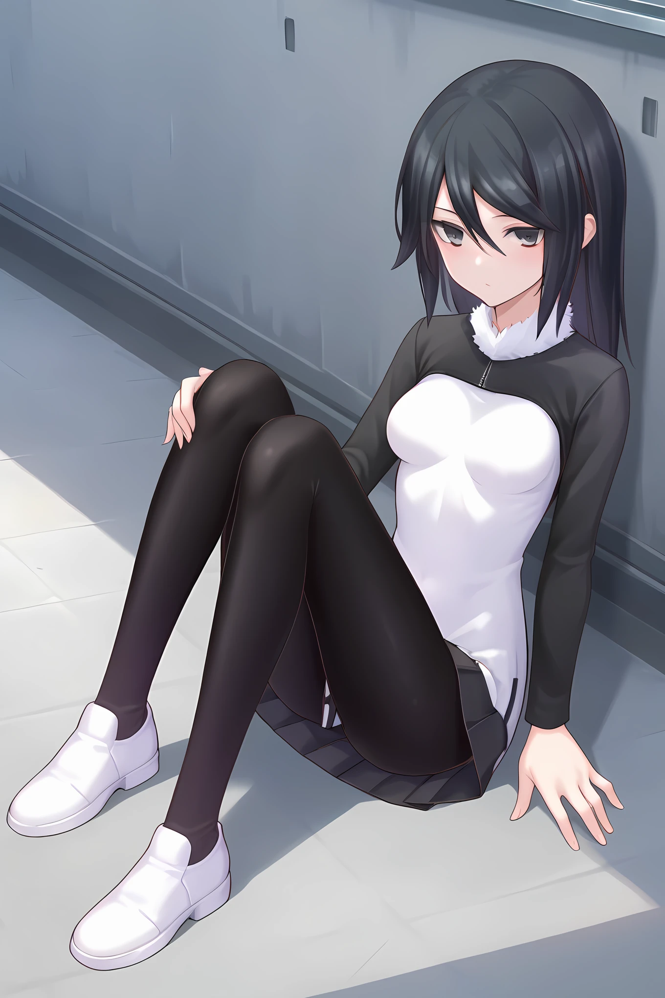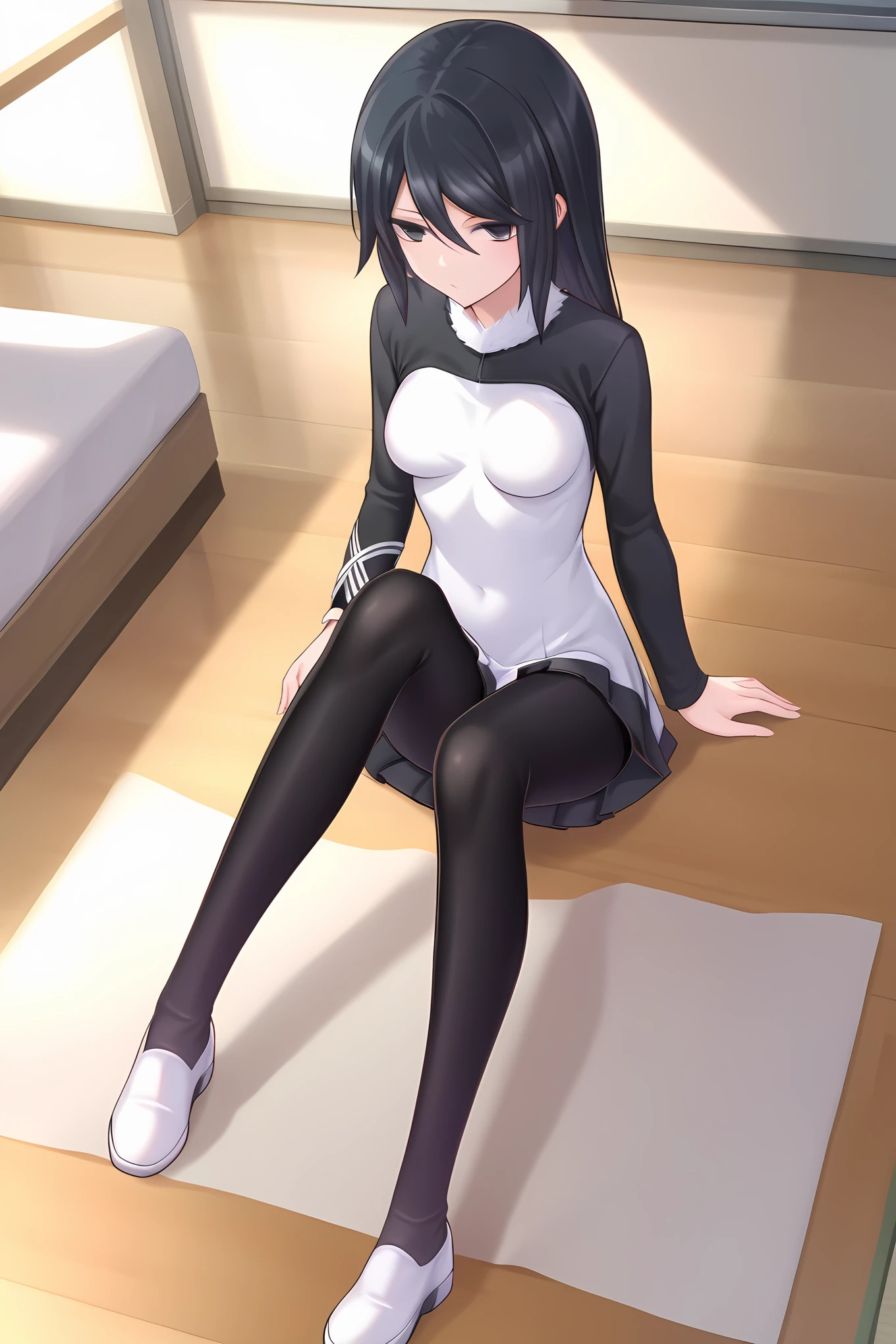 white dress black dress two-tone dress black sleeves raglan sleeves short dress black leggings white shoes fur collar